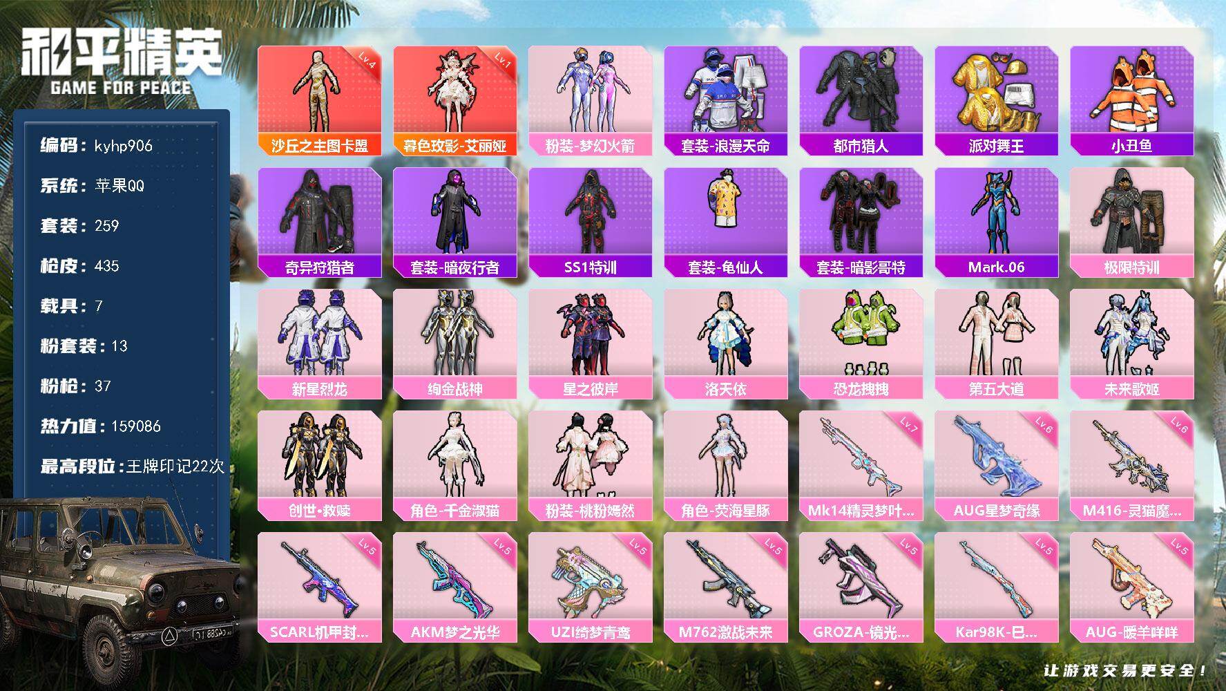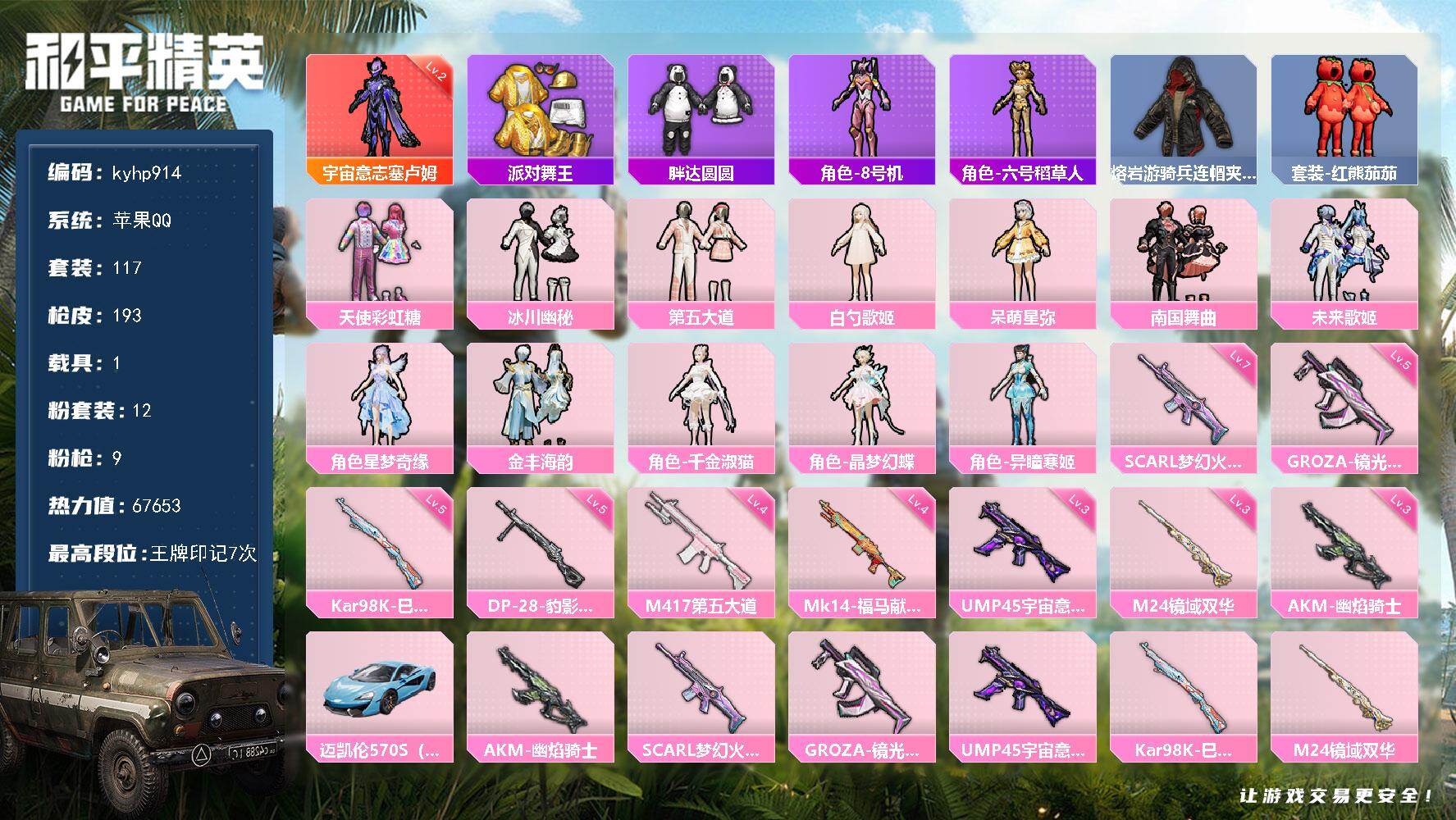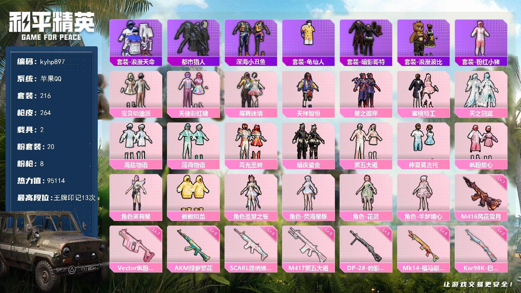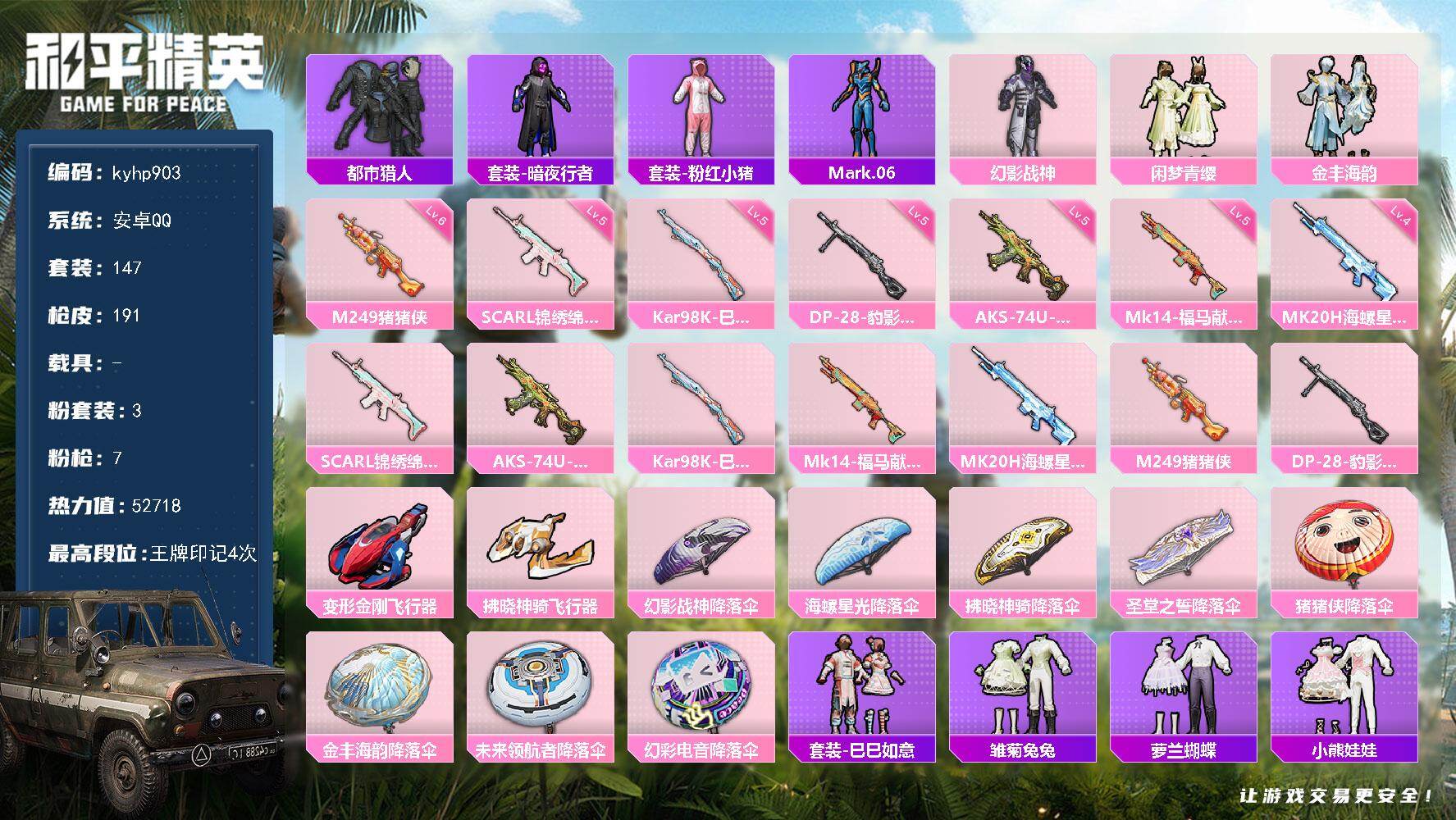 PX_2548788--3粉装-7特效枪-0载具-2粉色飞行器-52718热力值-4王牌印记-147套装-191枪皮 【热门品类】:套装-都市猎人,套装-暗夜行者,套装-粉红小猪,角色-Mark.06 【粉色套装】:粉装-幻影战神,粉装-闲梦青缨,粉装-金丰海韵 【粉色枪皮等级】:SCAR-L-锦绣绵绵(五级),AKS-74U-森灵之息(五级),Kar98K-巳巳如意(五级),Mk14-福马献瑞(五级),
