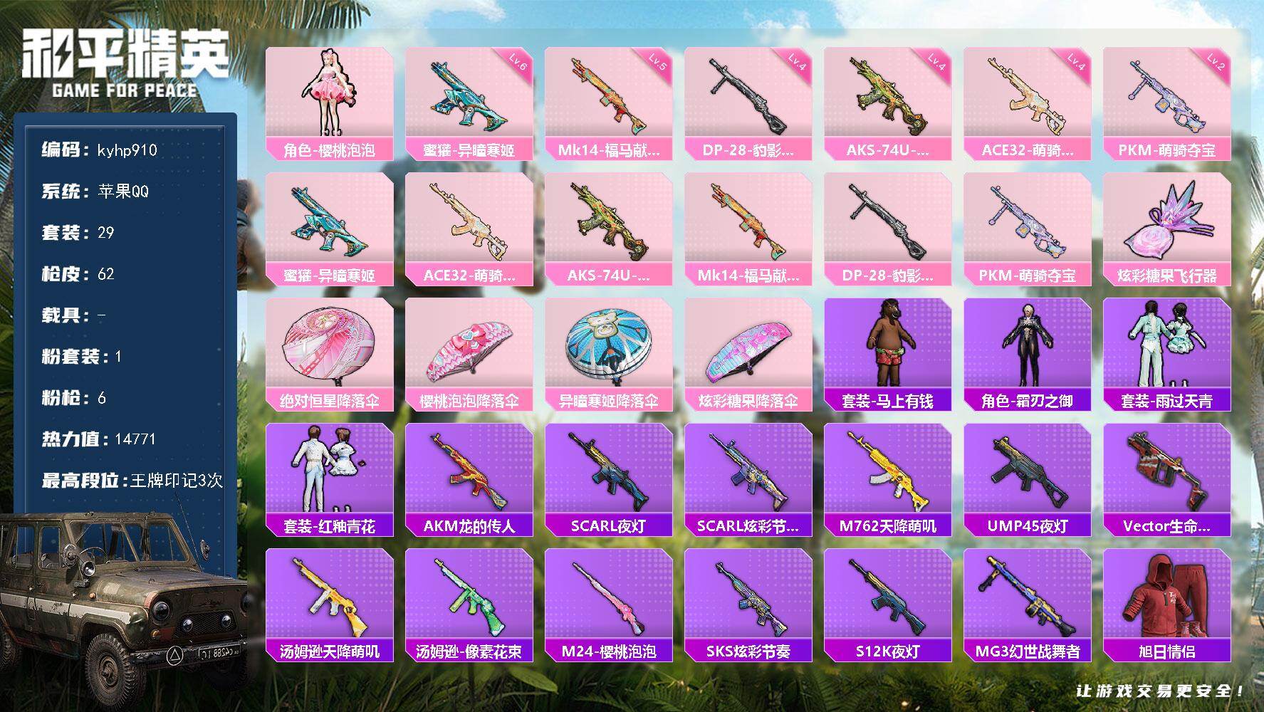 PX_2531111-把手枪,1粉装5特效,幻影战神】苹果手Q-1粉装-5特效枪-49套装-72枪皮-4王牌印记-卓越王牌7星-19523热力值【1粉装】幻影战神【5特效枪】UMP45-萌骑冒险[2级],Mk14-福马献瑞[5级],AA12-G-萌骑幻想[3级],DP-28-豹影疾电[5级],Mk14-甜梦熊击[5级]【3飞行器】异域银装飞行器,马上有福飞行器,狂鲨锋刃飞行器【1头盔】幻影战神头盔【1背包】幻