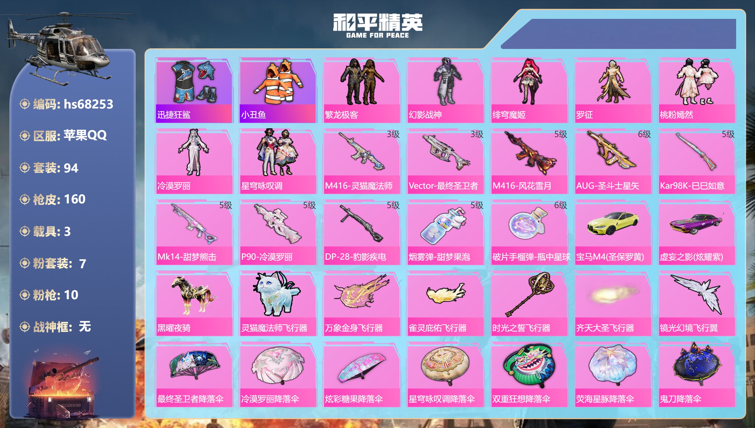 PX_2551261-,苹果手Q-11王牌印记-7粉装-10特效枪-3载具-50829热力值-94套装-160枪皮-3卓越印记-2传奇印记 【7粉装】角色-罗征,套装-星穹咏叹调,套装-幻影战神,角色-绯穹魔姬,角色-冷漠罗丽,套装-桃粉嫣然,套装-繁龙极客 【10特效枪】AUG-圣斗士星矢/6级,Mk14-甜梦熊击/5级,DP-28-豹影疾电/5级,Kar98K-巳巳如意/5级,Vector-最终圣卫者/3级,M416-风花雪月/5级,M416-灵猫魔法师/3级,烟雾弹-甜梦果泡/5级,P90-冷漠罗丽/5级,破片手榴弹-瓶中星球/6级 【2稀有紫装】迅捷狂鲨,小丑鱼 【3稀有载具】宝马M4(圣保罗黄),虚妄之影(炫耀紫),黑曜夜骑 【94稀有时装】繁龙极客,幻影战神,绯穹魔姬,罗征,桃粉嫣然,冷漠罗丽,星穹咏叹调,SS38特训,小丑鱼,迅捷狂鲨,红熊茄茄,异域银装,星途旅人,糖霜甜心,鱼渊荷华,青团波波,大橘大利,燕燕于飞,海琴烟,风玲,战术大师,智谋强哥,紫俏灵猫,糖糖葫芦,香桃花海,棉花软糖,时希公主,琴音绮想,乐音,灵公主,极速光影,霓虹热舞,雪绒豹,画境星梦,星影赞美诗,朱霞炽焰,狂鲨锋刃,荒原牛仔,游乐,凌霄紫焰,粉黛兰香,萌鸡速递,小鸟芋圆,元气之梦,书海巡游,诡诞巡游,混沌火种,蜜露汐语,薄荷星砂,云朵鹅,虚空漩涡,顶瓜瓜,雪国风尚,蓝冰羽,恋语绒绒,青翼流星,紫幽梦,SS35特训,SS29特训,SS31特训,SS33特训,SS32特训,SS36特训,龙的传人,潮流炫酷,青玉碎影,SS37特训,湖蓝色名流,绯格组合,SS26特训,漫步者,SS34特训,竞技名士,SS30特训,长空猛禽,街头潮人,魅力单车,幻世战舞者,青涩时光,幻影公爵,狙击之神,鹰眼刺客,冰冻风暴,破蛋小黄鸡,蓝彩潮人,超能勇士,海岛探路者,SS27特训,玉兔迎春,缤纷果语,王牌教练,柠萌假日,粉红小猪,SS25特训 【158稀有枪械】M416-灵猫魔法师/3级,Vector-最终圣卫者/3级,M416-风花雪月/5级,AUG-圣斗士星矢/6级,Kar98K-巳巳如意/5级,Mk14-甜梦熊击/5级,P90-冷漠罗丽/5级,DP-28-豹影疾电/5级,烟雾弹-甜梦果泡/5级,破片手榴弹-瓶中星球/6级,MK20-H-乌木金纹,AWM-宁雨蝶,Win94-乌木金纹,MK12-乌木金纹,SVD-冷漠罗丽,撬棍-冷漠罗丽,AKM-灵猫魔法师,PKM-紫幽梦,汤姆逊-灵猫魔法师,撬棍-灵猫魔法师,MG3-霓彩脉冲,DBS-幻彩电音,ACE32-画境星梦,SCAR-L-冷漠罗丽,M1加兰德-画境星梦,MP5K-画境星梦,Mk14-紫幽梦,蜜獾-乌木金纹,M762-云朵鹅,S1897-紫幽梦,SVD-云朵鹅,P92-紫幽梦,M249-绯穹魔姬,SPAS-12-狂鲨锋刃,MK20-H-狂鲨锋刃,燃点复合弓-幻海仙踪,铝热弹-炫彩糖果,UZI-炫彩糖果,ARX-像素花束,UMP45-极意拳锋,AA12-G-画境星梦,G36C-星穹咏叹调,平底锅-画境星梦,短管霰弹-星穹咏叹调,M249-冰晶雪宝,Kar98K-星穹咏叹调,JS9-凌霄紫焰,MG-36-凌霄紫焰,平底锅-紫幽梦,燃烧瓶-甜梦桃焰,UMP45-海盐豹豹,MG3-折梦之诗,ARX-凌霄紫焰,AKS-74U-乌木金纹,AKM-涂鸦街区,P92-凌霄紫焰,Famas-乌木金纹,Famas-霓彩脉冲,SPAS-12-云朵鹅,破片手榴弹-拽到爆炸,十字弩-异瞳寒姬,S1897-糯团青竹,平底锅-凌霄紫焰,Mk14-薄荷星砂,AKS-74U-鸡智如我,沙漠之鹰-云朵鹅,烟雾弹-冰氧夏日,MG-36-薄荷星砂,大砍刀-云朵鹅,PKM-啾咪啾咪,沙漠之鹰-圣穹绘梦,M200-爆裂游戏,撬棍-双重狂想,GROZA-荧海星豚,SVD-霓彩脉冲,SLR-霓彩脉冲,平底锅-属我最6,M200-六号稻草人,AC-VAL-时光之吻,Famas-湮灭星辰,蜜獾-鸡智如我,AUG-紫晶流影,Kar98k-最终圣卫者,M416-糯团青竹,AKM-影袭,AKM-破晓战魂,AKM-龙的传人,SCAR-L-红色方程式,SCAR-L-炫彩节奏,M16A4-快乐主宰,M16A4-幻世战舞者,GROZA-酷泡奶龙,AUG-幻影战神,AUG-耀粉歌者,AUG-天降萌叽,QBZ-彩虹符号,M762-天降萌叽,M762-萌物绒绒,Kar98K-影袭,M24-影袭,AMR-乌木金纹,AMR-镜光幻境,SKS-霓虹漫游,UZI-红色方程式,UZI-影袭,UZI-幻影战神,UZI-天降萌叽,UZI-啾咪啾咪,UMP45-蓝色火焰,汤姆逊-天降萌叽,汤姆逊-幻影战神,MP5K-乌木金纹,P90-乌木金纹,S686-生命誓言,S12K-破晓战魂,S12K-幻影战神,DBS-彩虹符号,AA12-G-萌物绒绒,M249-破晓战魂,M249-彩虹符号,MG3-幻世战舞者,破片手榴弹-呆爆全场,Kar98K-顶峰精英,撬棍-冰晶雪宝,沙漠之鹰-未来领航者,烟雾弹-炽纹蛇影,M16A4-千金淑猫,S686-千金淑猫,ACE32-冰晶雪宝,AUG-异域银装,UMP45-绒宝小鹅,MK20-H-糖糖葫芦,野牛-燕燕于飞,M200-乌木金纹,SPAS-12-燕燕于飞,蝎式手枪-燕燕于飞,十字弩-异域银装,SCAR-L-星途旅人,大砍刀-鬼刀,AUG-金蛇镇世,P90-金蛇镇世,蜜獾-糖糖葫芦,UMP45-糖糖葫芦,SPAS-12-乌木金纹,平底锅-糖糖葫芦,Vector-燕燕于飞,十字弩-燕燕于飞,AKS-74U-鬼刀,破片手榴弹-星途旅人,莫辛纳甘-镭金极速,AMR-鬼刀,SLR-乌木金纹,燃烧瓶-福马献瑞,P90-紫矿核心,P18C-糖糖葫芦,VSS-香桃花海,Mini14-香桃花海,P90-巳巳如意 【13稀有飞行器】灵猫魔法师飞行器,万象金身飞行器,雀灵庇佑飞行器,狂鲨锋刃飞行器,马上有福飞行器,登顶巅峰飞行器,时光之誓飞行器,空岛之星尾迹,冰柠泡泡飞行器,齐天大圣飞行器,顶峰精英尾迹,异域银装飞行器,镜光幻境飞行翼 【25稀有背包】灵猫魔法师背包(3级),幻彩电音背包(3级),冷漠罗丽背包(3级),狂鲨锋刃背包(3级),幻海仙踪背包(3级),画境星梦背包(3级),星穹咏叹调背包(3级),粉黛兰香背包(3级),薄荷星砂背包(3级),双重狂想背包(3级),荧海星豚背包(3级),巳巳如意背包(3级),幻影战神背包(3级),破晓战魂背包(3级),糖糖葫芦背包(3级),沙丘之主背包(3级),异域银装背包(3级),雪国风尚背包(3级),龙的传人背包(3级),甜蜜菠萝背包(3级),金蛇镇世背包(3级),鬼刀背包(3级),荒原烈焰背包(3级),智谋强哥背包(3级),香桃花海背包(3级) 【40稀有降落伞】最终圣卫者降落伞,SS35王
