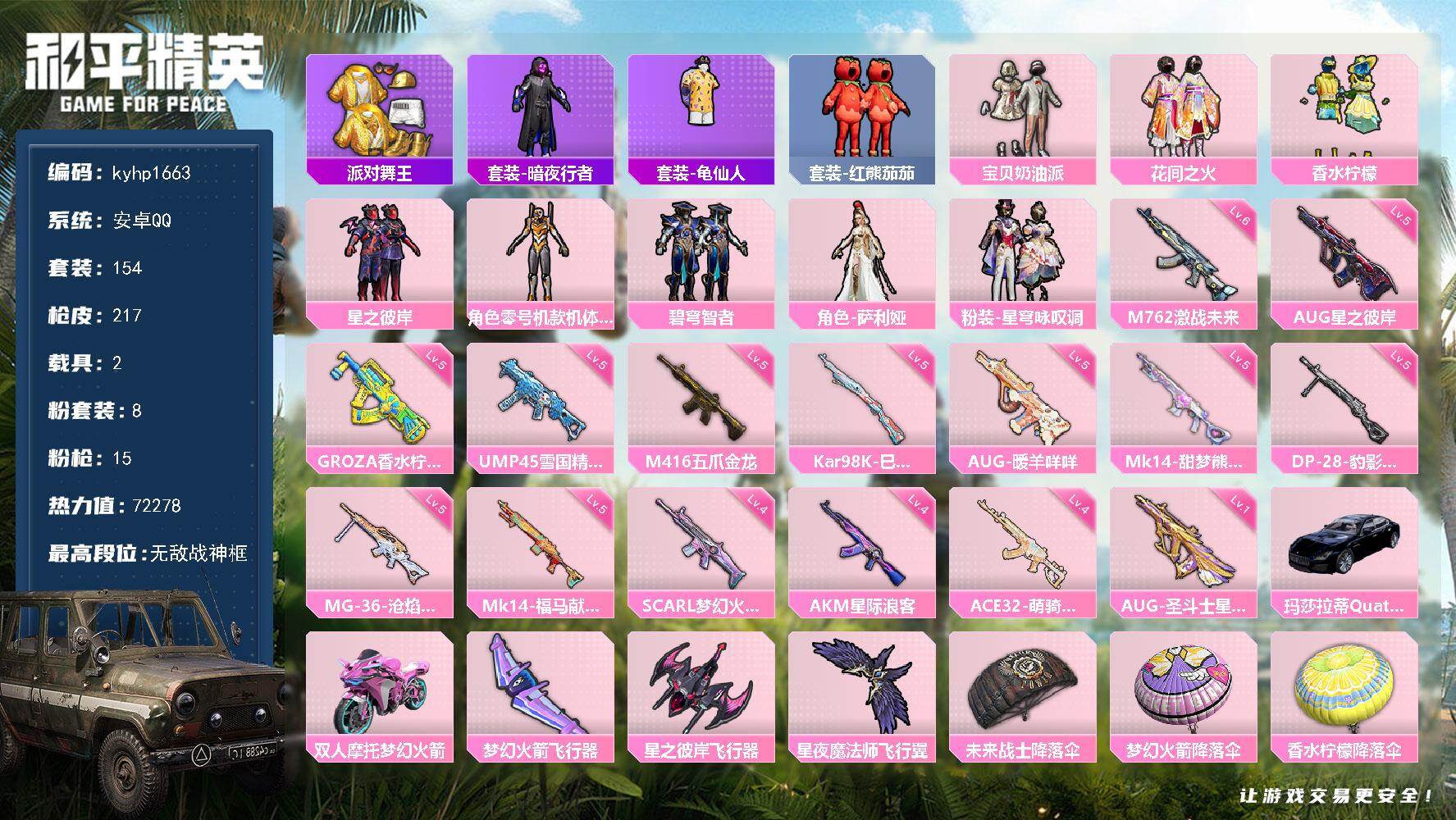 PX_2551918--无敌战神框-8粉装-15特效枪-2载具-3粉色飞行器-72278热力值-9王牌印记-154套装-217枪皮 【热门品类】:套装-派对舞王,套装-暗夜行者,套装-龟仙人,套装-红熊茄茄 【粉色套装】:粉装-宝贝奶油派,粉装-花间之火,粉装-香水柠檬,粉装-星之彼岸,角色-零号机款机体服,粉装-碧穹智者,角色-萨利娅,粉装-星穹咏叹调 【粉色枪皮等级】:AKM-星际浪客(四级),SCA