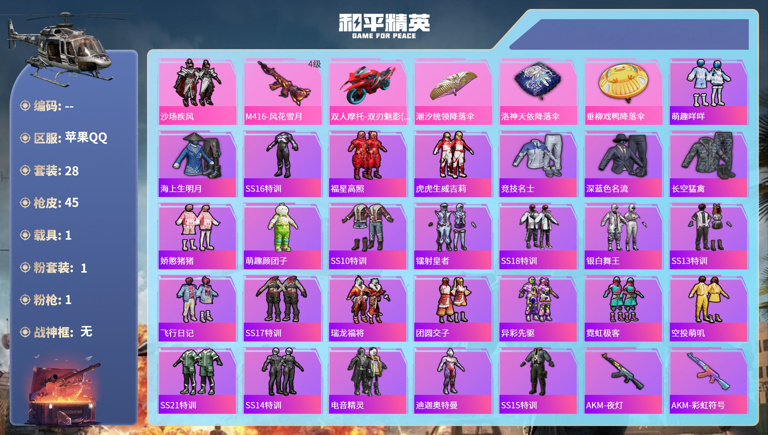 PX_2550129-苹果手Q-4王牌印记-1粉装-1特效枪-1载具-15046热力值-28套装-45枪皮 【1粉装】套装-沙场疾风 【1特效枪】M416-风花雪月/4级 【1稀有载具】双人摩托-双刃魅影(红) 【28稀有时装】沙场疾风,萌趣咩咩,海上生明月,SS16特训,福星高照,虎虎生威吉莉,竞技名士,深蓝色名流,长空猛禽,娇憨猪猪,萌趣颜团子,SS10特训,镭射皇者,SS18特训,银白舞王,SS13特训,飞行日记,SS17特训,瑞龙福将,团圆交子,异彩先驱,霓虹极客,空投萌叽,SS21特训,SS14特训,电音精灵,迪迦奥特曼,SS15特训 【45稀有枪械】M416-风花雪月/4级,AKM-夜灯,AKM-彩虹符号,AKM-萌趣颜团子,SCAR-L-玉兔迎春,GROZA-异彩先驱,GROZA-影袭,M762-瑞龙福将,M762-镭射皇者,M762-烈焰拳霸,Mk47-乌木金纹,G36C-乌木金纹,蜜獾-娇憨猪猪,Kar98K-乌木金纹,Kar98K-影袭,M24-乌木金纹,AWM-乌木金纹,Win94-瑞龙福将,VSS-镭射皇者,Mini14-异彩先驱,Mini14-海渊国主,Mk14-乌木金纹,SLR-娇憨猪猪,UZI-炫彩节奏,UZI-娇憨猪猪,Vector-彩虹符号,汤姆逊-异彩先驱,野牛-乌木金纹,MP5K-异彩先驱,S1897-镭射皇者,S1897-乌木金纹,S12K-瑞龙福将,S12K-夏日绵绵冰,S12K-娇憨猪猪,S12K-龙宫之主,M249-乌木金纹,M249-镭射皇者,DP-28-锦绣火鲤,DP-28-乌木金纹,MG3-瑞龙福将,平底锅-娇憨猪猪,平底锅-风花雪月,平底锅-异彩先驱,平底锅-镭射皇者,平底锅-瑞龙福将 【5稀有背包】萌趣颜团子背包(3级),镭射皇者背包(3级),SS10赛季背包(3级),瑞龙福将背包(3级),异彩先驱背包(3级) 【17稀有降落伞】镭射皇者降落伞,潮汐统领降落伞,紫菱降落伞,瑞龙福将降落伞,异彩先驱降落伞,青羽降落伞,普通降落伞,SS18王牌降落伞,娇憨猪猪降落伞,洛神天依降落伞,垂柳戏鸭降落伞,SS17王牌降落伞,SS21王牌降落伞,萌趣颜团子降落伞,勇者同行降落伞,怪兽之王降落伞,灵符少年降落伞 【2稀有头盔】垂柳戏鸭头盔(3级),镭射皇者头盔(3级)