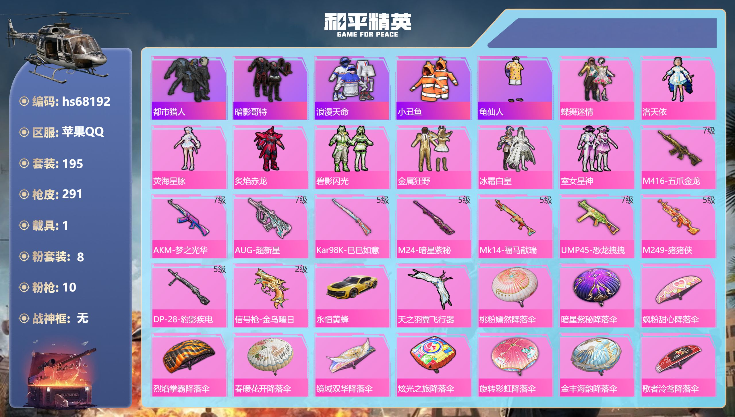 PX_2500304-身法号4粉装-4特效枪,赤蝎幽灵,西部牛仔面罩,都市猎人,梦幻火箭,暗影哥特,浪漫天命,粉熊背包全套,AKM-炫紫旋律[7级],M416-五爪金龙[7级]】苹果手Q-4粉装-4特效枪-181套装-205枪皮-10王牌印记-不朽星钻Ⅳ-64948热力值【4粉装】深海曼妙,水曜玄武,梦幻火箭,闲梦青缨【4特效枪】12-雪月幻音[1级],AKM-炫紫旋律[7级],M416-五爪金龙[7级]