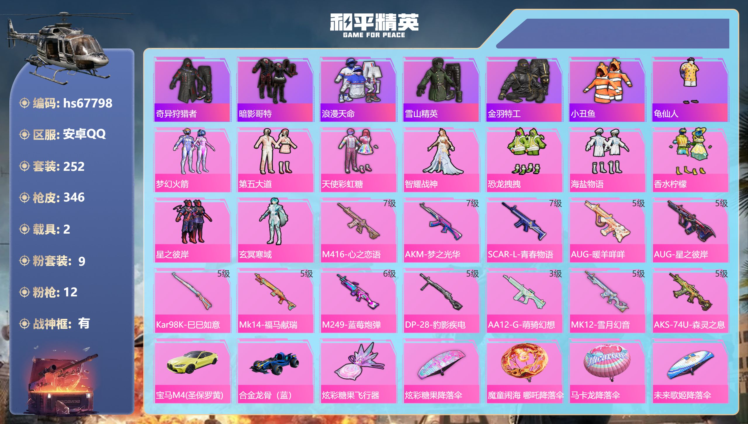 PX_2550127-,安卓手Q-23王牌印记-有战神框-9粉装-12特效枪-2载具-热力值-252套装-346枪皮-4卓越印记-2传奇印记 【9粉装】套装-恐龙拽拽,套装-第五大道,套装-梦幻火箭,角色-玄冥寒域,套装-海盐物语,套装-香水柠檬,套装-天使彩虹糖,角色-智耀战神,套装-星之彼岸 【12特效枪】MK12-雪月幻音/5级,AA12-G-萌骑幻想/3级,Mk14-福马献瑞/5级,Kar98K-巳巳如意/5级,AKM-梦之光华/7级,AKS-74U-森灵之息/5级,AUG-暖羊咩咩/5级,M416-心之恋语/7级,DP-28-豹影疾电/5级,SCAR-L-青春物语/7级,AUG-星之彼岸/5级,M249-蓝莓炮弹/6级 【7稀有紫装】奇异狩猎者,暗影哥特,浪漫天命,雪山精英,金羽特工,小丑鱼,龟仙人 【2稀有载具】宝马M4(圣保罗黄),合金龙骨(蓝) 【252稀有时装】梦幻火箭,第五大道,天使彩虹糖,智耀战神,恐龙拽拽,海盐物语,香水柠檬,星之彼岸,SS38特训,浪漫天命,奇异狩猎者,龟仙人,雪山精英,暗影哥特,小丑鱼,金羽特工,好奇恐龙,狂沙舞者,萌趣咩咩,神秘黑猫,海上生明月,玄冥寒域,异域银装,蓝调潮影,纯白跃动,白糯汤圆,冰河战士,鱼渊荷华,大橘大利,燕燕于飞,战术大师,诡面顽熊,马上有钱,蝶变,午间小调,琴音绮想,画境星梦,朱霞炽焰,狂鲨锋刃,阳光菠萝,凌霄紫焰,擎苍青焰,炫彩糖果,绯色魅影,萌鸡速递,元气之梦,书海巡游,风迹短诗,薄荷星砂,冰公主,雪国风尚,蓝冰羽,恋语绒绒,紫幽梦,SS35特训,迷域探索者,机械英豪,机械征服者,SS29特训,SS5特训,SS31特训,冰原使者,SS33特训,SS32特训,SS16特训,暴风机械师,时空追击者,SS36特训,军械专家,云纹魔法士,金鼠迎春,黑色刀锋,福星高照,精密机核,幻世猎手,虎虎生威吉莉,夏日音浪,龙的传人,潮流炫酷,SS8特训,众神之王,智慧之神,果汁能量,白熊同盟,萌黄之夏,SS37特训,PEL躁动竞梦者,SS28特训,特训学院,朱竹清,沁蓝冰爽,黄色运动,极速竞梦,飞驰魅影,白色伏地魔,音速流光,冰川格斗者,爆竹金鼠,SS9特训,白月香洋装,湖蓝色名流,酷潮明星,绯格组合,涂山之恋,SS26特训,漫步者,炫蓝之夏,SS34特训,骑行爱好者,竞技名士,蓝色守护者,猛禽,雨林探路者,SS30特训,长空猛禽,竞技勇士朋克,特战装甲,战地菁英,灰色格斗者,六六大吉,甜蜜告白,街头潮人,冷焰舞者,惊鸿侠骨,魅力单车,灼焰舞者,雪山征服者,夜莺强袭者,野性战魂,猎梦纪元,丛林猎人,甜心亚梦,虚音幻奏,传奇侦探,幻世战舞者,突袭者,牛气满满,娇憨猪猪,风暴特警,春日漫步,冰川特警,燃烧卡路里,滨海假日,极速红龙,狙击之神,WiFi精灵,沙漠毒蛇,红釉青花,麻辣教官,鹰眼刺客,雨过天青,福马献瑞,冰冻风暴,玲珑侠影,梦之呓语,SS11特训,幻影武者,青春冒险家,破蛋小黄鸡,潮流游乐家,日照花林,疯狂小兔子,圣诞大吉,凛冬战士,梨园星光,北国孤狼,蓝彩潮人,SS6特训,拳皇97草薙京,神秘领域,炽焰拳师,绮丽涂鸦,骁骑迪迦,格斗专家,耀眼新星,朋克治安官,原初圣火,逆风勇士,海岛探路者,跃动心情,SS7特训,核芯基因,精神漫游,破晓战魂,和煦暖阳,霓虹街区,田园牧歌,萌趣颜团子,轻风白浪,SS10特训,风行保卫者,特种颜团子,沙漠兵团,镭射皇者,耀粉歌者,风华少年志,摩艾涂鸦,探宝勇士,SS12特训,牛气冲天,迅捷之星,SS18特训,治愈之星,银白舞王,清新柠檬,科技之星,SS13特训,碧波幻想,飞行日记,SS17特训,瑞龙福将,团圆交子,金耀舞者,蓝调潮人,缤纷焰火,异彩先驱,霓虹极客,空投萌叽,SS19特训,光之冒险,晨曦薄雾,SS20特训,SS21特训,绝对偶像,玉兔迎春,弄潮海豚,SS22特训,SS23特训,呆萌铁蟹,摩登艾咪,夏日倾情,甜蜜熊情侣,缤纷果语,SS14特训,神气柴柴,妙红点点,幻彩翩翩,格斗先锋,吉莉礼服,刚毅裁决者,王牌教练,荣耀,柠萌假日,粉红小猪,SS24特训,懵萌河马,SS25特训,快乐星愿,锦衣飞扬,星梦畅游,SS15特训,深蓝冒险家 【346稀有枪械】M416-心之恋语/7级,AKM-梦之光华/7级,SCAR-L-青春物语/7级,AUG-暖羊咩咩/5级,AUG-星之彼岸/5级,Kar98K-巳巳如意/5级,Mk14-福马献瑞/5级,M249-蓝莓炮弹/6级,DP-28-豹影疾电/5级,AA12-G-萌骑幻想/3级,MK12-雪月幻音/5级,AKS-74U-森灵之息/5级,DBS-乌木金纹,Mk14-冰河战士,MK20-H-乌木金纹,DBS-风迹短诗,莫辛纳甘-风迹短诗,Mini14-鸡智如我,AKM-绿洲时空,Win94-乌木金纹,MK12-风迹短诗,MK12-乌木金纹,破片手榴弹-爆破雪人,PKM-紫幽梦,ACE32-画境星梦,M1加兰德-画境星梦,MP5K-画境星梦,Mk14-紫幽梦,蜜獾-乌木金纹,S1897-紫幽梦,P92-紫幽梦,AWM-绿洲时空,SPAS-12-狂鲨锋刃,MK20-H-狂鲨锋刃,AUG-冰晶雪宝,铝热弹-炫彩糖果,UZI-炫彩糖果,AA12-G-画境星梦,平底锅-画境星梦,M249-冰晶雪宝,Mk47-风迹短诗,JS9-凌霄紫焰,MG-36-凌霄紫焰,平底锅-紫幽梦,UMP45-海盐豹豹,ARX-凌霄紫焰,AKS-74U-乌木金纹,AKM-涂鸦街区,电击枪-喜羊羊与灰太狼,蜜獾-风迹短诗,爆炸猎弓-喜羊羊与灰太狼,P92-凌霄紫焰,Famas-乌木金纹,Famas-霓彩脉冲,破片手榴弹-拽到爆炸,十字弩-异瞳寒姬,S1897-糯团青竹,信号枪-异瞳寒姬,平底锅-凌霄紫焰,Mk14-薄荷星砂,Mk14-紫晶流影,MG-36-薄荷星砂,SCAR-L-绿洲时空,PKM-啾咪啾咪,SVD-霓彩脉冲,SLR-霓彩脉冲,SCAR-L-彩虹符号,S686-雪月幻音,AUG-紫晶流影,S12K-霓彩脉冲,AMR-鸡智如我,AKM-霓彩脉冲,破片手榴弹-火尖莲影,M416-红色方程式,M416-仓鼠灰灰,M416-乌木金纹,M416-蓝色火焰,M416-夜灯,M416-糯团青竹,M416-绯红前夜,AKM-环太平洋,AKM-夜灯,AKM-生命誓言,AKM-乌木金纹,AKM-星之彼岸,AKM-彩虹符号,AKM-缤纷海域,AKM-破晓战魂,AKM-玉龙,AKM-灼热熔岩,AKM-虎虎生威,AKM-恐龙拽拽,AKM-萌趣颜团子,AKM-霓虹街区,SCAR-L-红色方程式,SCAR-L-玉
