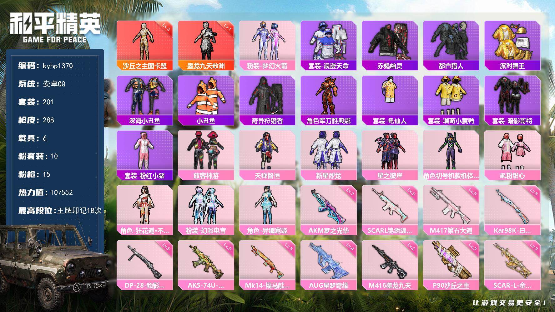 PX_2552462--2神装-10粉装-15特效枪-6载具-19粉色飞行器-107552热力值-18王牌印记-201套装-288枪皮 【红色神装等级】:墨龙九天-敖渊(一级),沙丘之主-图卡盟(三级) 【红色角色神装】:墨龙九天-敖渊,沙丘之主-图卡盟 【热门品类】:粉装-梦幻火箭,套装-浪漫天命,套装-赤蝎幽灵,套装-都市猎人,套装-派对舞王,套装-深海小丑鱼,套装-小丑鱼,套装-奇异狩猎者,角色-军
