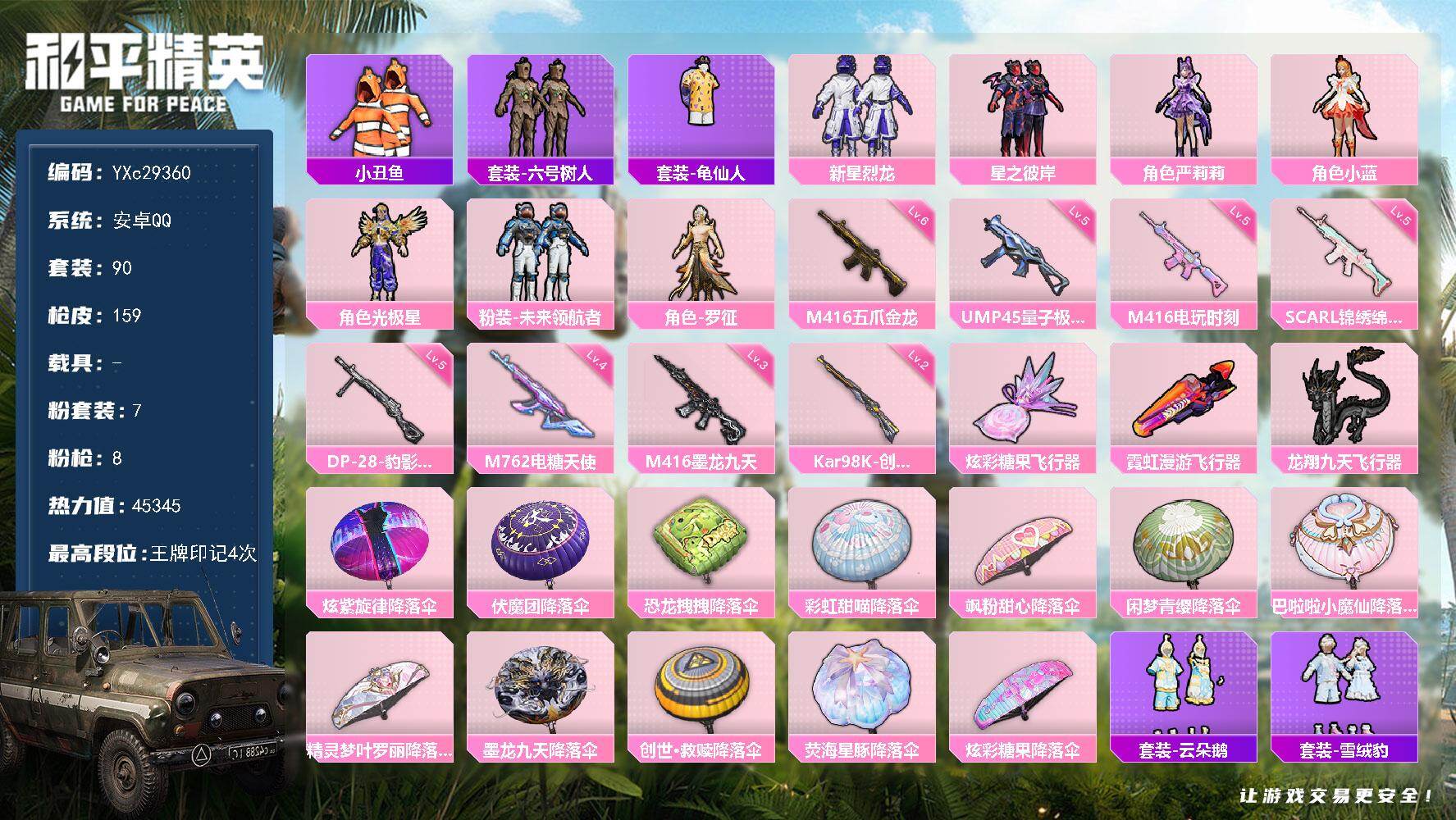 PX_2527116--2粉装-8特效枪-0载具-2粉色飞行器-36071热力值-5王牌印记-87套装-138枪皮 【粉色套装】:角色-羊梦糖心,角色-罪夜之冕 【粉色枪皮等级】:AKS-74U-森灵之息(五级),Kar98K-巳巳如意(五级),Mk14-甜梦熊击(五级),DP-28-豹影疾电(五级),MG-36-沧焰双生(五级) 【粉色枪皮】:UMP45-萌骑冒险,AKS-74U-森灵之息,Kar98K