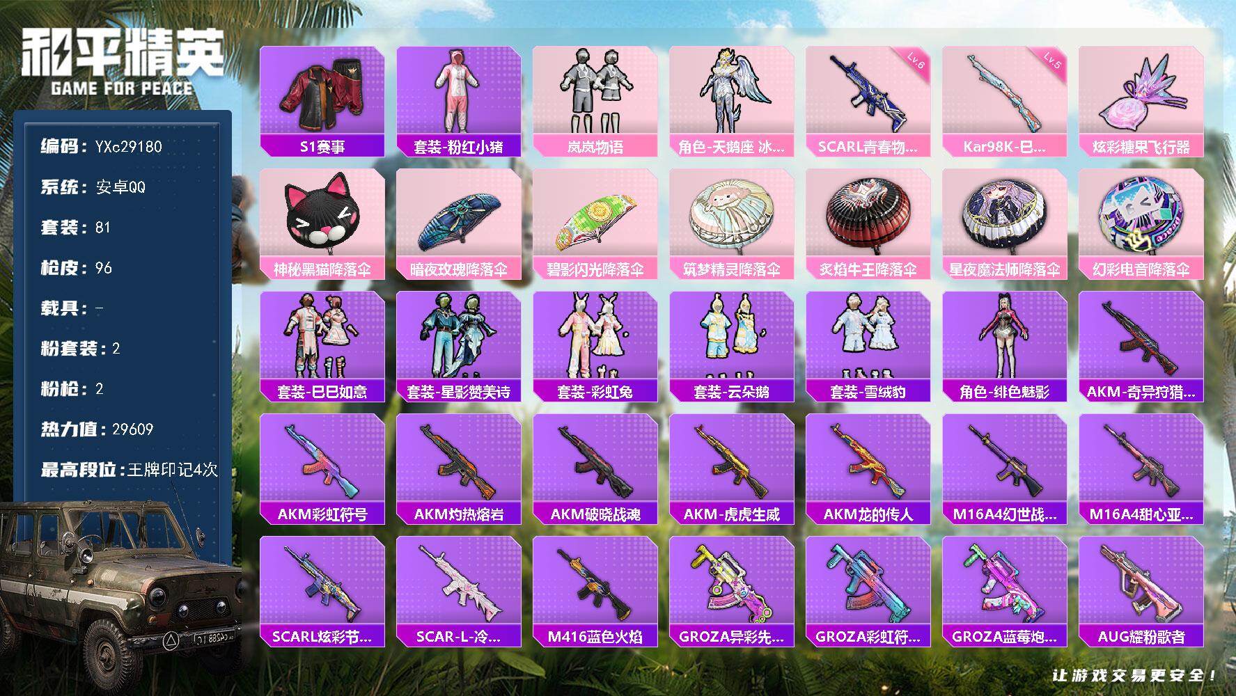 PX_2553363-?事全套】YXc29180-【无二次协助处理】【因赛季更新游戏段付以上号为准!】 安卓Q-3稀有2粉装2特效枪10热门81套装96枪皮,,4印记,历史传奇王牌14星, 【3稀有】,S1赛事,S1赛事裤,S1赛事外套, 【2粉装】,天鹅座冰河,岚岚物语, 【2特效枪】,Kar98K-巳巳如意,(5级),SCAR-L-青春物语,(6级), 【10热门】,呆萌铁蟹,团圆交子,瑞龙福将,粉红小猪,极速红龙,AKM-奇异狩猎者,M762-奇异狩猎者,M762-瑞龙福将,M24-奇异狩猎者,S686-奇异狩猎者,