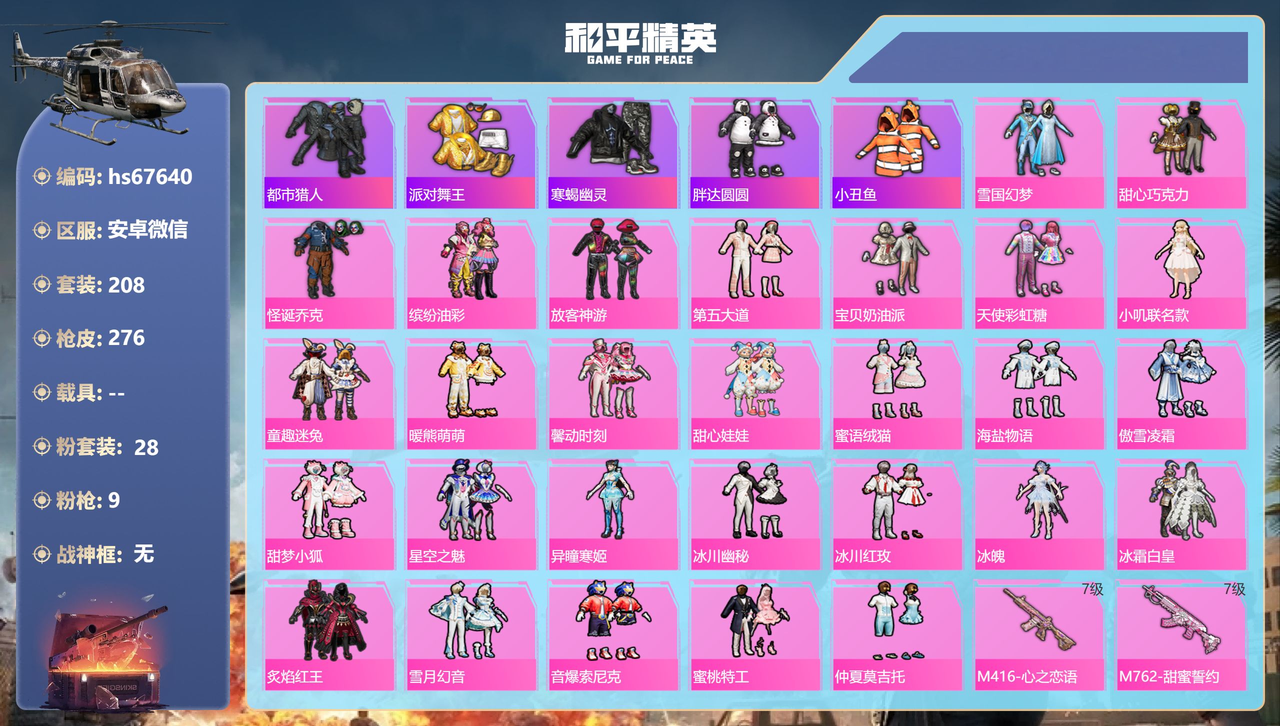 PX_2535538-,安卓微信-19王牌印记-28粉装-9特效枪-95427热力值-208套装-276枪皮-7卓越印记-1传奇印记 【28粉装】套装-海盐物语,套装-蜜语绒猫,套装-冰川红玫,套装-甜心娃娃,套装-雪月幻音,套装-天使彩虹糖,套装-炙焰红王,套装-仲夏莫吉托,套装-雪国幻梦,角色-小叽联名款,套装-冰川幽秘,套装-音爆索尼克,角色-冰魄,套装-傲雪凌霜,套装-甜梦小狐,套装-童趣迷兔,套装-暖熊萌萌,套装-第五大道,套装-冰霜白皇,角色-异瞳寒姬,套装-放客神游,套装-蜜桃特工,套装-甜心巧克力,套装-缤纷油彩,套装-怪诞乔克,套装-宝贝奶油派,套装-星空之魅,套装-馨动时刻 【9特效枪】Kar98K-巳巳如意/5级,平底锅-仲夏莫吉托/7级,M762-甜蜜誓约/7级,AWM-橘柚倾心/4级,M416-心之恋语/7级,Mk14-福马献瑞/5级,DP-28-暗夜鎏金/7级,P90-粉樱探戈/7级,DP-28-豹影疾电/5级 【5稀有紫装】都市猎人,派对舞王,寒蝎幽灵,胖达圆圆,小丑鱼 【1僚机】僚机-萌兔起飞 【208稀有时装】雪国幻梦,甜心巧克力,怪诞乔克,缤纷油彩,放客神游,第五大道,宝贝奶油派,天使彩虹糖,小叽联名款,童趣迷兔,暖熊萌萌,馨动时刻,甜心娃娃,蜜语绒猫,海盐物语,傲雪凌霜,甜梦小狐,星空之魅,异瞳寒姬,冰川幽秘,冰川红玫,冰魄,冰霜白皇,炙焰红王,雪月幻音,音爆索尼克,蜜桃特工,仲夏莫吉托,都市猎人,寒蝎幽灵,小丑鱼,胖达圆圆,派对舞王,兔兔白日梦,动感兔斯基人偶服,萌趣咩咩,红熊茄茄,糯粉咩咩,龙魂突击队,小熊娃娃,异域银装,都市丽猫,街头风暴,星途旅人,冰河战士,鱼渊荷华,青团波波,大橘大利,燕燕于飞,战术大师,智谋强哥,雏菊兔兔,糖糖葫芦,晶辉守护,香桃花海,蝶变,巳巳如意,粉恋花,粉日山川,棉花软糖,元素星魂,午间小调,彩虹兔,琴音绮想,雪绒豹,画境星梦,朱霞炽焰,狂鲨锋刃,美羊羊,凌霄紫焰,粉黛兰香,擎苍青焰,炫彩糖果,萌鸡速递,元气之梦,书海巡游,风迹短诗,漫游都市,薄荷星砂,秘语星愿,蓝海鲸歌,云朵鹅,顶瓜瓜,银尘,雪国风尚,蓝冰羽,恋语绒绒,青翼流星,紫幽梦,马上来财,SS35特训,SS29特训,萝兰蝴蝶,SS31特训,SS33特训,SS32特训,无暇誓言,SS36特训,贝斯之夜,焰鹰斗篷,童真绒兔,福星高照,暗夜契约,纯白誓言,虎虎生威吉莉,夏日音浪,龙的传人,军刀雅典娜,春野茶蘼,青芒树下,SS37特训,SS28特训,萌趣绒叽,特训学院,红色运动,热血青春,酒红色名流,湖蓝色名流,黄色名流,酷潮明星,顽皮玉兔,暖暖麦兜,涂山之恋,漫步者,空岛之星,炫蓝之夏,SS34特训,竞技名士,银月精灵,猛禽,SS30特训,长空猛禽,旭日情侣,冷焰舞者,惊鸿侠骨,魅力单车,灼焰舞者,奶芙汪汪,春光漫游,猎梦纪元,甜心亚梦,虚音幻奏,幻世战舞者,战地督导,青涩时光,青春校园,牛气满满,娇憨猪猪,夏雨游龙,极速红龙,狙击之神,红釉青花,麻辣教官,鹰眼刺客,花羊椰椰,雨过天青,福马献瑞,冰冻风暴,完美偶像,人气偶像,幽夜迷踪,幻影武者,破蛋小黄鸡,快闪甜心,红潮炫舞,蓝彩潮人,绮丽涂鸦,破晓战魂,和煦暖阳,霓虹街区,田园牧歌,都市魅力,轻风白浪,耀粉歌者,探宝勇士,SS27特训,牛气冲天,飞行日记,绚烂繁星,SS19特训,光之冒险,SS20特训,SS21特训,绝对偶像,玉兔迎春,弄潮海豚,SS22特训,SS23特训,呆萌铁蟹,缤纷果语,滨海厨神,莱茵河畔,青涩年华,白兰地假日,神气柴柴,妙红点点,幻彩翩翩,格斗先锋,幻羽潜行,海盐绵绵冰,老实芭蕉,王牌教练,柠萌假日,SS24特训,懵萌河马,软软小魔女,SS25特训,锦衣飞扬 【274稀有枪械】M416-心之恋语/7级,M762-甜蜜誓约/7级,Kar98K-巳巳如意/5级,AWM-橘柚倾心/4级,Mk14-福马献瑞/5级,P90-粉樱探戈/7级,DP-28-豹影疾电/5级,DP-28-暗夜鎏金/7级,平底锅-仲夏莫吉托/7级,DBS-乌木金纹,汤姆逊-星梦奇缘,SCAR-L-海盐豹豹,GROZA-海盐豹豹,SLR-金丰海韵,野牛-雏菊兔兔,蝎式手枪-金丰海韵,Mk14-冰河战士,平底锅-雏菊兔兔,M762-雏菊兔兔,Mini14-雏菊兔兔,R1895-雏菊兔兔,M249-金丰海韵,UZI-冰河战士,M16A4-冰河战士,MK20-H-乌木金纹,DBS-风迹短诗,莫辛纳甘-风迹短诗,Mini14-鸡智如我,AKM-绿洲时空,Win94-乌木金纹,MK12-风迹短诗,MK12-乌木金纹,破片手榴弹-爆破雪人,S12K-极意拳锋,PKM-紫幽梦,MG3-霓彩脉冲,ACE32-画境星梦,M1加兰德-画境星梦,MP5K-画境星梦,Mk14-紫幽梦,蜜獾-乌木金纹,M762-云朵鹅,S1897-紫幽梦,SVD-云朵鹅,P92-紫幽梦,AWM-绿洲时空,SPAS-12-狂鲨锋刃,M417-玩趣呆呆,MK20-H-狂鲨锋刃,AUG-冰晶雪宝,铝热弹-炫彩糖果,UZI-炫彩糖果,UMP45-绿洲时空,大砍刀-像素花束,AA12-G-画境星梦,平底锅-画境星梦,M249-冰晶雪宝,Mk47-风迹短诗,JS9-凌霄紫焰,MG-36-凌霄紫焰,平底锅-紫幽梦,破片手榴弹-海盐豹豹,UMP45-海盐豹豹,ARX-凌霄紫焰,AKS-74U-乌木金纹,AKM-涂鸦街区,蜜獾-风迹短诗,爆炸猎弓-喜羊羊与灰太狼,P92-凌霄紫焰,AMR-喜羊羊与灰太狼,Famas-乌木金纹,Famas-霓彩脉冲,SPAS-12-云朵鹅,破片手榴弹-拽到爆炸,十字弩-异瞳寒姬,平底锅-凌霄紫焰,Mk14-薄荷星砂,AKS-74U-鸡智如我,沙漠之鹰-云朵鹅,烟雾弹-冰氧夏日,MG-36-薄荷星砂,大砍刀-云朵鹅,PKM-啾咪啾咪,SVD-霓彩脉冲,SLR-霓彩脉冲,平底锅-属我最6,SCAR-L-彩虹符号,蜜獾-绿洲时空,S686-雪月幻音,AUG-紫晶流影,S12K-霓彩脉冲,AKM-霓彩脉冲,M416-红色方程式,M416-蓝色火焰,M416-糯团青竹,AKM-影袭,AKM-星兔领航员,AKM-缤纷海域,AKM-破晓战魂,AKM-龙的传人,AKM-虎虎生威,SCAR-L-玉兔迎春,SCAR-L-甜蜜誓约,SCAR-L-粉色回忆,SCAR-L-炫彩节奏,M16A4-幻世战舞者,M16A4-甜心亚梦,GROZA-恐龙拽拽,GROZA-影袭,GROZA-田园牧歌,GROZA-懵萌河马,AUG-甜蜜菠萝,AUG-冰川