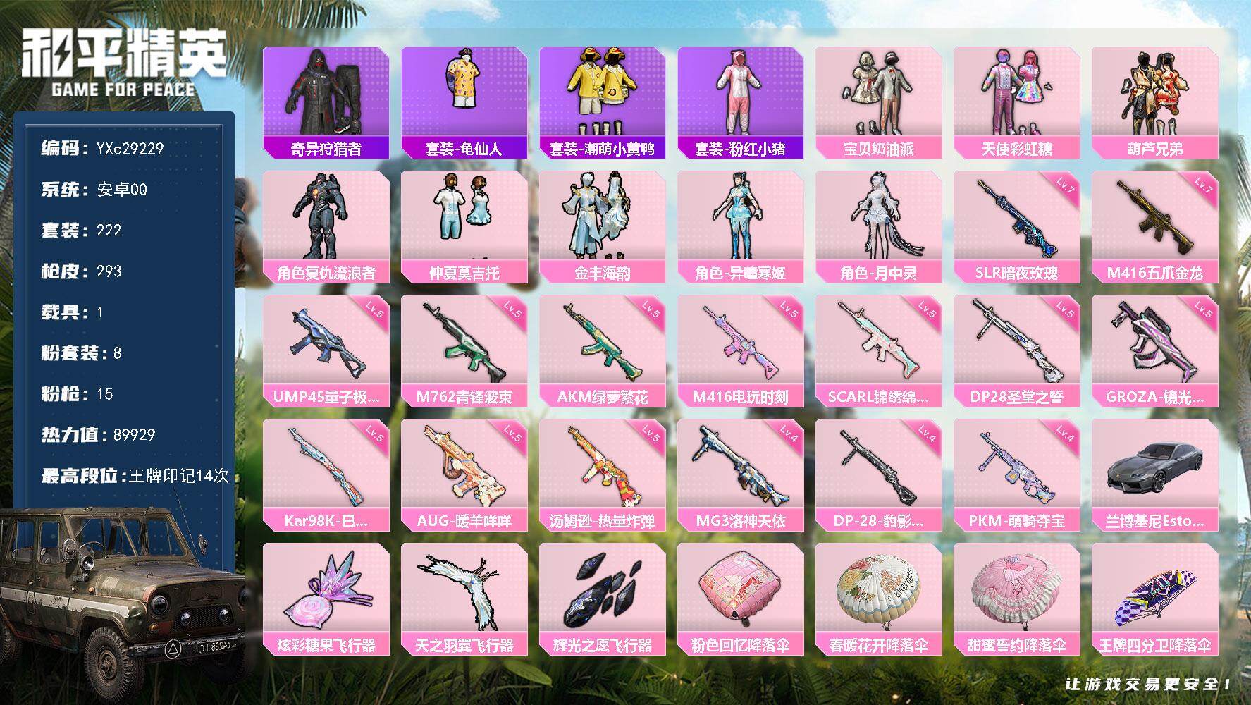 PX_2553345-??五爪】YXc29229-【可二次】【因赛季更新游戏段付以上号为准!】 ,安卓Q-1稀有1载具8粉装15特效枪20热门222套装293枪皮,14印记,历史超级王牌15星, 【1稀有】,奇异狩猎者, 【1载具】,兰博轿车灰色, 【8粉装】,宝贝奶油派,天使彩虹糖,月中灵,金丰海韵,异瞳寒姬,仲夏莫吉托,葫芦兄弟,复仇流浪者, 【15特效枪】,M416-五爪金龙,(7级),SCAR-L-锦绣绵绵,(5级),M416-电玩时刻,(5级),AKM-绿萝繁花,(5级),Kar98K-巳巳如意,(5级),M762-青锋波束,(5级),DP-28-豹影疾电,(4级),AUG-暖羊咩咩,(5级),UMP45-量子极限,(5级),GROZA-镜光银凌,(5级),DP-28-圣堂之誓,(5级),汤姆逊-热量炸弹,(5级),SLR-暗夜玫瑰,(7级),MG3-洛神天依,(4级),PKM-萌骑夺宝,(4级), 【20热门】,龟仙人,浪漫假日,雪山精英,潮萌小黄鸭,晶辉守护,大橘为重,暗夜契约,团圆交子,瑞龙福将,纯白誓言,粉红小猪,韶华初心,青龙圣者,海洋之心,破蛋小黄鸡,AKM-奇异狩猎者,M762-奇异狩猎者,M762-瑞龙福将,M24-奇异狩猎者,S686-奇异狩猎者, 【1飞行器】,天之羽翼飞行器, 【2头盔】,甜心宝贝头盔,夏日绵绵冰头盔, 【1背包】,甜心宝贝背包,