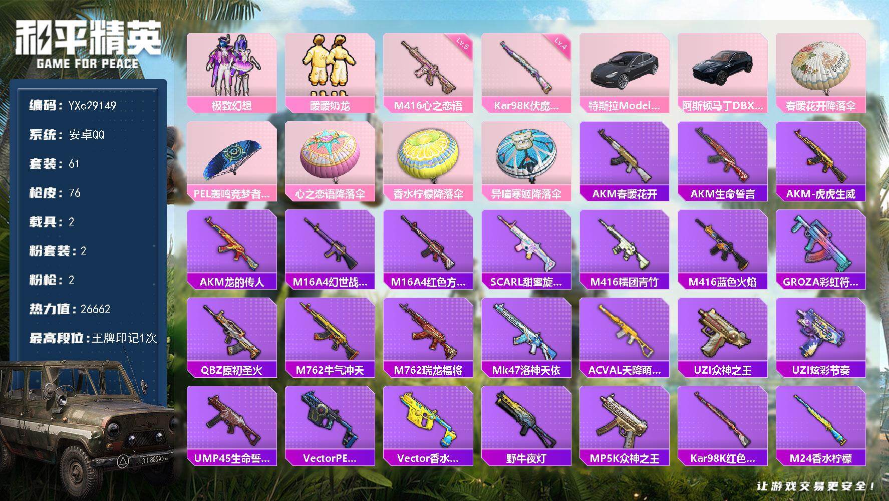 PX_2553344-??恋语】YXc29149-【无二次协助处理】【因赛季更新游戏段付以上号为准!】 安卓Q-2载具2粉装2特效枪11热门61套装76枪皮,,1印记,历史超级王牌1星, 【2载具】,阿斯顿马丁X蓝色,特斯拉3银色, 【2粉装】,暖暖奶龙,极致幻想, 【2特效枪】,M416-心之恋语,(5级),Kar98K-伏魔团,(4级), 【11热门】,雪山精英,软萌银虎,暗夜契约,团圆交子,瑞龙福将,纯白誓言,抹茶蜜豆,海洋之心,风华少年志,M762-瑞龙福将,M24-香水柠檬, 【1头盔】,心之恋语头盔, 【1背包】,梦幻火箭背包,