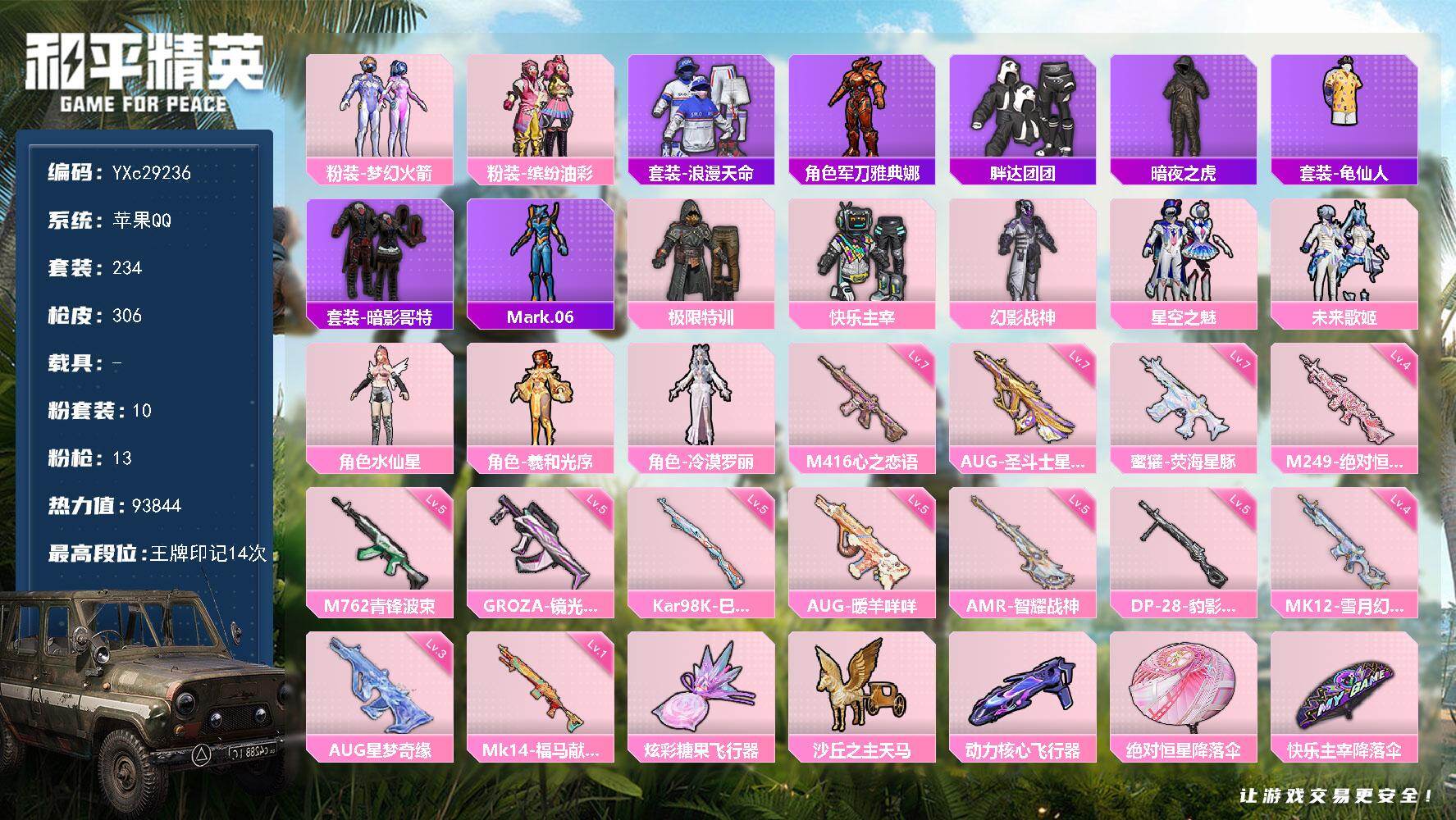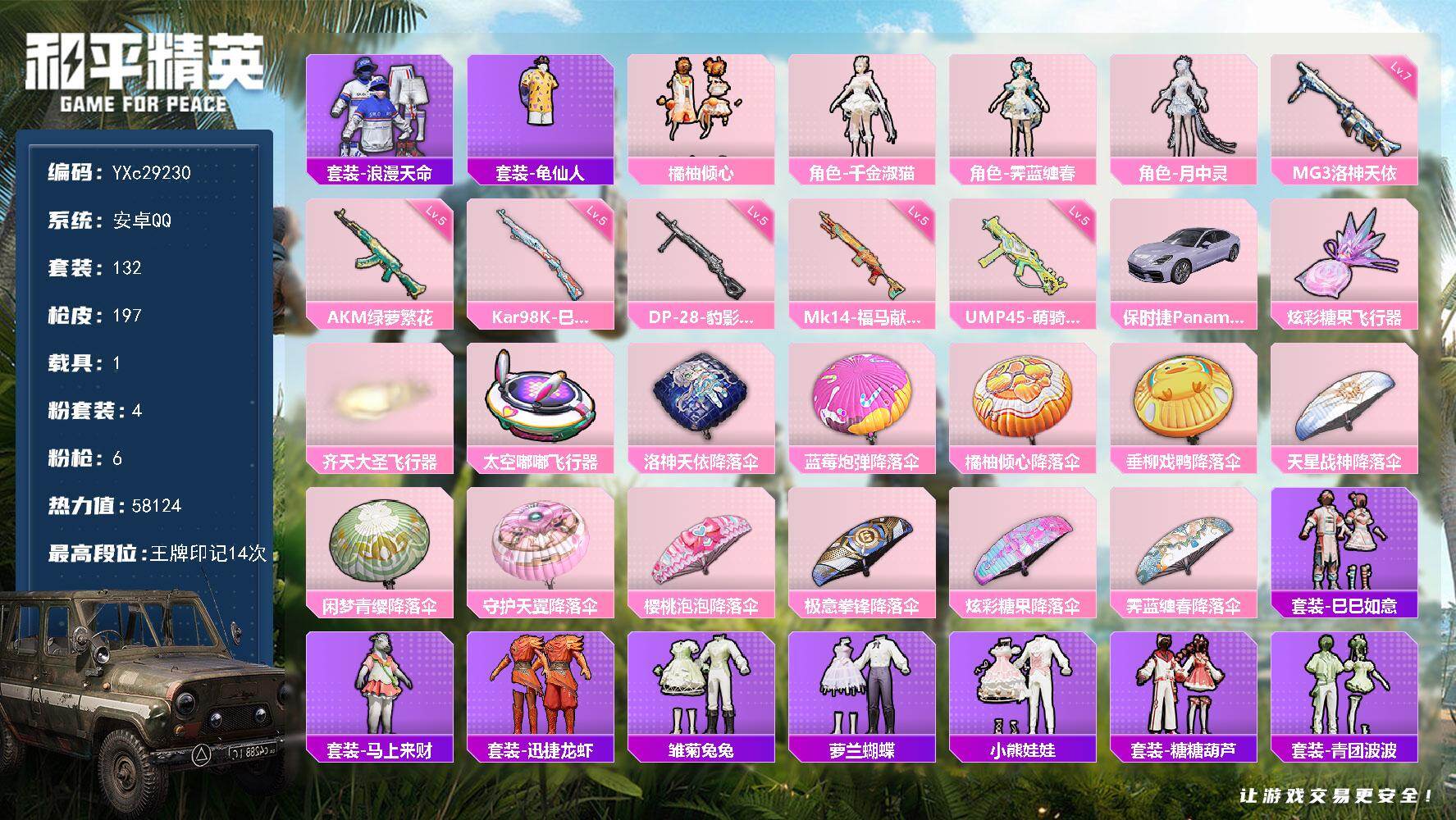 PX_2553357-可二次实名【4特效枪1粉装,秒换绑不用等】,安卓Q区-21396热力值-2印记-53套装-77枪皮,【1粉装】,星之彼岸【4特效枪】,Mk14-福马献瑞(5级),ACE32-萌骑漫游(5级),Kar98K-巳巳如意(5级),DP-28-豹影疾电(5级)【96热门】,破蛋小黄鸡,白色伏地魔,SCAR-L-玉兔迎春,DBS-彩虹符号,MG3-幻世战舞者,M416-蓝色火焰,长空猛禽,魅力单车,蓝色运动,黄色运动,黄色伏地魔,红色运动,黑色伏地魔,海岛探路者,S1897-糯团青竹,AA12-G-雨过天青,沙漠之鹰-雨过天青,P90-紫矿核心,M16A4-雨过天青,AC-VAL-玩趣呆呆,顶瓜瓜,M249-无面战甲,白辉玉蕊,雨过天青,MG-36-薄荷星砂,GROZA-福马献瑞,恋语绒绒,SS34特训,霜纹水星,漫游都市,蜜獾-鸡智如我,撬棍-冰晶雪宝,福马献瑞,大橘大利,M200-罪夜之冕,DBS-辉云木星,SS29特训,SS30特训,ACE32-冰晶雪宝,P1911-无面战甲,青翼流星,PKM-啾咪啾咪,M16A4-冰河战士,SS31特训,SS33特训,SS32特训,巳巳如意,绯色魅影,游乐,SS36特训,异域银装,智谋强哥,战术大师,蜜獾-启元战纹,马上有钱,突击盾牌-虎痴许褚,蜜獾-虎痴许褚,狙击之神,破片手榴弹-海盐豹豹,UMP45-海盐豹豹,QBU-未来领航者,Mk14-薄荷星砂,AUG-紫晶流影,AMR-鸡智如我,AMR-喜羊羊与灰太狼,燃烧瓶-福马献瑞,Mk14-冰河战士,GROZA-海盐豹豹,Mini14-香桃花海,破片手榴弹-巳巳如意,AKS-74U-鸡智如我,UZI-冰河战士,M249-绯穹魔姬,SS35特训,薄荷星砂,蝶变,破片手榴弹-星途旅人,霓虹热舞,元气之梦,VSS-香桃花海,AUG-异域银装,十字弩-异域银装,信号枪-异瞳寒姬,SLR-霓彩脉冲,UZI-炫彩糖果,电击枪-喜羊羊与灰太狼,Mini14-鸡智如我,P90-巳巳如意,S686-巳巳如意,萌鸡速递,云魄琉璃,SS37特训,AMR-雨过天青,PKM-雨过天青,红釉青花,白糯汤圆【2飞行器】,光之冒险尾迹,炫彩糖果飞行器【14背包】,深海小丑鱼背包(3级),海盐豹豹背包(3级),冰河战士背包(3级),蝶变背包(3级),第五大道背包(3级),香桃花海背包(3级),鬼刀背包(3级),智谋强哥背包(3级),异域银装背包(3级),巳巳如意背包(3级),智耀战神背包(3级),炫彩糖果背包(3级),极意拳锋背包(3级),狂鲨锋刃背包(3级),营地ID:975378203,