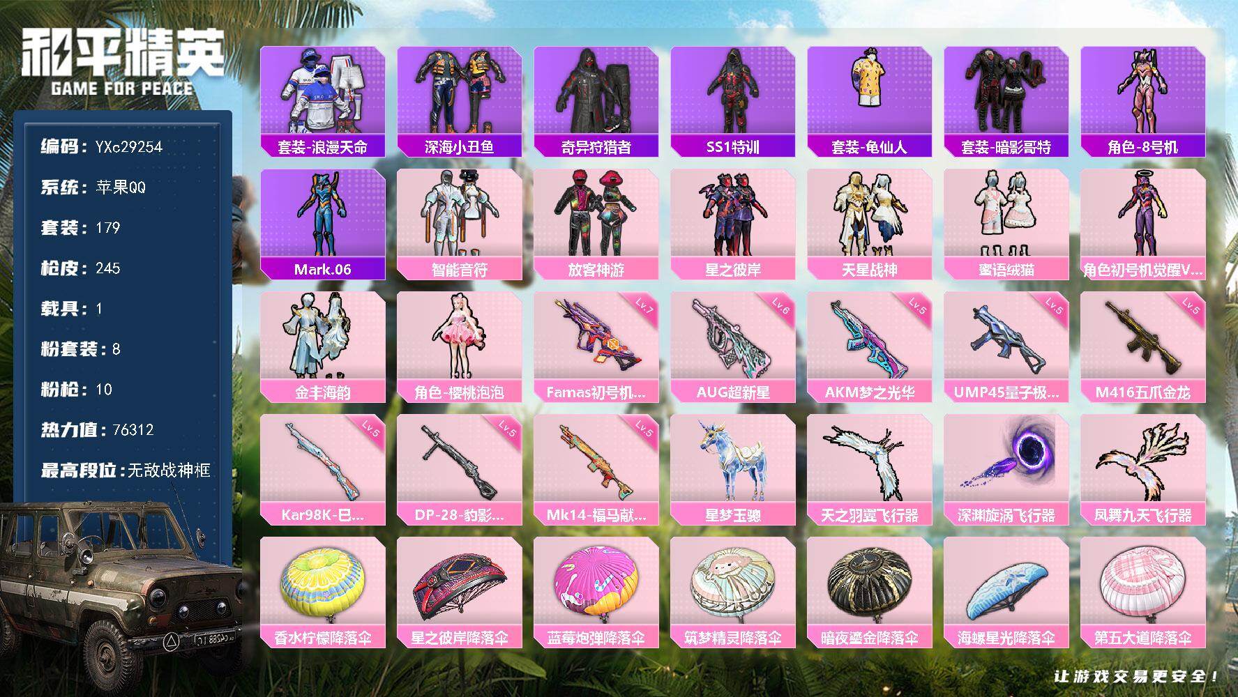 PX_2553359-战神框,放客,觉醒螳螂,哥特,满地铁天赋】YXc29254-【无二次】【因赛季更新游戏段付以上号为准!】 ,苹果Q-3稀有1载具8粉装10特效枪17热门179套装245枪皮,19印记,历史无敌战神, 【3稀有】,奇异狩猎者,S1赛事外套,浪漫天命, 【1载具】,星梦玉骢, 【8粉装】,觉醒初号机,蜜语绒猫,金丰海韵,樱桃泡泡,天星战神,智能音符,放客神游,星之彼岸, 【10特效枪】,Famas-觉醒初号机,(7级),M416-五爪金龙,(5级),Kar98K-巳巳如意,(5级),DP-28-豹影疾电,(5级),AUG-超新星,(6级),UMP45-量子极限,(5级),AKM-梦之光华,(5级),Mk14-福马献瑞,(5级),破片手榴弹-粉粉猫爪,(7级),烟雾弹-猫咪绅士,(5级), 【17热门】,8号机,Mark.06,龟仙人,雪山精英,鹰眼刺客,星兔领航员,深海小丑鱼,TT战队服,暗影哥特,SS1特训,水银刺客,漫步者,冰爽海盐,破蛋小黄鸡,极速红龙,Mini14-林间仙鹿,GROZA-林间仙鹿, 【2飞行器】,深渊漩涡飞行器,天之羽翼飞行器, 【3头盔】,童趣迷兔头盔,深海小丑鱼头盔,金羽特工头盔, 【1背包】,神秘黑猫背包,