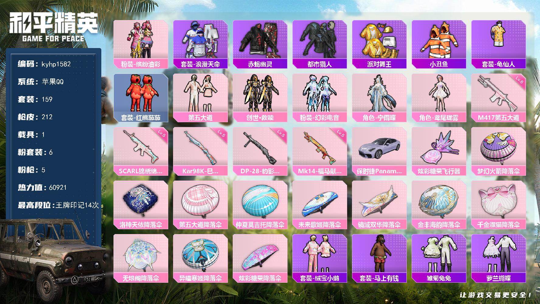 PX_2553330--6粉装-5特效枪-1载具-1粉色飞行器-60921热力值-14王牌印记-159套装-212枪皮 【热门品类】:粉装-缤纷油彩,套装-浪漫天命,套装-赤蝎幽灵,套装-都市猎人,套装-派对舞王,套装-小丑鱼,套装-龟仙人,套装-红熊茄茄 【粉色套装】:粉装-缤纷油彩,粉装-第五大道,套装-创世·救赎,粉装-幻彩电音,角色-宁雨蝶,角色-鸢尾珑雾 【粉色枪皮等级】:SCAR-L-锦绣绵绵