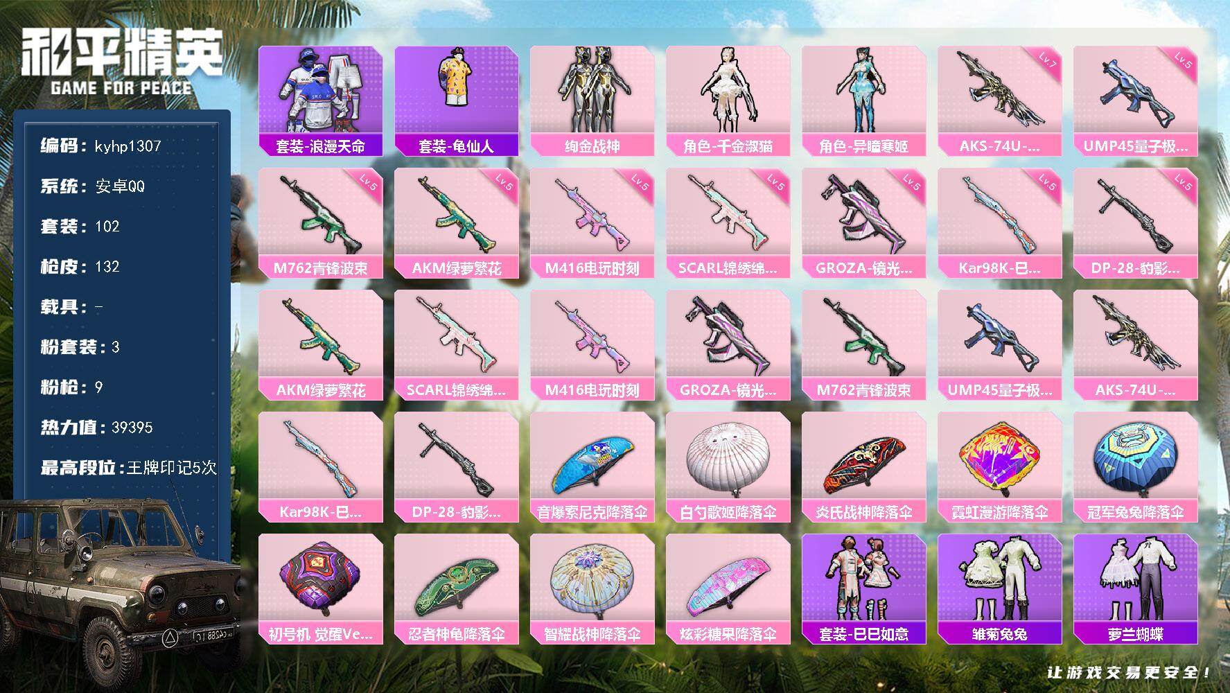PX_2553335--3粉装-9特效枪-0载具-0粉色飞行器-39395热力值-5王牌印记-102套装-132枪皮 【热门品类】:套装-浪漫天命,套装-龟仙人 【粉色套装】:粉装-绚金战神,角色-千金淑猫,角色-异瞳寒姬 【粉色枪皮等级】:AKM-绿萝繁花(五级),SCAR-L-锦绣绵绵(五级),M416-电玩时刻(五级),GROZA-镜光银凌(五级),M762-青锋波束(五级),UMP45-量子极限(