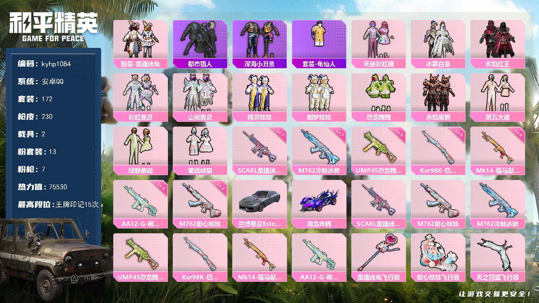 PX_2549306--13粉装-7特效枪-2载具-3粉色飞行器-75530热力值-15王牌印记-172套装-230枪皮 【热门品类】:粉装-童趣迷兔,套装-都市猎人,套装-深海小丑鱼,套装-龟仙人 【粉色套装】:粉装-天使彩虹糖,粉装-冰霜白皇,粉装-童趣迷兔,粉装-炙焰红王,粉装-彩虹鹿灵,粉装-山涧鹿灵,粉装-精灵娃娃,粉装-酣梦娃娃,粉装-恐龙拽拽,粉装-赤焰黑爵,粉装-第五大道,粉装-绿野邂逅,