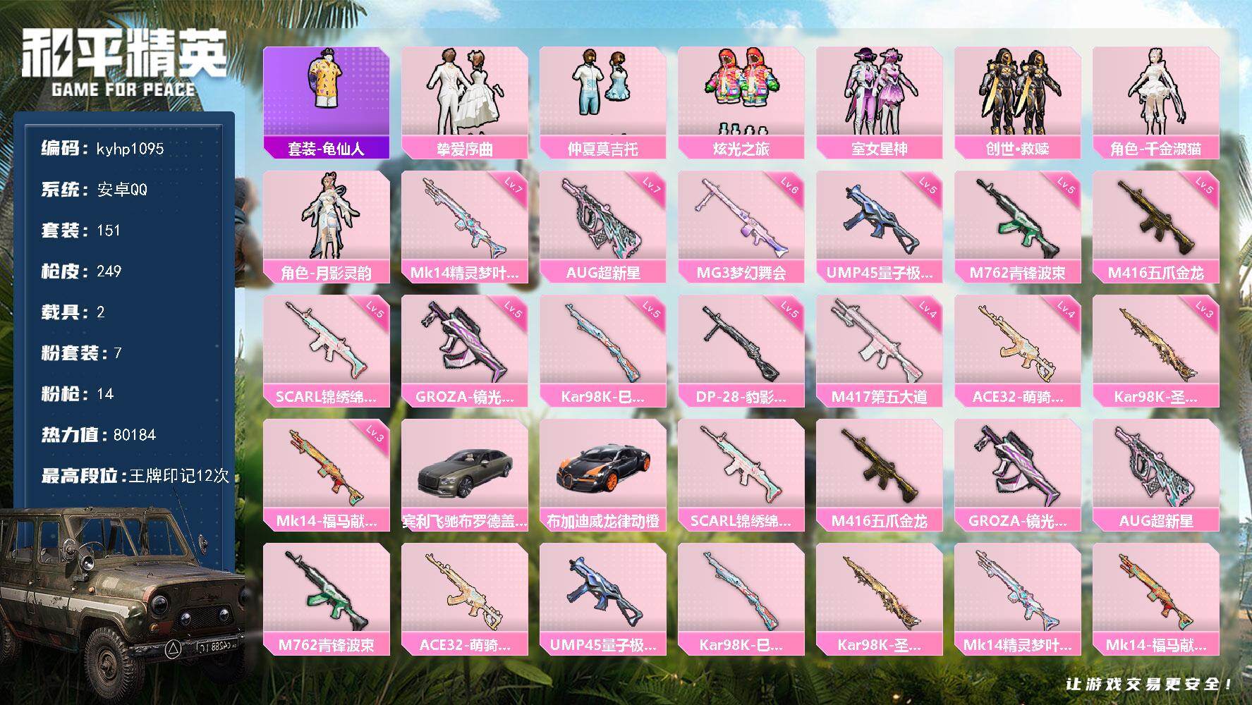 PX_2544274--5粉装-4特效枪-0载具-4粉色飞行器-36823热力值-5王牌印记-82套装-127枪皮 【热门品类】:角色-军刀雅典娜,角色-忠猛周仓,角色-Mark.06,大砍刀-青龙偃月刀,撬棍-龙胆亮银枪 【粉色套装】:粉装-金风玉露,粉装-暗夜鎏金,角色-小蓝,角色-花灵,角色-异瞳寒姬 【粉色枪皮等级】:SCAR-L-锦绣绵绵(五级),Kar98K-巳巳如意(五级),DP-28-圣堂