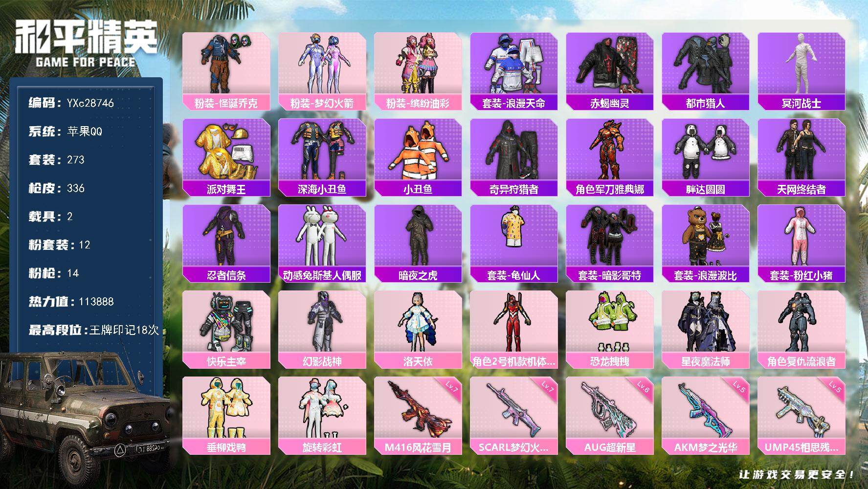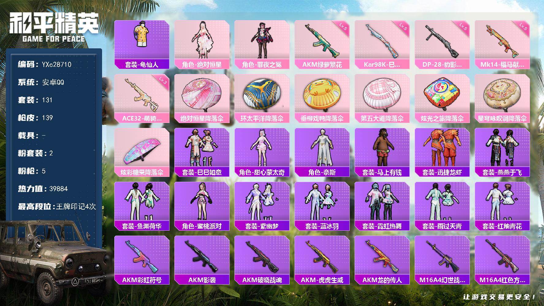 PX_2536347-??,金鞋,放客,满级心之恋语,番茄,双马尾,胖达,满地铁天赋】YXc28716-【无二次】【因赛季更新游戏段付以上号为准!】 ,安卓Q-5稀有2载具11粉装11特效枪18热门239套装309枪皮,,18印记,历史绝世王牌16星, 【5稀有】,AKM-缤纷海域,都市猎人,浪漫天命,派对舞王,派对舞王(金靴子), 【2载具】,兰博轿车灰色,星梦玉骢, 【11粉装】,傲傲奶龙,宝贝奶油派,天使彩虹糖,洛天依,月影灵韵,未来歌姬,幻影战神,绝对恒星,放客神游,粉色回忆,花间之火, 【11特效枪】,SCAR-L-锦绣绵绵,(5级),M416-心之恋语,(7级),AKM-甜心宝贝,(7级),AKS-74U-森灵之息,(5级),Kar98K-巳巳如意,(5级),DP-28-豹影疾电,(5级),AUG-星之彼岸,(4级),M417-第五大道,(3级),M249-绝对恒星,(4级),MG3-洛神天依,(5级),Mk14-福马献瑞,(5级), 【18热门】,小丑鱼,龟仙人,2P战斗服款,红熊茄茄,潮萌小黄鸭,呆萌铁蟹,鹰眼刺客,迅捷狂鲨,深海小丑鱼,胖达圆圆,暗影哥特,粉红小猪,水银刺客,漫步者,破蛋小黄鸡,极速红龙,弄潮海豚,S686-奇异狩猎者, 【2飞行器】,星之彼岸飞行器,镜光幻境飞行翼, 【4头盔】,梦幻火箭头盔,甜心宝贝头盔,深海小丑鱼头盔,花间之火头盔, 【3背包】,梦幻火箭背包,甜心宝贝背包,深海小丑鱼背包,
