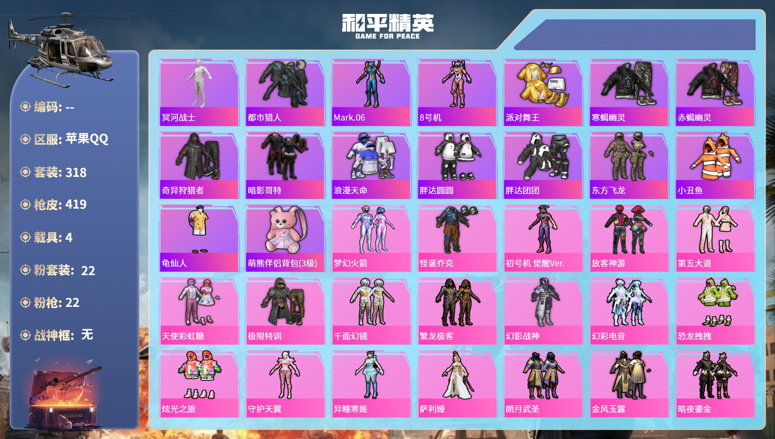 PX_2547498-苹果手Q-18王牌印记-22粉装-22特效枪-4载具-热力值-318套装-419枪皮-1卓越印记-1传奇印记 【22粉装】角色-初号机,觉醒Ver.,套装-创世·救赎,套装-千面幻镜,套装-极限特训,角色-异瞳寒姬,套装-梦幻火箭,套装-星之彼岸,套装-怪诞乔克,套装-第五大道,套装-幻彩电音,套装-朗月武圣,套装-放客神游,套装-天使彩虹糖,套装-恐龙拽拽,套装-炫光之旅,套装-金风玉露,角色-守护天翼,套装-幻影战神,套装-繁龙极客,角色-萨利娅,套装-未来战士,套装-暗夜鎏金 【22特效枪】AKM-梦之光华/7级,M16A4-垂柳戏鸭/5级,破片手榴弹-瓶中星球/7级,Mk14-福马献瑞/5级,M762-青锋波束/5级,Vector-最终圣卫者/3级,M416-墨龙九天/9级,DP-28-豹影疾电/5级,AA12-G-萌骑幻想/5级,UMP45-恐龙拽拽/7级,M416-五爪金龙/2级,MG-36-幻彩电音/7级,SCAR-L-梦幻火箭/6级,UMP45-量子极限/5级,SCAR-L-魔童闹海,哪吒/3级,AKS-74U-无垠阁/3级,蜜獾-异瞳寒姬/4级,M416-电玩时刻/5级,Kar98K-巳巳如意/5级,汤姆逊-热量炸弹/5级,MG-36-沧焰双生/5级,Vector-环太平洋/1级 【16稀有紫装】冥河战士,都市猎人,Mark.06,8号机,派对舞王,寒蝎幽灵,赤蝎幽灵,奇异狩猎者,暗影哥特,浪漫天命,胖达圆圆,胖达团团,东方飞龙,小丑鱼,龟仙人,萌熊伴侣背包(3级) 【4稀有载具】阿斯顿·马丁DBS(红),兰博基尼Aventador,SVJ(翡翠绿),合金龙骨(蓝),黑曜夜骑 【318稀有时装】梦幻火箭,怪诞乔克,初号机,觉醒Ver.,放客神游,第五大道,天使彩虹糖,极限特训,千面幻镜,繁龙极客,幻影战神,幻彩电音,恐龙拽拽,炫光之旅,创世·幻影,守护天翼,异瞳寒姬,萨利娅,朗月武圣,金风玉露,暗夜鎏金,创世·救赎,未来战士,星之彼岸,都市猎人,胖达团团,浪漫天命,寒蝎幽灵,奇异狩猎者,龟仙人,Mark.06,暗影哥特,小丑鱼,东方飞龙,8号机,胖达圆圆,赤蝎幽灵,冥河战士,派对舞王,暗夜行者,激萌罗小黑,狂战萌兔,狂沙舞者,Alan,Walker,怪兽之王,黄金大亨,萌趣咩咩,海上生明月,龙魂突击队,小熊娃娃,原力风暴,异域银装,纯白跃动,狂花道·娜可露露,都市丽猫,摩登魅猫,绒宝小鹅,神气赞萌露比,街头风暴,星途旅人,冰河战士,鱼渊荷华,创世·追猎,青团波波,大橘大利,燕燕于飞,达芬奇,战术大师,智谋强哥,紫俏灵猫,雏菊兔兔,马上有钱,糖糖葫芦,香桃花海,萌主吾皇,蝶变,巳巳如意,霓彩节奏,镭金极速,粉恋花,曼妙人鱼,棉花软糖,元素星魂,午间小调,彩虹兔,琴音绮想,极速光影,霓虹热舞,雪绒豹,画境星梦,星影赞美诗,朱霞炽焰,狂鲨锋刃,游乐,凌霄紫焰,粉黛兰香,擎苍青焰,炫彩糖果,绯色魅影,萌鸡速递,小鸟芋圆,元气之梦,书海巡游,风迹短诗,薄荷星砂,秘语星愿,蓝海鲸歌,云朵鹅,顶瓜瓜,冰公主,雪国风尚,蓝冰羽,恋语绒绒,青翼流星,紫幽梦,SS35特训,不羁荧光,SS29特训,萝兰蝴蝶,Alan,Walker电音教主,SS31特训,SS33特训,皇家花园,SS32特训,双彩绵绵,SS16特训,华灯初上,无暇誓言,SS36特训,贝斯之夜,焰鹰斗篷,英勇保护者,军械专家,魂电,彩霞狙击,童真绒兔,云丝凤蟒,新侠客行,纯白誓言,豚鼠丹丹,雪兔飞飞,都市漫游者,虎虎生威吉莉,龙的传人,军刀雅典娜,甜梦熊熊,智慧之神,果汁能量,白熊同盟,青玉碎影,萌黄之夏,隐空刺,SS37特训,SS28特训,特训学院,猎鹰,青年教官,橘黑制服,浓情蜜辣,蓝色运动,雪晶战甲,黄色伏地魔,白色伏地魔,冰川格斗者,酒红色名流,黄色名流,酷潮明星,绯格组合,涂山之恋,SS26特训,漫步者,空岛之星,荧惑魅影,热情海星,黑色伏地魔,黎明保卫者,纯真浪花,SS34特训,竞技名士,蓝色守护者,深蓝色名流,猛禽,SS30特训,长空猛禽,特战装甲,旭日情侣,六六大吉,甜蜜告白,街头潮人,冥星暗影,惊鸿侠骨,魅力单车,灼焰舞者,青羽突袭者,春光漫游,水银刺客,战地领军,传奇侦探,浪漫假日,极地朋克,贵族骑装,战地督导,甜蜜菠萝,红红火火,街舞之王,青涩时光,青春校园,牛气满满,娇憨猪猪,风暴特警,春日漫步,冰川特警,潮流先锋,雷霆特警,龙腾端午,夏雨游龙,燃烧卡路里,幻影公爵,滨海假日,荷畔雨呱,狙击之神,沙漠毒蛇,红釉青花,麻辣教官,鹰眼刺客,雨过天青,沙暴袭击者,苍穹猎鹰,福马献瑞,冰冻风暴,冷酷挑战者,完美偶像,SS11特训,幽夜迷踪,幻影武者,梦魇先生,破蛋小黄鸡,疯狂小兔子,摇滚舞王,圣诞大吉,特战英豪,快闪甜心,诡谋托雷基亚,绮丽涂鸦,格斗专家,坚韧舞者,竞技达人朋克,野性战心,原初圣火,逆风勇士,海岛探路者,精神漫游,酷蜜狂潮,破晓战魂,娴静芝兰,和煦暖阳,霓虹街区,田园牧歌,轻风白浪,沙漠兵团,镭射皇者,耀粉歌者,SS12特训,白啸长虹,SS27特训,牛气冲天,情公主,SS18特训,银白舞王,清新柠檬,苍岚星,SS13特训,飞行日记,SS17特训,胡桃卫兵,瑞龙福将,团圆交子,金耀舞者,蓝调潮人,霓虹极客,空投萌叽,光之冒险,SS20特训,SS21特训,玉兔迎春,深海梦境,SS22特训,SS23特训,摩登艾咪,夏日倾情,甜蜜熊情侣,缤纷果语,莱茵河畔,灿烂千阳,迪迦奥特曼,神气柴柴,灵蜜圈圈,忍者信条,欧布奥特曼,妙红点点,捷德奥特曼,幻彩翩翩,格斗先锋,幻羽潜行,海盐绵绵冰,老实芭蕉,吉莉礼服,旷野奇兵,王牌教练,荣耀,柠萌假日,SS24特训,鹤鸣,懵萌河马,短笛,SS25特训,快乐星愿,锦衣飞扬,星梦畅游 【420稀有枪械】M416-墨龙九天/9级,SCAR-L-魔童闹海,哪吒/3级,Vector-最终圣卫者/3级,AKS-74U-无垠阁/3级,M416-五爪金龙/2级,M416-电玩时刻/5级,AKM-梦之光华/7级,SCAR-L-梦幻火箭/6级,M16A4-垂柳戏鸭/5级,M762-青锋波束/5级,Kar98K-巳巳如意/5级,Mk14-福马献瑞/5级,UMP45-量子极限/5级,UMP45-恐龙拽拽