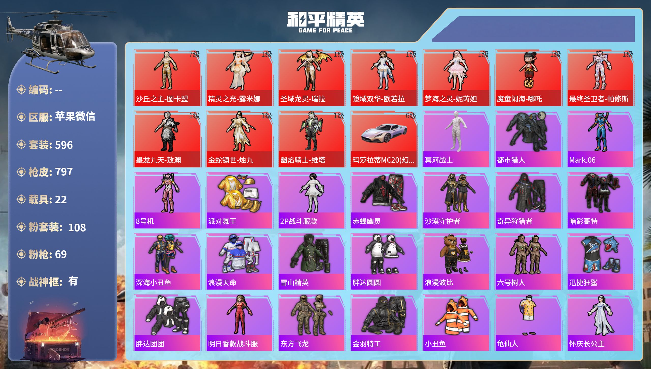PX_2550114-苹果微信-36王牌印记-有战神框-11红装-108粉装-69特效枪-22载具-热力值-596套装-797枪皮-5卓越印记-2传奇印记 【11红装】镜域双华-欧若拉/1级,精灵之光-露米娜/1级,最终圣卫者-帕修斯/1级,梦海之灵-妮芮妲/1级,沙丘之主-图卡盟/7级,圣域龙灵-瑞拉/1级,金蛇镇世-烛九/1级,霜月狼主-尼诺/1级,幽焰骑士-维塔/1级,墨龙九天-敖渊/1级,魔童闹海-哪吒/1级 【108粉装】套装-幻影飞狐,套装-天使彩虹糖,套装-童趣迷兔,套装-深海曼妙,套装-御兔特攻,套装-碧影闪光,套装-缤纷油彩,角色-樱桃泡泡,套装-冰霜白皇,套装-琉璃脉冲,套装-紫电风暴,角色-绯穹魔姬,角色-2号机款机体服,套装-未来战士,套装-怪诞乔克,套装-草莓生巧,角色-闪耀迪迦,套装-诡面斩,套装-甜心巧克力,套装-锦绣火鲤,套装-潮汐统领,套装-金风玉露,套装-山涧鹿灵,套装-暗夜鎏金,套装-未来领航者,角色-小可学妹,角色-猩猩队长,套装-青葱仙萝,角色-星云暗核,套装-极致幻想,套装-幻彩马卡龙,角色-晶梦幻蝶,套装-雪国幻梦,玩偶服-猪猪侠,套装-香水柠檬,人物-小舞·灵珑,套装-放客神游,套装-甜梦小狐,角色-守护天翼,角色-初号机款机体服,套装-梦幻火箭,人物-小舞·雪昙,角色-金域紫灵,套装-霞光圣骑,套装-薄荷物语,套装-星夜魔法师,套装-冰川幽秘,套装-宝贝奶油派,套装-妙趣可丽,套装-极限特训,角色-紫钛骑兵,角色-呆萌星弥,套装-花间之火,角色-冰炎战车,套装-彩虹甜喵,套装-暖熊萌萌,套装-桀骜红莲,角色-电波星,套装-炎氏战神,套装-极意拳锋,角色-白勺歌姬,角色-初号机,觉醒Ver.,超级赛亚人-贝吉塔,套装-馨动时刻,套装-暗夜玫瑰,套装-幻影战神,套装-镜光幻境,套装-苔丝玫瑰,套装-炙焰红王,套装-闲梦青缨,人物-小舞,角色-万古烈焰,套装-千面幻镜,角色-宙之时溯,超级赛亚人-孙悟空,套装-酣梦娃娃,套装-银刃赛罗,套装-赤焰黑爵,角色-冰域雷影,套装-寒光使者,套装-精灵娃娃,角色-绝对恒星,套装-冰川粉黛,套装-星之信仰,套装-彩装战姬,套装-虎啸骄阳,套装-炙焰赤龙,角色-千金淑猫,套装-蜜桃特工,套装-暖暖奶龙,套装-林间仙鹿,角色-熔岩统帅,套装-相思残雪,套装-冰川红玫,套装-音爆索尼克,人物-小舞·恋语,套装-独舞天鹅,套装-未来歌姬,套装-盖世英雄,角色-狂魅哈莉,套装-彩虹鹿灵,套装-金属狂野,角色-洛天依,套装-第五大道,套装-葫芦兄弟,角色-歌者泠鸢,套装-冠军兔兔,套装-飓风飞鹰 【69特效枪】P90-金丰海韵/1级,M249-彩虹甜喵/1级,M762-甜蜜誓约/1级,AKS-74U-无垠阁/9级,P90-魔童闹海,敖丙/1级,SCAR-L-金蛇镇世/9级,Vector-红伞翩翩/7级,UZI-畅跳缤纷/5级,SLR-暗夜玫瑰/1级,M417-第五大道/5级,MG3-洛神天依/7级,Mk14-福马献瑞/5级,DP-28-豹影疾电/1级,破片手榴弹-粉粉猫爪/1级,M416-心之恋语/1级,Kar98K-圣域龙灵/1级,GROZA-香水柠檬/7级,GROZA-精灵之光/1级,M249-古战神甲/1级,M416-全功率超战/2级,UMP45-玉魂晶魄/1级,AWM-花间之火/7级,UMP45-相思残雪/1级,M24-莲影清波/1级,SCAR-L-梦幻火箭/1级,AUG-星梦奇缘/9级,AMR-鸢尾晶梦/7级,M24-星之信仰/6级,M416-暖熊萌萌/1级,P90-沙丘之主/9级,DBS-幻影飞狐/1级,VSS-烈焰拳霸/1级,Vector-灵感创作师/1级,AKM-炫紫旋律/2级,M416-墨龙九天/1级,SPAS-12-音爆索尼克/7级,Kar98K-巳巳如意/5级,UMP45-霜月狼主/3级,DP-28-千金淑猫/7级,P90-甜蜜草莓/1级,M24-镜域双华/1级,M200-梦海之灵/3级,燃烧瓶-薄荷可可/6级,Vector-最终圣卫者/1级,ACE32-萌骑漫游/5级,AKM-甜心宝贝/7级,UMP45-雪国精灵/7级,M416-至情至圣/9级,DP-28-金蝉行者/1级,M16A4-葫芦兄弟/5级,SCAR-L-天蓬元帅/1级,SCAR-L-童趣迷兔/1级,MG-36-沧焰双生/5级,DP-28-扶摇飞仙/1级,AUG-妙趣可丽/1级,SCAR-L-万古烈焰/3级,M762-冷魅冰骑/7级,AKS-74U-信仰神谕/1级,破片手榴弹-招财进宝/7级,Kar98K-未来歌姬/5级,M249-绝对恒星/7级,Kar98K-伏魔团/1级,Vector-环太平洋/1级,M416-五爪金龙/2级,UMP45-宇宙意志/1级,PKM-萌骑夺宝/2级,DP-28-暗夜鎏金/1级,平底锅-林间仙鹿/6级,烟雾弹-猫咪绅士/4级 【31稀有紫装】冥河战士,巡查衣,都市猎人,Mark.06,8号机,派对舞王,2P战斗服款,赤蝎幽灵,沙漠守护者,奇异狩猎者,暗影哥特,深海小丑鱼,浪漫天命,雪山精英,胖达圆圆,浪漫波比,六号树人,迅捷狂鲨,胖达团团,明日香款战斗服,东方飞龙,金羽特工,小丑鱼,龟仙人,怀庆长公主,临安公主,暗夜魅影,萌熊伴侣背包(3级),零款战斗服,真理款战斗服,真嗣款战斗服 【22稀有载具】玛莎拉蒂MC20(幻星粉)/6级,玛莎拉蒂Ghibli(金),乔治·巴顿战车(辉煌金),阿斯顿·马丁DBX(金),兰博基尼URUS(尊享铂),特斯拉Model,X(奇幻紫),南瓜骑士,兰博基尼Aventador,SVJ(炫光金),合金龙骨(红),暮色幽蹄,霜月冰狼,九霄玄鹿,护世瑞兽,星梦玉骢,晶梦灵驹,赤兔,照夜玉狮子,冰绡玉鳞,双人摩托-梦幻火箭,布尔玛摩托车,疾风龙骑,鬼马风驰 【1僚机】空客H135-恋语之翼 【592稀有时装】图卡盟/7级,露米娜/1级,瑞拉/1级,妮芮妲/1级,哪吒/1级,欧若拉/1级,尼诺/1级,帕修斯/1级,敖渊/1级,烛九/1级,维塔/1级,雪国幻梦,甜心巧克力,梦幻火箭,怪诞乔克,初号机款机体服,初号机,觉醒Ver.,2号机款机体服,缤纷油彩,放客神游,第五大道,白勺歌姬,狂魅哈莉,闪耀迪迦,宝贝奶油派,天使彩虹糖,花间之火,童趣迷兔,洛天依,星之信仰,极限特训,小舞·灵珑,小舞·雪昙,小舞,小舞·恋语,晶梦幻蝶,千面幻镜,小可学妹,千金淑猫,草莓生巧,暖熊萌萌,馨动时刻,极致幻想,樱桃泡泡,彩虹甜喵,彩虹鹿灵,幻影战神,绯穹魔姬,绝对恒星,电波