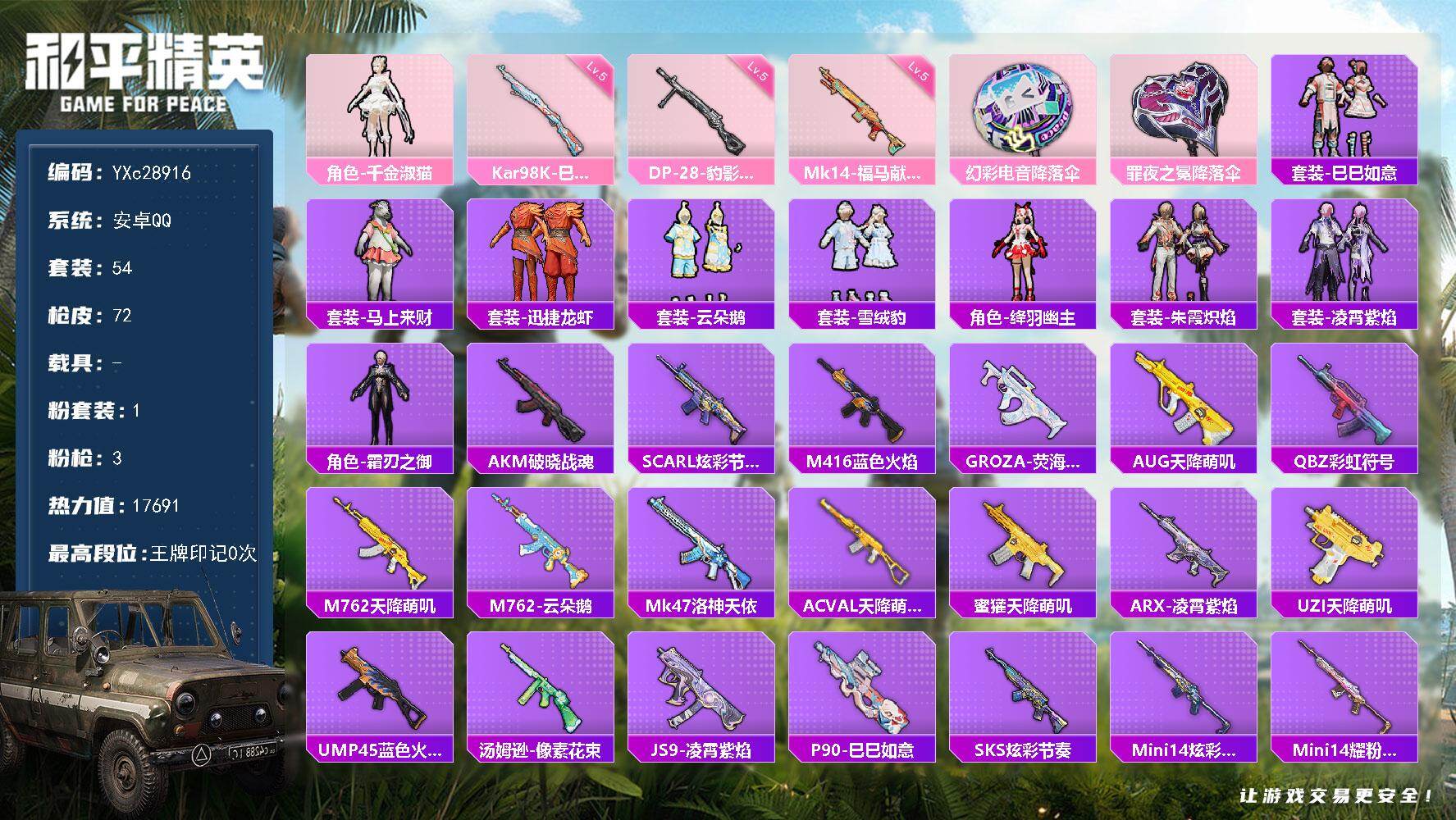 PX_2532854-,安卓手Q-2王牌印记-3粉装-5特效枪-1载具-37586热力值-77套装-123枪皮 【3粉装】套装-向日葵,套装-闪光银龙,套装-天禅智恒 【5特效枪】DP-28-豹影疾电/5级,M762-甜蜜誓约/7级,AA12-G-萌骑幻想/4级,ACE32-萌骑漫游/2级,UMP45-萌骑冒险/2级 【5稀有紫装】沙漠守护者,暗影哥特,雪山精英,胖达团团,龟仙人 【1稀有载具】合金龙骨(绿) 【76稀有时装】天禅智恒,向日葵,闪光银龙,沙漠守护者,胖达团团,龟仙人,雪山精英,暗影哥特,大橘为重,海上生明月,香桃花海,萌鸡速递,元气之梦,薄荷星砂,SS35特训,机械征服者,SS16特训,无暇誓言,SS36特训,红酒骑士,福星高照,暗夜契约,纯白誓言,都市漫游者,PEC最牛战神,SS37特训,特训学院,猎鹰,红色运动,白月香洋装,绯格组合,SS34特训,竞技名士,荷鲁斯之眼,长空猛禽,特战装甲,怒火燎原,魅力单车,贵族骑装,幻世战舞者,牛气满满,狙击之神,红釉青花,雨过天青,完美偶像,SS11特训,幻影武者,破蛋小黄鸡,疯狂小兔子,玄武圣者,蓝彩潮人,玲珑飞花,逆风勇士,萌趣颜团子,SS10特训,耀粉歌者,风华少年志,探宝勇士,SS12特训,SS18特训,治愈之星,科技之星,SS13特训,飞行日记,SS17特训,SS21特训,SS23特训,呆萌铁蟹,SS14特训,海盐绵绵冰,老实芭蕉,吉莉礼服,SS24特训,SS25特训,SS15特训,舞夜骑士 【123稀有枪械】M762-甜蜜誓约/7级,UMP45-萌骑冒险/2级,DP-28-豹影疾电/5级,ACE32-萌骑漫游/2级,AA12-G-萌骑幻想/4级,GROZA-海盐豹豹,Mk14-冰河战士,M16A4-冰河战士,Mini14-鸡智如我,M249-绯穹魔姬,AKS-74U-乌木金纹,AKM-涂鸦街区,Mk14-薄荷星砂,MG-36-薄荷星砂,M416-神秘黑猫,M416-月影鸳鸯,AKM-四圣焕新,AKM-生命誓言,AKM-破晓战魂,AKM-龙的传人,AKM-玉龙,AKM-沙漠守护者,SCAR-L-玉兔迎春,SCAR-L-甜蜜誓约,SCAR-L-繁花小夜曲,SCAR-L-炫彩节奏,SCAR-L-生命誓言,M16A4-机械英豪,M16A4-幻世战舞者,M16A4-乌木金纹,GROZA-乌木金纹,GROZA-彩虹符号,GROZA-治愈之星,AUG-耀粉歌者,AUG-PEC最牛战神,AUG-天降萌叽,QBZ-原初圣火,QBZ-乌木金纹,QBZ-彩虹符号,M762-乌木金纹,M762-牛气冲天,M762-奇异狩猎者,M762-天降萌叽,Mk47-乌木金纹,G36C-不夜海上花,G36C-乌木金纹,Kar98K-乌木金纹,Kar98K-PEC最牛战神,Kar98K-古堡领主,Kar98K-幻影战神,M24-动感兔斯基,M24-影袭,M24-奇异狩猎者,M24-治愈之星,AWM-天降萌叽,AWM-乌木金纹,AWM-不夜海上花,AWM-王牌四分卫,Win94-机械英豪,莫辛纳甘-乌木金纹,AMR-乌木金纹,SKS-炫彩节奏,VSS-乌木金纹,VSS-繁花小夜曲,Mini14-生命誓言,Mini14-原初圣火,Mini14-耀粉歌者,Mini14-炫彩节奏,Mk14-治愈之星,Mk14-乌木金纹,SLR-PEC最牛战神,SLR-沙漠守护者,SLR-四圣焕新,QBU-不夜海上花,UZI-炫彩节奏,UZI-乌木金纹,UZI-古堡领主,UMP45-蓝色火焰,UMP45-生命誓言,UMP45-乌木金纹,UMP45-春暖花开,Vector-乌木金纹,Vector-生命誓言,Vector-彩虹符号,Vector-治愈之星,汤姆逊-耀粉歌者,汤姆逊-天降萌叽,汤姆逊-乌木金纹,野牛-乌木金纹,野牛-机械英豪,MP5K-甜蜜誓约,MP5K-乌木金纹,P90-乌木金纹,S686-不夜海上花,S686-奇异狩猎者,S686-生命誓言,S1897-乌木金纹,S12K-幻世战舞者,S12K-机械英豪,DBS-彩虹符号,M249-乌木金纹,M249-古堡领主,DP-28-彩虹符号,DP-28-乌木金纹,DP-28-沙漠守护者,DP-28-原初圣火,MG3-幻世战舞者,P18C-原初圣火,大砍刀-粉色回忆,平底锅-原初圣火,平底锅-机械英豪,平底锅-治愈之星,平底锅-伏魔团,平底锅-不夜海上花,ACE32-冰晶雪宝,M16A4-雨过天青,GROZA-福马献瑞,AMR-雨过天青,SLR-乌木金纹,AA12-G-雨过天青,PKM-雨过天青,沙漠之鹰-雨过天青,汤姆逊-像素花束 【3稀有飞行器】粉色滑翔尾迹,红色滑翔尾迹,古堡领主飞行器 【17稀有背包】心之恋语背包(3级),暖熊萌萌背包(3级),狂鲨锋刃背包(3级),不夜海上花背包(3级),沙漠守护者背包(3级),炫彩节奏背包(3级),PEC最牛战神背包(3级),繁花小夜曲背包(3级),福马献瑞背包(3级),SS11赛季背包(3级),甜蜜誓约背包(3级),四圣焕新背包(3级),SS10赛季背包(3级),古堡领主背包(3级),玉兔迎春背包(3级),冰河战士背包(3级),春暖花开背包(3级) 【32稀有降落伞】雨过天青降落伞,SS34王牌降落伞,竞逐热浪降落伞,欢乐麻酱降落伞,PEC最牛战神降落伞,紫菱降落伞,心之恋语降落伞,神秘科技降落伞,钢铁雄心降落伞,牛气冲天降落伞,青羽降落伞,普通降落伞,沙漠守护者降落伞,神秘黑猫降落伞,跑卡漂移降落伞,迷雾突击降落伞,甜蜜誓约降落伞,寂夜之火降落伞,原初圣火降落伞,垂柳戏鸭降落伞,伏魔团降落伞,光影工厂降落伞,机械英豪降落伞,暖熊萌萌降落伞,幻影战神降落伞,四圣焕新降落伞,治愈之星降落伞,古堡领主降落伞,王牌四分卫降落伞,不夜海上花降落伞,幻世战舞者降落伞,繁花小夜曲降落伞 【13稀有头盔】幻影战神头盔(3级),薄荷星砂头盔(3级),雨过天青头盔(3级),甜蜜誓约头盔(3级),垂柳戏鸭头盔(3级),古堡领主头盔(3级),福马献瑞头盔(3级),沙漠守护者头盔(3级),神秘黑猫头盔(3级),心之恋语头盔(3级),浪客战士头盔(3级),PEC最牛战神头盔(3级),神秘黑猫头盔(3级)