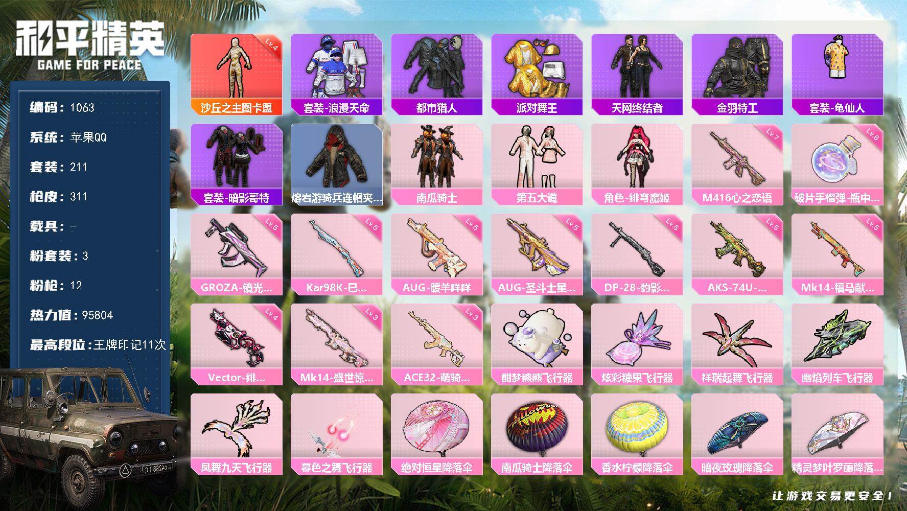 PX_2533358-,苹果手Q-20王牌印记-有战神框-8粉装-12特效枪-90873热力值-216套装-287枪皮-6卓越印记-6传奇印记 【8粉装】角色-阿尔茜,套装-蝶舞迷情,玩偶服-猪猪侠,套装-极限特训,套装-梦幻火箭,角色-月影灵韵,套装-创世·救赎,套装-绚金战神 【12特效枪】AUG-星之彼岸/7级,AKM-梦之光华/7级,Mk14-福马献瑞/5级,Kar98K-创世·救赎/5级,AUG-暖羊咩咩/5级,AKS-74U-森灵之息/5级,ACE32-萌骑漫游/5级,DP-28-豹影疾电/5级,MG-36-沧焰双生/5级,Kar98K-巳巳如意/5级,SCAR-L-锦绣绵绵/5级,M416-五爪金龙/7级 【13稀有紫装】都市猎人,Mark.06,派对舞王,寒蝎幽灵,奇异狩猎者,暗影哥特,深海小丑鱼,浪漫天命,胖达团团,东方飞龙,金羽特工,小丑鱼,龟仙人 【216稀有时装】梦幻火箭,蝶舞迷情,极限特训,绚金战神,猪猪侠,阿尔茜,创世·幻影,月影灵韵,创世·救赎,迅捷龙虾,六号稻草人,都市猎人,胖达团团,浪漫天命,寒蝎幽灵,奇异狩猎者,龟仙人,Mark.06,暗影哥特,深海小丑鱼,小丑鱼,东方飞龙,金羽特工,派对舞王,激萌罗小黑,动感兔斯基人偶服,狂战萌兔,狂沙舞者,Alan,Walker,萌神柯基,申公豹,滑板小狐,萌趣咩咩,龙魂突击队,,暗影刺翼,都市丽猫,神气赞萌露比,街头风暴,星途旅人,光矢逐梦,冰河战士,鱼渊荷华,俏兔智灵,创世·追猎,青团波波,大橘大利,燕燕于飞,战术大师,智谋强哥,雏菊兔兔,马上有钱,糖糖葫芦,香桃花海,蝶变,巳巳如意,粉恋花,曼妙人鱼,棉花软糖,午间小调,彩虹兔,琴音绮想,雪绒豹,画境星梦,朱霞炽焰,游乐,凌霄紫焰,擎苍青焰,炫彩糖果,小鸟芋圆,书海巡游,风迹短诗,薄荷星砂,秘语星愿,云朵鹅,蓝冰羽,恋语绒绒,紫幽梦,SS35特训,SS29特训,萝兰蝴蝶,SS31特训,SS33特训,SS32特训,SS16特训,SS36特训,贝斯之夜,沙丘之歌,焰鹰斗篷,军械专家,菲菲,炫光向阳,福星高照,虎虎生威吉莉,夏日音浪,龙的传人,白熊同盟,萌黄之夏,SS37特训,SS28特训,恶魔宝贝,特训学院,飞驰魅影,白色伏地魔,音速流光,活力之心,帅气教官,酒红色名流,阳光火鸡,湖蓝色名流,酷潮明星,绯格组合,SS26特训,漫步者,空岛之星,热情海星,黑色伏地魔,炫蓝之夏,纯真浪花,SS34特训,骑行爱好者,竞技名士,蓝色守护者,猛禽,SS30特训,长空猛禽,特战装甲,旭日情侣,怒火燎原,惊鸿侠骨,魅力单车,春光漫游,水银刺客,猎梦纪元,甜心亚梦,虚音幻奏,极地朋克,幻世战舞者,街舞达人,青涩时光,牛气满满,迎春赐吉,娇憨猪猪,春日漫步,冰川特警,幻影公爵,狙击之神,红釉青花,麻辣教官,鹰眼刺客,雨过天青,福马献瑞,冰冻风暴,冷酷挑战者,完美偶像,幽夜迷踪,破蛋小黄鸡,摇滚战魂,摇滚舞王,特战英豪,快闪甜心,蓝彩潮人,绮丽涂鸦,耀眼新星,淡雅花蕊,野性战心,玲珑飞花,超能勇士,海岛探路者,破晓战魂,霓虹街区,探宝勇士,SS27特训,牛气冲天,情公主,SS18特训,治愈之星,科技之星,飞行日记,SS17特训,竞技角斗士,瑞龙福将,团圆交子,金耀舞者,SS19特训,光之冒险,SS20特训,SS21特训,玉兔迎春,弄潮海豚,SS22特训,SS23特训,呆萌铁蟹,浪漫樱花,夏日倾情,缤纷果语,莱茵河畔,SS14特训,白兰地假日,神气柴柴,妙红点点,幻彩翩翩,格斗先锋,幻羽潜行,海盐绵绵冰,老实芭蕉,刚毅裁决者,王牌教练,柠萌假日,SS24特训,鹤鸣,懵萌河马,SS25特训,快乐星愿,锦衣飞扬,星梦畅游,SS15特训 【287稀有枪械】M416-五爪金龙/7级,AKM-梦之光华/7级,SCAR-L-锦绣绵绵/5级,AUG-暖羊咩咩/5级,AUG-星之彼岸/7级,Kar98K-巳巳如意/5级,Kar98K-创世·救赎/5级,Mk14-福马献瑞/5级,DP-28-豹影疾电/5级,ACE32-萌骑漫游/5级,MG-36-沧焰双生/5级,AKS-74U-森灵之息/5级,M249-萌萌彩虹球,QBZ-纯真浪花,AWM-纯真浪花,汤姆逊-纯真浪花,DBS-乌木金纹,AA12-G-纯真浪花,平底锅-纯真浪花,P1911-创世·救赎,Vector-创世·救赎,DBS-创世·救赎,QBZ-萌萌彩虹球,SCAR-L-海盐豹豹,GROZA-海盐豹豹,野牛-雏菊兔兔,Mk14-冰河战士,平底锅-雏菊兔兔,M762-雏菊兔兔,Mini14-雏菊兔兔,R1895-雏菊兔兔,UZI-冰河战士,M16A4-冰河战士,MK20-H-乌木金纹,DBS-风迹短诗,莫辛纳甘-风迹短诗,Mini14-鸡智如我,Win94-乌木金纹,MK12-风迹短诗,MK12-乌木金纹,破片手榴弹-爆破雪人,AKS-74U-极光猎影,PKM-紫幽梦,MG3-霓彩脉冲,ACE32-画境星梦,M1加兰德-画境星梦,MP5K-画境星梦,Mk14-紫幽梦,蜜獾-乌木金纹,M762-云朵鹅,S1897-紫幽梦,SVD-云朵鹅,P92-紫幽梦,SPAS-12-狂鲨锋刃,MK20-H-狂鲨锋刃,铝热弹-炫彩糖果,UZI-炫彩糖果,AA12-G-画境星梦,G36C-星穹咏叹调,平底锅-画境星梦,Mk47-风迹短诗,JS9-凌霄紫焰,MG-36-凌霄紫焰,平底锅-紫幽梦,燃烧瓶-甜梦桃焰,破片手榴弹-海盐豹豹,UMP45-海盐豹豹,ARX-凌霄紫焰,AKS-74U-乌木金纹,蜜獾-风迹短诗,P92-凌霄紫焰,Famas-乌木金纹,SPAS-12-云朵鹅,M249-无面战甲,S1897-糯团青竹,平底锅-凌霄紫焰,Mk14-薄荷星砂,沙漠之鹰-云朵鹅,TMP-9-雪月幻音,烟雾弹-冰氧夏日,AKS-74U-粉粉喵呜,MG-36-薄荷星砂,大砍刀-云朵鹅,PKM-啾咪啾咪,平底锅-属我最6,AC-VAL-六号稻草人,M200-六号稻草人,S12K-霓彩脉冲,AKM-霓彩脉冲,SKS-圣域龙灵,M416-红色方程式,M416-糯团青竹,M416-滑板小狐,AKM-影袭,AKM-夜灯,AKM-生命誓言,AKM-星之彼岸,AKM-春暖花开,AKM-龙的传人,AKM-虎虎生威,AKM-霓虹街区,SCAR-L-红色方程式,SCAR-L-玉兔迎春,SCAR-L-黄金龙骨,SCAR-L-炫彩节奏,M16A4-红色方程式,M16A4-幻世战舞者,M16A4-甜心亚梦,GROZA-春暖花开,GROZA-恐龙拽拽,GROZA-影袭,GROZA-懵萌河马,GROZA-治愈之星,AUG-耀粉歌者,AUG-甜蜜菠萝,AUG-青春冒险家,AUG-天降萌叽,QBZ-飞驰魅影,QBZ-赛罗,M762-瑞龙福将,M762-绒雪飘舞,M762-天降萌叽,Mk47-乌