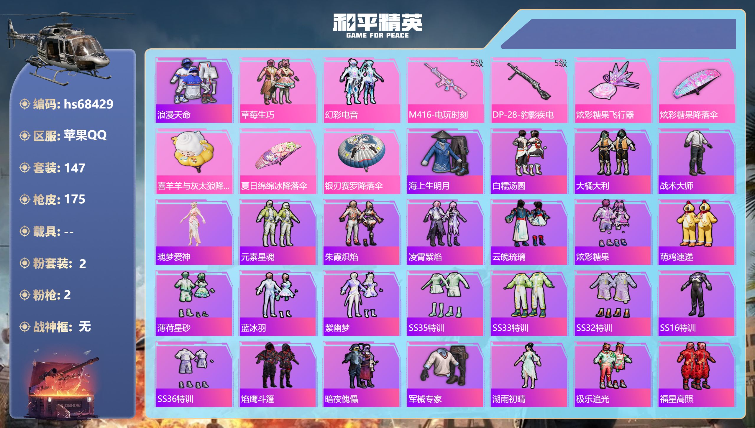 PX_2553703-?0违规-萌熊背包-地铁满天赋-素材号-和平火影连体-兔兔白日梦-浪漫天命-派对舞王-深海小丑鱼-胖达圆圆-暗影哥特-糯粉咩咩安卓,微信-0粉装-5特效枪-0载具-1粉色飞行器-26346热力值-3王牌印记-74套装-95枪皮 【热门品类】:套装-浪漫天命,套装-派对舞王,套装-深海小丑鱼,套装-胖达圆圆,套装-暗影哥特,套装-糯粉咩咩 【粉色枪皮等级】:蜜獾-异瞳寒姬(五级),ACE32-萌骑漫游(三级),AKS-74U-森灵之息(五级),Mk14-福马献瑞(五级),DP-28-豹影疾电(五级) 【粉色枪皮】:蜜獾-异瞳寒姬,ACE32-萌骑漫游,AKS-74U-森灵之息,Mk14-福马献瑞,DP-28-豹影疾电 【粉色飞行器】:炫彩糖果飞行器 【粉色降落伞】:晶梦幻蝶降落伞,极意拳锋降落伞,炫彩糖果降落伞 【稀有套装】:套装-超能元气,套装-荧光像素,套装-雪国风尚,套装-炫彩糖果,套装-小财神当家,套装-马上来财,套装-迅捷龙虾,套装-晶灵使者,套装-朱霞炽焰,套装-凌霄紫焰,套装-擎苍青焰,套装-书海巡游,套装-画境星梦,套装-琴音绮想,套装-雨过天青,套装-红釉青花 【稀有枪皮】:AUG-冰晶雪宝,AKM-缤纷海域,SCAR-L-夜灯,M416-红色方程式,GROZA-影袭,AUG-甜蜜菠萝,AUG-耀粉歌者,M762-天降萌叽,M762-登顶巅峰,ACE32-画境星梦,ARX-凌霄紫焰,UZI-影袭,UZI-炫彩节奏,UMP45-夜灯,UMP45-极意拳锋,汤姆逊-幻影战神,汤姆逊-耀粉歌者,汤姆逊-像素花束,MP5K-画境星梦,AKS-74U-荧光像素,JS9-凌霄紫焰,Kar98K-影袭,M24-影袭,AWM-奇迹舞步,SKS-迅猛狂鲨,Mini14-耀粉歌者,AMR-喜羊羊与灰太狼,M1加兰德-画境星梦,S686-生命誓言,S12K-夜灯,AA12-G-画境星梦,PKM-荧光像素,MG-36-凌霄紫焰,P92-凌霄紫焰,突击盾牌-绝对恒星,平底锅-凌霄紫焰,平底锅-画境星梦 【其他套装】:套装-人气偶像,套装-军械专家,套装-旭日情侣,套装-暗影哥特,套装-柠萌假日,套装-浪漫天命,套装-海岛探路者,套装-湖蓝色名流,套装-潮流炫酷,套装-特训学院,套装-狂战萌兔,套装-猎鹰,套装-猛禽,套装-白熊同盟,套装-白色伏地魔,套装-破蛋小黄鸡,套