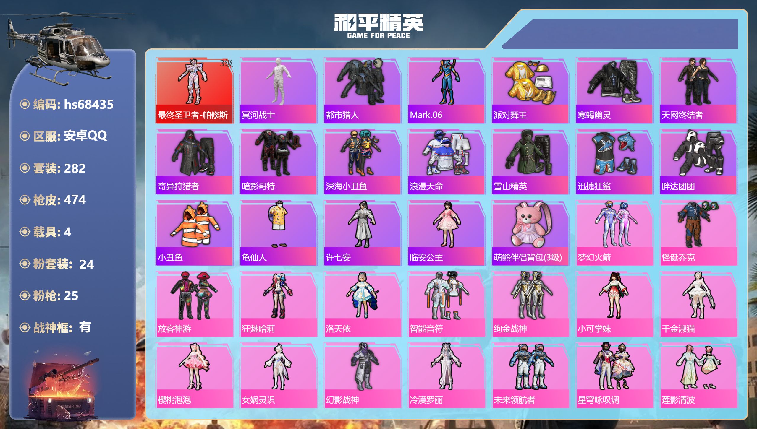 PX_2553788-,安卓手Q-22王牌印记-有战神框-1红装-24粉装-25特效枪-4载具-热力值-282套装-474枪皮-8卓越印记-1传奇印记 【1红装】最终圣卫者-帕修斯/3级 【24粉装】角色-冷漠罗丽,角色-樱桃泡泡,套装-天之羽翼,角色-小可学妹,角色-千金淑猫,套装-粉色回忆,角色-狂魅哈莉,套装-莲影清波,套装-绚金战神,套装-智能音符,套装-桃夭倾城,套装-放客神游,套装-仲夏莫吉托,套装-冰川幽秘,角色-女娲灵识,角色-烟云彩露,套装-怪诞乔克,角色-洛天依,套装-幻影战神,套装-冰川红玫,套装-星穹咏叹调,套装-未来领航者,套装-梦幻火箭,套装-青空秋雨 【25特效枪】Kar98K-巳巳如意/5级,信号枪-金乌曜日/2级,GROZA-焦糖拿铁/5级,AKS-74U-森灵之息/2级,M416-至情至圣/7级,Mk14-福马献瑞/5级,M200-梦海之灵/3级,平底锅-喜羊羊与灰太狼/3级,AUG-星之彼岸/6级,ACE32-萌骑漫游/5级,AUG-暖羊咩咩/5级,GROZA-镜光银凌/5级,MG-36-沧焰双生/5级,Vector-环太平洋/5级,M416-暖熊萌萌/7级,MK12-雪月幻音/4级,DP-28-豹影疾电/5级,SCAR-L-锦绣绵绵/5级,AKS-74U-星穹咏叹调/5级,AKM-绿萝繁花/5级,SCAR-L-金蛇镇世/3级,AMR-智耀战神/4级,破片手榴弹-粉粉猫爪/6级,Mk14-甜梦熊击/5级,AKM-梦之光华/7级 【19稀有紫装】冥河战士,巡查衣,都市猎人,Mark.06,派对舞王,寒蝎幽灵,天网终结者,奇异狩猎者,暗影哥特,深海小丑鱼,浪漫天命,雪山精英,迅捷狂鲨,胖达团团,小丑鱼,龟仙人,许七安,临安公主,萌熊伴侣背包(3级) 【4稀有载具】星河领航(磐石银),仰望U9(赤霞丹朱),保时捷911,敞篷版(星珀红),护世瑞兽 【1僚机】僚机-圣域龙宝 【281稀有时装】帕修斯/3级,梦幻火箭,怪诞乔克,放客神游,狂魅哈莉,洛天依,智能音符,绚金战神,小可学妹,千金淑猫,樱桃泡泡,女娲灵识,幻影战神,冷漠罗丽,创世·幻影,未来领航者,星穹咏叹调,莲影清波,冰川幽秘,冰川红玫,桃夭倾城,青空秋雨,天之羽翼,仲夏莫吉托,粉色回忆,烟云彩露,绝对防御上衣,迅捷龙虾,SS38特训,都市猎人,胖达团团,浪漫天命,寒蝎幽灵,奇异狩猎者,龟仙人,Mark.06,雪山精英,暗影哥特,深海小丑鱼,小丑鱼,迅捷狂鲨,冥河战士,派对舞王,天网终结者,动感兔斯基人偶服,狂战萌兔,狂沙舞者,Alan,Walker,灵符少年,自由猎手,粉雾星云,粉团憨憨,萌趣咩咩,红熊茄茄,海上生明月,龙魂突击队,卖崽青蛙,,暗影刺翼,小熊娃娃,迎夏光舞,鲛海歌灵,异域银装,火种守卫者,幽澜祭司,绒宝小鹅,星渊小夜曲,街头风暴,星途旅人,航行童话,冰河战士,鱼渊荷华,TT战队服,青团波波,大橘大利,燕燕于飞,海琴烟,临安公主,战术大师,智谋强哥,碧波椰影,许七安,雏菊兔兔,马上有钱,糖糖葫芦,香桃花海,蝶变,墨青刃影,巳巳如意,粉恋花,曼妙人鱼,棉花软糖,涂鸦旋风,午间小调,彩虹兔,琴音绮想,极速光影,雪绒豹,画境星梦,星影赞美诗,朱霞炽焰,狂鲨锋刃,阳光菠萝,绛羽幽主,游乐,凌霄紫焰,粉黛兰香,擎苍青焰,炫彩糖果,萌鸡速递,元气之梦,书海巡游,风迹短诗,漫游都市,薄荷星砂,秘语星愿,超感刻度,白光莹,云朵鹅,顶瓜瓜,银尘,雪国风尚,蓝冰羽,恋语绒绒,青翼流星,紫幽梦,SS35特训,SS29特训,萝兰蝴蝶,SS31特训,SS33特训,SS32特训,SS16特训,暴风机械师,时空追击者,明鸳圣池,星际旅行,SS36特训,舰行太空,焰鹰斗篷,英勇保护者,军械专家,福星高照,暗夜契约,纯白誓言,虎虎生威吉莉,夏日音浪,龙的传人,军刀雅典娜,果汁能量,白熊同盟,SS37特训,SS28特训,沁蓝冰爽,极速竞梦,雪晶战甲,飞驰魅影,白色伏地魔,音速流光,阳光火鸡,绯格组合,涂山之恋,SS26特训,漫步者,空岛之星,热情海星,炫蓝之夏,元气发射,纯真浪花,SS34特训,竞技名士,SS30特训,长空猛禽,特战装甲,旭日情侣,街头潮人,怒火燎原,冷焰舞者,惊鸿侠骨,魅力单车,灼焰舞者,春光漫游,水银刺客,猎梦纪元,甜心亚梦,虚音幻奏,极地朋克,贵族骑装,幻世战舞者,青涩时光,牛气满满,娇憨猪猪,春日漫步,冰川特警,龙腾端午,夏雨游龙,幻影公爵,滨海假日,狙击之神,WiFi精灵,红釉青花,麻辣教官,鹰眼刺客,雨过天青,沙暴袭击者,福马献瑞,冰冻风暴,韶华初心,玲珑侠影,冷酷挑战者,灵幻魔术师,完美偶像,幽夜迷踪,青春冒险家,破蛋小黄鸡,潮流游乐家,快闪甜心,梦幻奶油,暗金炫舞,酸甜橘柚,千禧之恋,海岛探路者,幻世保卫者,和煦暖阳,霓虹街区,森林游猎者,田园牧歌,萌趣颜团子,轻风白浪,特种颜团子,沙漠兵团,探宝勇士,SS27特训,牛气冲天,情公主,SS18特训,清新柠檬,SS17特训,瑞龙福将,团圆交子,金耀舞者,绚烂繁星,缤纷焰火,异彩先驱,霓虹极客,空投萌叽,SS19特训,光之冒险,晨曦薄雾,SS20特训,SS21特训,玉兔迎春,弄潮海豚,SS22特训,SS23特训,呆萌铁蟹,夏日倾情,甜蜜熊情侣,缤纷果语,滨海厨神,莱茵河畔,青涩年华,香榭午后,灵蜜圈圈,忍者信条,妙红点点,幻彩翩翩,格斗先锋,幻羽潜行,海盐绵绵冰,老实芭蕉,王牌教练,荣耀,柠萌假日,SS24特训,绚紫流光,SS25特训,快乐星愿,锦衣飞扬,星梦畅游,SS15特训,幽幻花璃 【470稀有枪械】M416-至情至圣/7级,SCAR-L-金蛇镇世/3级,M200-梦海之灵/3级,M416-暖熊萌萌/7级,AKM-梦之光华/7级,AKM-绿萝繁花/5级,SCAR-L-锦绣绵绵/5级,GROZA-镜光银凌/5级,GROZA-焦糖拿铁/5级,AUG-暖羊咩咩/5级,AUG-星之彼岸/6级,Kar98K-巳巳如意/5级,AMR-智耀战神/4级,Mk14-甜梦熊击/5级,Mk14-福马献瑞/5级,Vector-环太平洋/5级,DP-28-豹影疾电/5级,ACE32-萌骑漫游/5级,MG-36-沧焰双生/5级,MK12-雪月幻音/4级,AKS-74U-星穹咏叹调/5级,AKS-74U-森灵之息/2级,信号枪-金乌曜日/2级,破片手榴弹