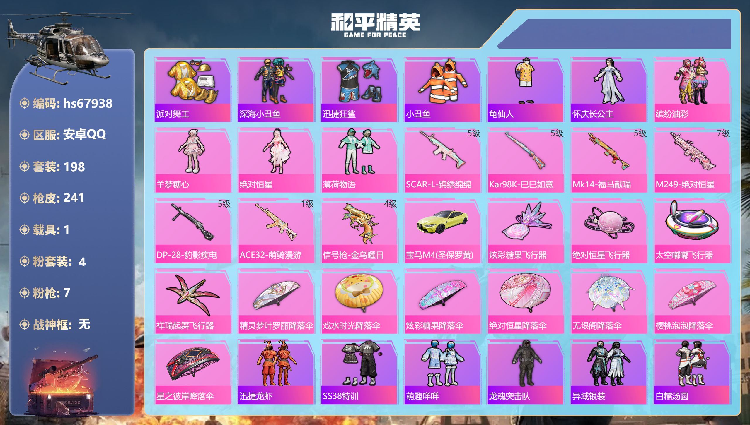 PX_2546739-安卓手Q-8王牌印记-7粉装-9特效枪-88228热力值-214套装-295枪皮-1卓越印记 【7粉装】套装-星之彼岸,套装-雪月幻音,套装-宝贝奶油派,角色-绯穹魔姬,套装-未来歌姬,套装-幻影战神,角色-狂花道·不知火舞 【9特效枪】Mk14-福马献瑞/5级,DP-28-豹影疾电/5级,AKS-74U-星穹咏叹调/6级,ACE32-萌骑漫游/2级,PKM-江南烟雨/6级,M416-电玩时刻/5级,蜜獾-异瞳寒姬/7级,Kar98K-巳巳如意/5级,MG-36-沧焰双生/5级 【6稀有紫装】都市猎人,派对舞王,暗影哥特,深海小丑鱼,浪漫天命,龟仙人 【214稀有时装】宝贝奶油派,幻影战神,绯穹魔姬,狂花道·不知火舞,雪月幻音,未来歌姬,星之彼岸,迅捷龙虾,SS38特训,都市猎人,浪漫天命,龟仙人,暗影哥特,深海小丑鱼,派对舞王,萌趣咩咩,红熊茄茄,龙魂突击队,小熊娃娃,异域银装,都市丽猫,白糯汤圆,星渊小夜曲,街头风暴,星途旅人,光矢逐梦,蜜桃派对,冰河战士,鱼渊荷华,青团波波,拉斐尔,大橘大利,燕燕于飞,NV战队服,战术大师,智谋强哥,听雨铃兰,雏菊兔兔,马上有钱,糖糖葫芦,香桃花海,巳巳如意,粉恋花,曼妙人鱼,棉花软糖,元素星魂,午间小调,琴音绮想,灵公主,画境星梦,星影赞美诗,朱霞炽焰,狂鲨锋刃,游乐,凌霄紫焰,粉黛兰香,云魄琉璃,擎苍青焰,炫彩糖果,萌鸡速递,元气之梦,书海巡游,风迹短诗,漫游都市,薄荷星砂,秘语星愿,顶瓜瓜,银尘,雪国风尚,白辉玉蕊,蓝冰羽,恋语绒绒,青翼流星,紫幽梦,雪夜云雾,SS35特训,SS29特训,萝兰蝴蝶,SS31特训,SS33特训,SS32特训,SS16特训,SS36特训,焰鹰斗篷,军械专家,福星高照,虎虎生威吉莉,夏日音浪,龙的传人,潮流炫酷,白熊同盟,萌黄之夏,SS37特训,蝶吟花词,SS28特训,特训学院,猎鹰,青年教官,橘黑制服,红色运动,黄色运动,蓝色运动,黄色伏地魔,白色伏地魔,热血青春,酒红色名流,阳光火鸡,湖蓝色名流,黄色名流,绯格组合,涂山之恋,漫步者,空岛之星,荧惑魅影,热情海星,黑色伏地魔,黎明保卫者,炫蓝之夏,元气发射,纯真浪花,SS34特训,竞技名士,深蓝色名流,猛禽,SS30特训,长空猛禽,特战装甲,旭日情侣,六六大吉,街头潮人,怒火燎原,冷焰舞者,惊鸿侠骨,魅力单车,灼焰舞者,极地朋克,幻世战舞者,战地督导,青涩时光,牛气满满,娇憨猪猪,风暴特警,春日漫步,冰川特警,幻影公爵,滨海假日,极速红龙,狙击之神,沙漠毒蛇,红釉青花,麻辣教官,鹰眼刺客,雨过天青,福马献瑞,冰冻风暴,玲珑侠影,完美偶像,人气偶像,幻影武者,破蛋小黄鸡,特战英豪,酸甜橘柚,蓝彩潮人,绮丽涂鸦,竞技达人朋克,超能勇士,海岛探路者,精神漫游,破晓战魂,幻世保卫者,和煦暖阳,森林游猎者,田园牧歌,都市魅力,萌趣颜团子,轻风白浪,特种颜团子,耀粉歌者,探宝勇士,奇趣章鱼,牛气冲天,SS18特训,飞行日记,SS17特训,空投萌叽,SS19特训,光之冒险,SS20特训,血色贵族,SS21特训,玉兔迎春,弄潮海豚,SS22特训,SS23特训,夏日倾情,飞狐塔尔斯,甜蜜熊情侣,缤纷果语,滨海厨神,天籁歌者,忍者信条,妙红点点,幻彩翩翩,格斗先锋,幻羽潜行,海盐绵绵冰,吉莉礼服,王牌教练,暗夜之虎,柠萌假日,SS24特训,SS25特训,锦衣飞扬,SS15特训 【297稀有枪械】M416-电玩时刻/5级,Kar98K-巳巳如意/5级,Mk14-福马献瑞/5级,DP-28-豹影疾电/5级,PKM-江南烟雨/6级,蜜獾-异瞳寒姬/7级,ACE32-萌骑漫游/2级,MG-36-沧焰双生/5级,AKS-74U-星穹咏叹调/6级,QBZ-纯真浪花,AWM-纯真浪花,汤姆逊-纯真浪花,DBS-乌木金纹,AA12-G-纯真浪花,平底锅-纯真浪花,Vector-创世·救赎,蜜獾-精灵梦叶罗丽,S1897-精灵梦叶罗丽,SCAR-L-海盐豹豹,平底锅-精灵梦叶罗丽,SLR-极冰使者,野牛-雏菊兔兔,Mk14-冰河战士,AKS-74U-尼罗河传说,平底锅-雏菊兔兔,M762-雏菊兔兔,Mini14-雏菊兔兔,短管霰弹-宇宙意志,Vector-突变脉冲,R1895-雏菊兔兔,UZI-冰河战士,M16A4-冰河战士,MK20-H-乌木金纹,DBS-风迹短诗,莫辛纳甘-风迹短诗,Mini14-鸡智如我,汤姆逊-幻星舰长,Win94-乌木金纹,MK12-风迹短诗,MK12-乌木金纹,破片手榴弹-爆破雪人,PKM-紫幽梦,MG3-霓彩脉冲,R45-幻彩电音,ACE32-画境星梦,M1加兰德-画境星梦,MP5K-画境星梦,Mk14-紫幽梦,M24-幻彩电音,蜜獾-乌木金纹,S1897-紫幽梦,P92-紫幽梦,AWM-绿洲时空,SPAS-12-狂鲨锋刃,M417-玩趣呆呆,MK20-H-狂鲨锋刃,AUG-冰晶雪宝,铝热弹-炫彩糖果,UZI-炫彩糖果,UMP45-绿洲时空,ARX-像素花束,UMP45-极意拳锋,MG3-鸢尾珑雾,大砍刀-像素花束,AA12-G-画境星梦,平底锅-画境星梦,M249-冰晶雪宝,Kar98K-星穹咏叹调,Mk47-风迹短诗,JS9-凌霄紫焰,MG-36-凌霄紫焰,平底锅-紫幽梦,破片手榴弹-海盐豹豹,UMP45-海盐豹豹,ARX-凌霄紫焰,AKS-74U-乌木金纹,蜜獾-风迹短诗,爆炸猎弓-喜羊羊与灰太狼,P92-凌霄紫焰,AMR-喜羊羊与灰太狼,Famas-乌木金纹,Famas-霓彩脉冲,破片手榴弹-拽到爆炸,十字弩-异瞳寒姬,S1897-糯团青竹,平底锅-无垠阁,平底锅-凌霄紫焰,Mk14-薄荷星砂,AKS-74U-鸡智如我,汤姆逊-智耀战神,S12K-智耀战神,TMP-9-雪月幻音,烟雾弹-冰氧夏日,MG3-智耀战神,MG-36-薄荷星砂,PKM-啾咪啾咪,S1897-荧海星豚,DBS-荧海星豚,SVD-霓彩脉冲,SLR-霓彩脉冲,平底锅-属我最6,M200-六号稻草人,蜜獾-绿洲时空,S686-雪月幻音,AUG-紫晶流影,S12K-霓彩脉冲,AKM-霓彩脉冲,AKM-砺玉逐花,M416-红色方程式,M416-蓝色火焰,M416-夜灯,M416-糯团青竹,AKM-影袭,AKM-生命誓言,AKM-星之彼岸,AKM-彩虹符号,AKM-破晓战魂,AKM-龙的传人,AKM-虎虎生威,AKM-萌趣颜团子,SCAR-L-红色方程式,SCAR-L-玉兔迎春,SCAR-L-夜灯,M16A4-红色方程式,M16A4-蓝色火焰,M16A4-幻世战舞者,M16A4-魔法学院,GROZA-影袭,GROZA-田园牧歌,GROZA-