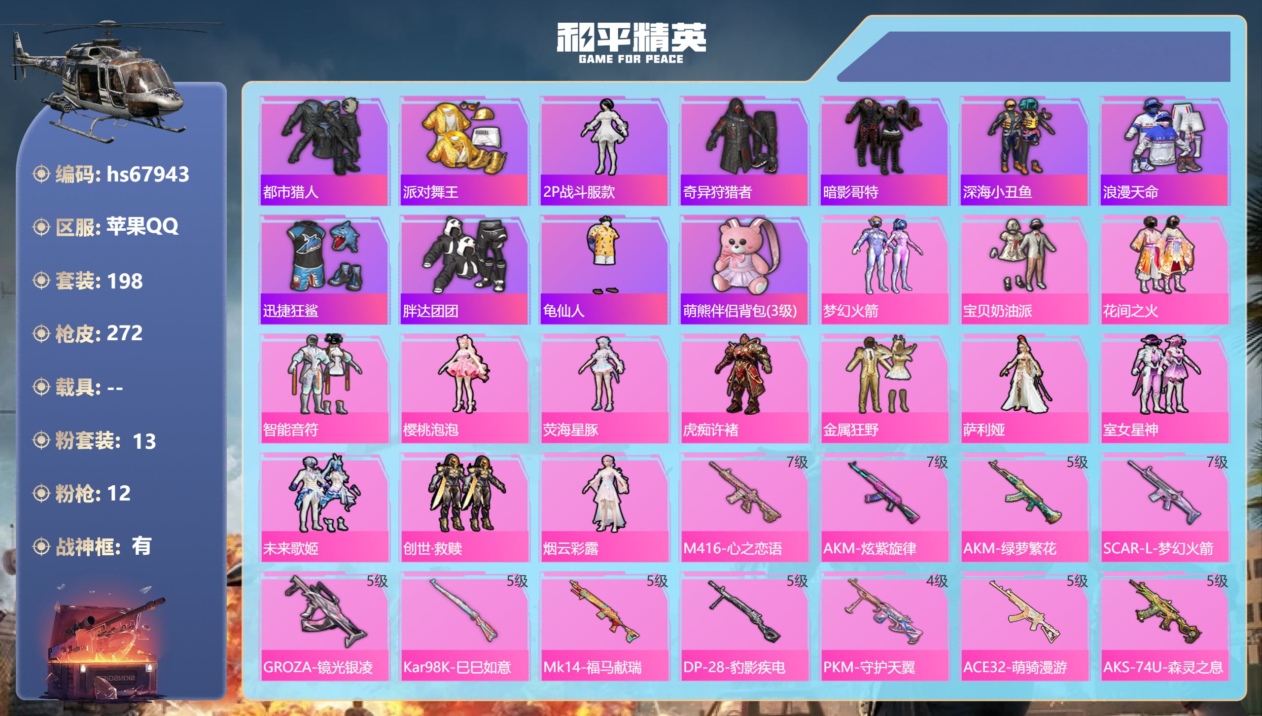 PX_2546767-,苹果手Q-16王牌印记-有战神框-13粉装-12特效枪-84819热力值-198套装-272枪皮-7卓越印记-4传奇印记 【13粉装】套装-金属狂野,套装-宝贝奶油派,角色-虎痴许褚,套装-室女星神,套装-花间之火,套装-梦幻火箭,角色-荧海星豚,角色-萨利娅,套装-智能音符,套装-未来歌姬,套装-创世·救赎,角色-烟云彩露,角色-樱桃泡泡 【12特效枪】AKM-绿萝繁花/5级,SCAR-L-梦幻火箭/7级,PKM-守护天翼/4级,Mk14-福马献瑞/5级,AKS-74U-森灵之息/5级,ACE32-萌骑漫游/5级,破片手榴弹-贪吃小熊/5级,DP-28-豹影疾电/5级,GROZA-镜光银凌/5级,Kar98K-巳巳如意/5级,M416-心之恋语/7级,AKM-炫紫旋律/7级 【11稀有紫装】都市猎人,派对舞王,2P战斗服款,奇异狩猎者,暗影哥特,深海小丑鱼,浪漫天命,迅捷狂鲨,胖达团团,龟仙人,萌熊伴侣背包(3级) 【195稀有时装】梦幻火箭,宝贝奶油派,花间之火,智能音符,樱桃泡泡,荧海星豚,虎痴许褚,金属狂野,萨利娅,室女星神,未来歌姬,创世·救赎,烟云彩露,KONE追光队服,迅捷龙虾,SS38特训,都市猎人,胖达团团,浪漫天命,奇异狩猎者,龟仙人,暗影哥特,深海小丑鱼,迅捷狂鲨,派对舞王,2P战斗服款,激萌罗小黑,暴走罗小黑,Alan,Walker,萌趣咩咩,红熊茄茄,龙魂突击队,异域银装,星渊小夜曲,街头风暴,星途旅人,光矢逐梦,蜜桃派对,炽纹蛇影,冰河战士,鱼渊荷华,大橘大利,燕燕于飞,AG战队服,LGD战队服,JDG战队服,战术大师,智谋强哥,雏菊兔兔,蝶变,猎影月神,粉恋花,元素星魂,午间小调,彩虹兔,琴音绮想,雪绒豹,画境星梦,星影赞美诗,朱霞炽焰,狂鲨锋刃,绛羽幽主,喜羊羊,懒羊羊,凌霄紫焰,粉黛兰香,擎苍青焰,炫彩糖果,萌鸡速递,元气之梦,书海巡游,风迹短诗,薄荷星砂,秘语星愿,超感刻度,云朵鹅,顶瓜瓜,雪国风尚,蓝冰羽,恋语绒绒,青翼流星,紫幽梦,马上来财,风舞幻音,SS35特训,SS29特训,萝兰蝴蝶,SS31特训,SS33特训,SS32特训,SS36特训,贝斯之夜,焰鹰斗篷,军械专家,曹焱兵,闪耀星光,龙的传人,潮流炫酷,智慧之神,SS37特训,SS28特训,特训学院,黄色运动,黄色伏地魔,白色伏地魔,酒红色名流,湖蓝色名流,黄色名流,酷潮明星,绯格组合,SS26特训,漫步者,空岛之星,热情海星,黑色伏地魔,黎明保卫者,元气发射,纯真浪花,SS34特训,雪鹰学院,竞技名士,猛禽,雨林探路者,SS30特训,长空猛禽,特战装甲,街头潮人,惊鸿侠骨,魅力单车,云霞荷露,雪山征服者,春光漫游,水银刺客,甜心亚梦,虚音幻奏,贵族骑装,幻世战舞者,牛气满满,娇憨猪猪,春日漫步,燃烧卡路里,狙击之神,红釉青花,麻辣教官,鹰眼刺客,雨过天青,福马献瑞,冰冻风暴,冷酷挑战者,完美偶像,幽夜迷踪,摇滚舞王,快闪甜心,红潮炫舞,酸甜橘柚,蓝彩潮人,海岛探路者,霓虹街区,森林游猎者,田园牧歌,轻风白浪,探宝勇士,奇趣章鱼,王子的夏天,SS27特训,牛气冲天,情公主,SS19特训,SS20特训,血色贵族,SS21特训,绝对偶像,玉兔迎春,SS22特训,SS23特训,夏日倾情,缤纷果语,滨海厨神,龙舌兰冰茶,神气柴柴,忍者信条,妙红点点,幻彩翩翩,幻羽潜行,海盐绵绵冰,老实芭蕉,王牌教练,暗夜之虎,柠萌假日,SS24特训,懵萌河马,SS25特训,快乐星愿,锦衣飞扬,星梦畅游 【268稀有枪械】M416-心之恋语/7级,AKM-炫紫旋律/7级,AKM-绿萝繁花/5级,SCAR-L-梦幻火箭/7级,GROZA-镜光银凌/5级,Kar98K-巳巳如意/5级,Mk14-福马献瑞/5级,DP-28-豹影疾电/5级,PKM-守护天翼/4级,ACE32-萌骑漫游/5级,AKS-74U-森灵之息/5级,QBZ-纯真浪花,AWM-纯真浪花,汤姆逊-纯真浪花,DBS-乌木金纹,AA12-G-纯真浪花,平底锅-纯真浪花,Mk14-电光马卡龙,SCAR-L-海盐豹豹,GROZA-海盐豹豹,野牛-雏菊兔兔,Mk14-冰河战士,平底锅-雏菊兔兔,M762-雏菊兔兔,Mini14-雏菊兔兔,R1895-雏菊兔兔,撬棍-突变脉冲,UZI-冰河战士,M16A4-冰河战士,MK20-H-乌木金纹,DBS-风迹短诗,莫辛纳甘-风迹短诗,Win94-乌木金纹,MK12-风迹短诗,MK12-乌木金纹,破片手榴弹-爆破雪人,AKM-灵猫魔法师,PKM-紫幽梦,DBS-幻彩电音,ACE32-画境星梦,M1加兰德-画境星梦,MP5K-画境星梦,Mk14-紫幽梦,蜜獾-乌木金纹,M762-云朵鹅,S1897-紫幽梦,SVD-云朵鹅,P92-紫幽梦,蜜獾-绯穹魔姬,M249-绯穹魔姬,SPAS-12-狂鲨锋刃,M417-玩趣呆呆,MK20-H-狂鲨锋刃,AUG-冰晶雪宝,突击盾牌-绝对恒星,铝热弹-炫彩糖果,UZI-炫彩糖果,ARX-像素花束,Mini14-绯穹魔姬,大砍刀-像素花束,AA12-G-画境星梦,G36C-星穹咏叹调,平底锅-画境星梦,短管霰弹-星穹咏叹调,M249-冰晶雪宝,Kar98K-星穹咏叹调,Mk47-风迹短诗,JS9-凌霄紫焰,MG-36-凌霄紫焰,平底锅-紫幽梦,燃烧瓶-甜梦桃焰,破片手榴弹-海盐豹豹,UMP45-海盐豹豹,ARX-凌霄紫焰,AKS-74U-乌木金纹,平底锅-圣斗士星矢,电击枪-喜羊羊与灰太狼,蜜獾-风迹短诗,爆炸猎弓-喜羊羊与灰太狼,P92-凌霄紫焰,AMR-喜羊羊与灰太狼,Famas-乌木金纹,Famas-霓彩脉冲,SPAS-12-云朵鹅,破片手榴弹-拽到爆炸,S1897-糯团青竹,平底锅-凌霄紫焰,Mk14-薄荷星砂,AKS-74U-鸡智如我,沙漠之鹰-云朵鹅,烟雾弹-冰氧夏日,MG-36-薄荷星砂,大砍刀-云朵鹅,PKM-啾咪啾咪,UMP45-圣穹绘梦,AUG-绝对恒星,爆炸猎弓-雪月幻音,SLR-霓彩脉冲,AC-VAL-六号稻草人,SCAR-L-彩虹符号,AUG-紫晶流影,S12K-霓彩脉冲,AMR-鸡智如我,AKM-霓彩脉冲,M416-红色方程式,M416-糯团青竹,M416-滑板小狐,AKM-影袭,AKM-星之彼岸,AKM-龙的传人,AKM-2P战斗服款,SCAR-L-玉兔迎春,SCAR-L-炫彩节奏,M16A4-幻世战舞者,M16A4-甜心亚梦,GROZA-影袭,GROZA-田园牧歌,GROZA-懵萌河马,AUG-甜蜜菠萝,AUG-魔法学院,AUG-2P战斗服款,AUG-天降萌叽,QBZ-未来歌姬,M762-彩虹符号,M762-甜心宝贝,M762-暗夜鎏金,M762-