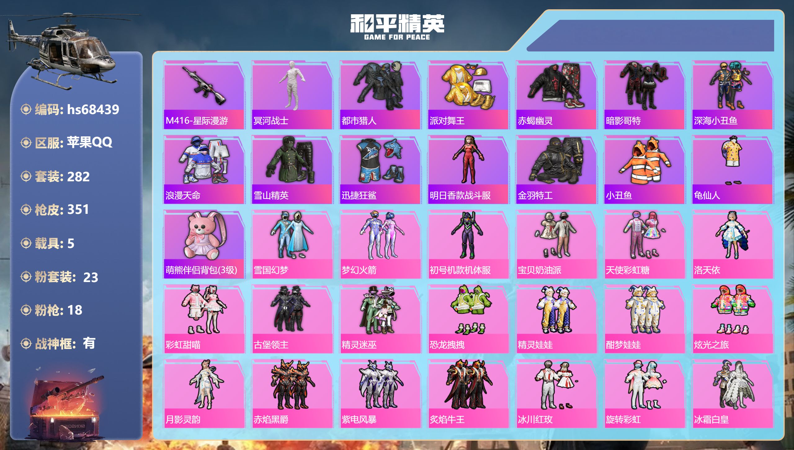 PX_2553830-,苹果手Q-16王牌印记-有战神框-23粉装-18特效枪-5载具-热力值-282套装-351枪皮-2卓越印记 【23粉装】套装-赤焰黑爵,套装-雪国幻梦,角色-月影灵韵,套装-梦幻火箭,角色-幻夜紫晶,套装-炫光之旅,套装-星际漫游者,套装-炙焰牛王,套装-旋转彩虹,套装-彩虹甜喵,角色-初号机款机体服,套装-酣梦娃娃,套装-精灵娃娃,套装-宝贝奶油派,套装-冰霜白皇,套装-紫电风暴,套装-冰川红玫,角色-洛天依,套装-星之彼岸,套装-天使彩虹糖,套装-古堡领主,套装-精灵迷巫,套装-恐龙拽拽 【18特效枪】SCAR-L-灵驹仙姬/6级,AKS-74U-森灵之息/5级,GROZA-镜光银凌/1级,M416-至情至圣/9级,ACE32-萌骑漫游/2级,Mk14-福马献瑞/5级,M249-彩虹甜喵/5级,Kar98K-巳巳如意/5级,AUG-星之彼岸/6级,M762-甜心娃娃/5级,UMP45-宇宙意志/3级,SCAR-L-童趣迷兔/2级,DP-28-豹影疾电/5级,GROZA-旋转彩虹/6级,AKM-甜心宝贝/6级,破片手榴弹-招财进宝/5级,AKM-星际浪客/1级,M416-风花雪月/1级 【15稀有紫装】M416-星际漫游,冥河战士,都市猎人,派对舞王,赤蝎幽灵,暗影哥特,深海小丑鱼,浪漫天命,雪山精英,迅捷狂鲨,明日香款战斗服,金羽特工,小丑鱼,龟仙人,萌熊伴侣背包(3级) 【5稀有载具】兰博基尼Estoque(银翼灰),路特斯ELETRE(冰川蓝),玛莎拉蒂MC20(星石白),焰龙咆哮,星梦玉骢 【1僚机】僚机-萌兔起飞 【281稀有时装】雪国幻梦,梦幻火箭,初号机款机体服,宝贝奶油派,天使彩虹糖,洛天依,彩虹甜喵,古堡领主,精灵迷巫,恐龙拽拽,精灵娃娃,酣梦娃娃,炫光之旅,月影灵韵,赤焰黑爵,紫电风暴,炙焰牛王,冰川红玫,旋转彩虹,冰霜白皇,星际漫游者,星之彼岸,太空漫步,迅捷龙虾,都市猎人,浪漫天命,龟仙人,雪山精英,暗影哥特,深海小丑鱼,小丑鱼,金羽特工,迅捷狂鲨,明日香款战斗服,赤蝎幽灵,冥河战士,派对舞王,激萌罗小黑,狂沙舞者,Alan,Walker,粉雾星云,萌趣咩咩,星河浪客,海上生明月,小熊娃娃,狂花道·雅典娜,异域银装,火种守卫者,狂花道·娜可露露,都市丽猫,星渊小夜曲,星途旅人,光矢逐梦,冰河战士,鱼渊荷华,TT战队服,青团波波,燕燕于飞,NV战队服,战术大师,紫俏灵猫,雏菊兔兔,马上有钱,糖糖葫芦,香桃花海,蝶变,旋风灵鼠,极地流光,薰款战斗服,琴音绮想,画境星梦,狂鲨锋刃,粉黛兰香,云魄琉璃,绯色魅影,萌鸡速递,元气之梦,书海巡游,顶瓜瓜,青翼流星,SS35特训,SS29特训,萝兰蝴蝶,SS5特训,SS31特训,SS33特训,SS32特训,华灯初上,SS36特训,焰鹰斗篷,英勇保护者,智慧隐士,军械专家,拳皇97八神庵,蔷薇魔法师,云纹魔法士,威严将相,圣殿骑士,黑色刀锋,冰爽风暴,爆裂葡萄,云丝凤蟒,银河圣歌,闪耀星光,暗夜契约,豚鼠丹丹,雪兔飞飞,都市漫游者,夏日音浪,龙的传人,SS8特训,青玉碎影,SS37特训,SS28特训,恶魔宝贝,特训学院,猎鹰,青年教官,橘黑制服,红色运动,黄色运动,蓝色运动,黄色伏地魔,飞驰魅影,白色伏地魔,音速流光,热血青春,碟中谍A款,绯格组合,SS26特训,野性山猫,漫步者,热情海星,黑色伏地魔,黎明保卫者,炫蓝之夏,纯真浪花,SS34特训,骑行爱好者,S2赛事,竞技名士,蓝色守护者,深蓝色名流,猛禽,SS30特训,长空猛禽,竞技勇士朋克,特战装甲,战地菁英,旭日情侣,灰色格斗者,甜蜜告白,街头潮人,惊鸿侠骨,魅力单车,雪山征服者,春光漫游,夜莺强袭者,猎梦纪元,丛林猎人,甜心亚梦,SS2特训,虚音幻奏,派对绅士,传奇侦探,浪漫假日,极地朋克,幻世战舞者,战地督导,甜蜜菠萝,半糖蓝莓,街舞之王,恒星战甲,街舞达人,午夜朋克,突袭者,青涩时光,青春校园,特种空勤,牛气满满,娇憨猪猪,春日漫步,潮流先锋,龙腾端午,燃烧卡路里,极速红龙,狙击之神,沙漠毒蛇,红釉青花,麻辣教官,鹰眼刺客,雨过天青,沙暴袭击者,苍穹猎鹰,福马献瑞,SS3特训,冰冻风暴,冷酷挑战者,幽夜迷踪,俏皮奶喵,梦魇先生,暖心橘喵,破蛋小黄鸡,疯狂小兔子,圣诞大吉,特战英豪,快闪甜心,凛冬战士,梦幻奶油,酸甜橘柚,北国孤狼,蓝彩潮人,SS6特训,神秘领域,炽焰拳师,绮丽涂鸦,格斗专家,耀眼新星,星光纪元,奇迹天团,玲珑飞花,海岛探路者,跃动心情,李逍遥,SS7特训,核芯基因,精神漫游,阿奴,和煦暖阳,霓虹街区,田园牧歌,都市魅力,轻风白浪,沙漠兵团,耀粉歌者,冰原奔狼,静谧青瓷,SS27特训,牛气冲天,SS18特训,清新柠檬,SS13特训,飞行日记,岑岑玉浪,团圆交子,蓝调潮人,绚烂繁星,异彩先驱,机械哨兵,霓虹极客,空投萌叽,装甲骑士,SS19特训,光之冒险,SS20特训,SS21特训,玉兔迎春,SS22特训,SS23特训,夏日倾情,甜蜜熊情侣,缤纷果语,滨海厨神,星耀竞速,神气柴柴,忍者信条,幻彩翩翩,幻羽潜行,海盐绵绵冰,老实芭蕉,游猎者,刚毅裁决者,SS1特训,王牌教练,柠萌假日,SS24特训,懵萌河马,SS25特训,快乐星愿,锦衣飞扬,星梦畅游 【349稀有枪械】M416-星际漫游,M416-至情至圣/9级,SCAR-L-灵驹仙姬/6级,UMP45-宇宙意志/3级,M416-风花雪月/1级,AKM-甜心宝贝/6级,AKM-星际浪客/1级,SCAR-L-童趣迷兔/2级,GROZA-镜光银凌/1级,GROZA-旋转彩虹/6级,AUG-星之彼岸/6级,M762-甜心娃娃/5级,Kar98K-巳巳如意/5级,Mk14-福马献瑞/5级,M249-彩虹甜喵/5级,DP-28-豹影疾电/5级,ACE32-萌骑漫游/2级,AKS-74U-森灵之息/5级,破片手榴弹-招财进宝/5级,QBZ-纯真浪花,AWM-纯真浪花,汤姆逊-纯真浪花,DBS-乌木金纹,AA12-G-纯真浪花,平底锅-纯真浪花,AMR-墨龙九天,汤姆逊-星梦奇缘,蜜獾-精灵梦叶罗丽,MK20-H-星梦奇缘,SCAR-L-海盐豹豹,平底锅-精灵梦叶罗丽,GROZA-海盐豹豹,野牛-雏菊兔兔,Mk14-冰河战士,平底锅-雏菊兔兔,M762-雏菊兔兔,Min