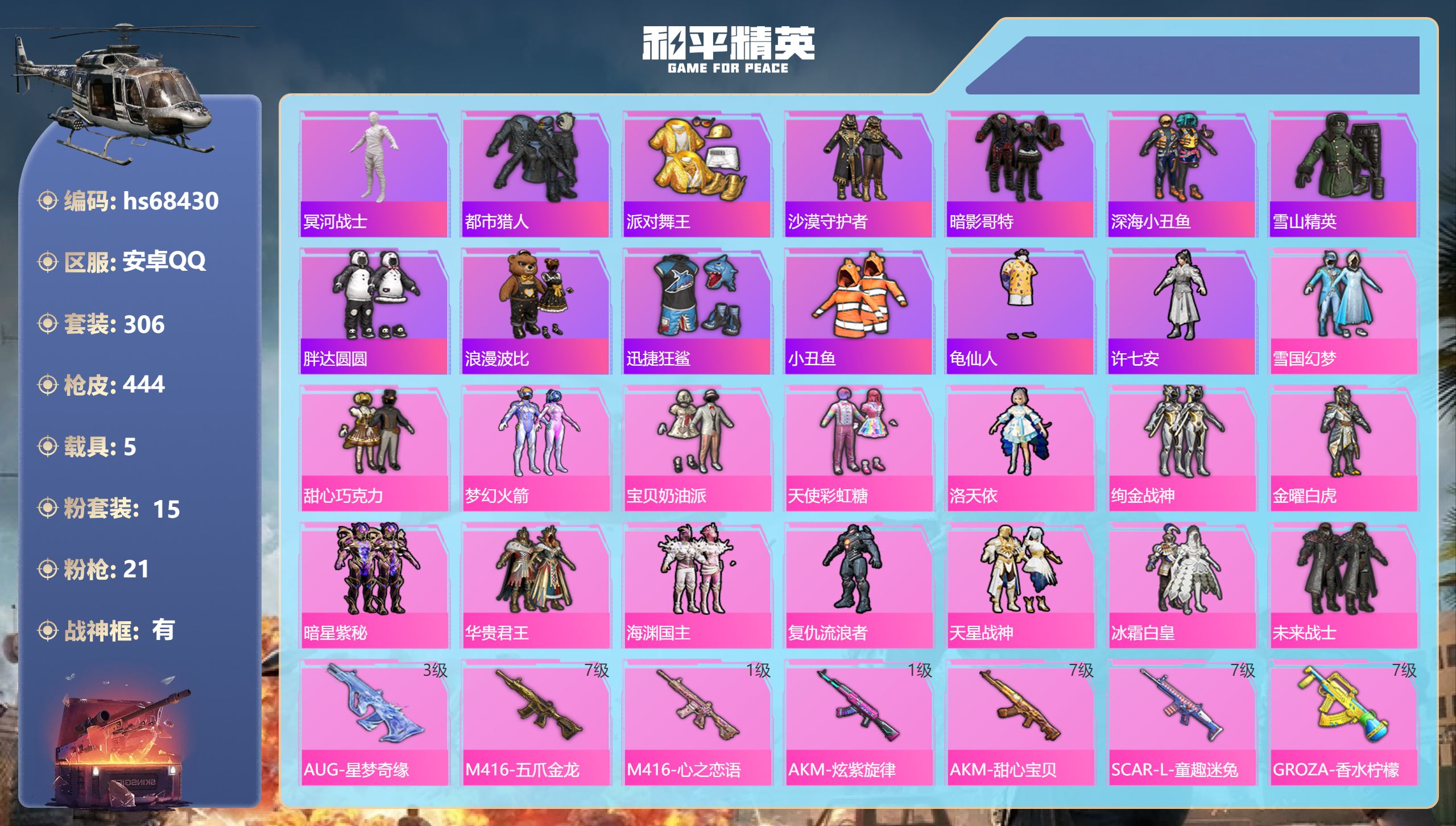 PX_2553931-,安卓手Q-30王牌印记-有战神框-15粉装-21特效枪-5载具-热力值-306套装-444枪皮-3卓越印记-3传奇印记 【15粉装】角色-复仇流浪者,角色-洛天依,套装-天星战神,套装-绚金战神,套装-宝贝奶油派,套装-暗星紫秘,套装-金曜白虎,套装-雪国幻梦,套装-海渊国主,套装-甜心巧克力,套装-天使彩虹糖,套装-华贵君王,套装-冰霜白皇,套装-未来战士,套装-梦幻火箭 【21特效枪】SCAR-L-童趣迷兔/7级,MG3-洛神天依/5级,Kar98K-巳巳如意/5级,AKS-74U-信仰神谕/5级,Vector-环太平洋/5级,ACE32-萌骑漫游/4级,M416-五爪金龙/7级,P90-甜蜜草莓/7级,S12K-海渊国主/5级,M762-甜蜜誓约/5级,M416-心之恋语/1级,AKM-炫紫旋律/1级,MG3-梦幻舞会/1级,UMP45-雪国精灵/7级,AUG-星梦奇缘/3级,AKM-甜心宝贝/7级,AMR-鸢尾晶梦/5级,DP-28-豹影疾电/5级,破片手榴弹-瓶中星球/6级,GROZA-香水柠檬/7级,Mk14-福马献瑞/5级 【14稀有紫装】冥河战士,巡查衣,都市猎人,派对舞王,沙漠守护者,暗影哥特,深海小丑鱼,雪山精英,胖达圆圆,浪漫波比,迅捷狂鲨,小丑鱼,龟仙人,许七安 【5稀有载具】玛莎拉蒂Ghibli(粉),特斯拉Model,3(冷光银),合金龙骨(蓝),星梦玉骢,晶梦灵驹 【306稀有时装】雪国幻梦,甜心巧克力,梦幻火箭,宝贝奶油派,天使彩虹糖,洛天依,绚金战神,金曜白虎,暗星紫秘,华贵君王,海渊国主,复仇流浪者,天星战神,创世·幻影,冰霜白皇,未来战士,绝对防御上衣,迅捷龙虾,SS38特训,沙漠守护者,都市猎人,龟仙人,雪山精英,暗影哥特,深海小丑鱼,小丑鱼,迅捷狂鲨,胖达圆圆,浪漫波比,冥河战士,派对舞王,好奇恐龙,动感兔斯基人偶服,潮萌小黄鸭,粉雾星云,萌趣咩咩,神秘黑猫,软萌银虎,海上生明月,花面小丑,龙魂突击队,小熊娃娃,异域银装,街头风暴,星途旅人,冰河战士,鱼渊荷华,青团波波,大橘大利,燕燕于飞,战术大师,怪笑疯兔,智谋强哥,许七安,雏菊兔兔,马上有钱,糖糖葫芦,晶辉守护,香桃花海,蝶变,巳巳如意,粉恋花,粉日山川,棉花软糖,极地流光,午间小调,彩虹兔,琴音绮想,雪绒豹,画境星梦,朱霞炽焰,狂鲨锋刃,游乐,凌霄紫焰,粉黛兰香,擎苍青焰,炫彩糖果,萌鸡速递,元气之梦,书海巡游,风迹短诗,漫游都市,薄荷星砂,秘语星愿,云朵鹅,顶瓜瓜,雪国风尚,蓝冰羽,恋语绒绒,青翼流星,紫幽梦,SS35特训,迷域探索者,机械英豪,机械征服者,SS29特训,萝兰蝴蝶,SS5特训,SS31特训,冰原使者,SS33特训,SS32特训,SS16特训,暴风机械师,时空追击者,SS36特训,暗夜傀儡,英勇保护者,智慧隐士,军械专家,拳皇97八神庵,决胜时刻,黑色刀锋,新侠客行,福星高照,暗夜契约,海龙战士,虎虎生威吉莉,夏日音浪,龙的传人,军刀雅典娜,SS8特训,众神之王,甜梦熊熊,智慧之神,白熊同盟,青玉碎影,萌黄之夏,SS37特训,破晓情侣,海滨突袭者,SS28特训,恶魔宝贝,飞驰魅影,音速流光,热血青春,SS9特训,白月香洋装,阳光火鸡,酷潮明星,绯格组合,涂山之恋,伏击者,SS26特训,薄荷蓝莓,漫步者,空岛之星,热情海星,黑色伏地魔,黎明保卫者,元气发射,纯真浪花,SS34特训,竞技名士,浑天鲲鹏,深蓝色名流,灰色守护者,雨林探路者,SS30特训,长空猛禽,竞技勇士朋克,时尚圣诞,特战装甲,战地菁英,旭日情侣,灰色格斗者,六六大吉,甜蜜告白,街头潮人,魅力单车,雪山征服者,夜莺强袭者,野性战魂,丛林猎人,甜心亚梦,SS2特训,虚音幻奏,传奇侦探,极地朋克,贵族骑装,幻世战舞者,青涩时光,青春校园,牛气满满,娇憨猪猪,春日漫步,冰川特警,滨海假日,狙击之神,WiFi精灵,红釉青花,麻辣教官,鹰眼刺客,雨过天青,沙暴袭击者,SS3特训,冰冻风暴,完美偶像,SS11特训,SS4特训,梦魇先生,青春冒险家,破蛋小黄鸡,潮流游乐家,疯狂小兔子,圣诞大吉,朱雀圣者,凛冬战士,暗金炫舞,北国孤狼,SS6特训,千禧之恋,神秘领域,炽焰拳师,绮丽涂鸦,格斗专家,坚韧舞者,奇迹天团,朋克治安官,淡雅花蕊,玲珑飞花,原初圣火,逆风勇士,海岛探路者,跃动心情,SS7特训,核芯基因,精神漫游,霓虹街区,田园牧歌,都市魅力,萌趣颜团子,轻风白浪,SS10特训,特种颜团子,沙漠兵团,镭射皇者,风华少年志,摩艾涂鸦,探宝勇士,暗影爵士,SS12特训,暗黑裁决,SS27特训,牛气冲天,迅捷之星,SS18特训,治愈之星,银白舞王,科技之星,SS13特训,飞行日记,SS17特训,瑞龙福将,团圆交子,金耀舞者,蓝调潮人,绚烂繁星,遗落祭司,光影梦想家,异彩先驱,霓虹极客,空投萌叽,SS19特训,光之冒险,SS20特训,SS21特训,玉兔迎春,弄潮海豚,SS22特训,SS23特训,呆萌铁蟹,冰爽海盐,浪漫樱花,夏日倾情,甜蜜熊情侣,缤纷果语,滨海厨神,SS14特训,天籁歌者,电音精灵,神气柴柴,艾克斯奥特曼,妙红点点,幻彩翩翩,格斗先锋,海盐绵绵冰,吉莉礼服,游猎者,刚毅裁决者,SS1特训,王牌教练,荣耀,暗夜之虎,柠萌假日,粉红小猪,SS24特训,鹤鸣,绚紫流光,懵萌河马,SS25特训,万圣娃娃,黑夜传说,SS15特训,舞夜骑士,深蓝冒险家 【443稀有枪械】AUG-星梦奇缘/3级,M416-五爪金龙/7级,M416-心之恋语/1级,AKM-炫紫旋律/1级,AKM-甜心宝贝/7级,SCAR-L-童趣迷兔/7级,GROZA-香水柠檬/7级,M762-甜蜜誓约/5级,Kar98K-巳巳如意/5级,AMR-鸢尾晶梦/5级,Mk14-福马献瑞/5级,UMP45-雪国精灵/7级,Vector-环太平洋/5级,P90-甜蜜草莓/7级,S12K-海渊国主/5级,DP-28-豹影疾电/5级,MG3-洛神天依/5级,MG3-梦幻舞会/1级,ACE32-萌骑漫游/4级,AKS-74U-信仰神谕/5级,破片手榴弹-瓶中星球/6级,QBZ-纯真浪花,AWM-纯真浪花,汤姆逊-纯真浪花,DBS-乌木金纹,AA12-G-纯真浪花,平底锅-纯真浪花,DBS-创世·救赎,汤姆逊-星梦奇缘,MK20-H-星梦奇缘