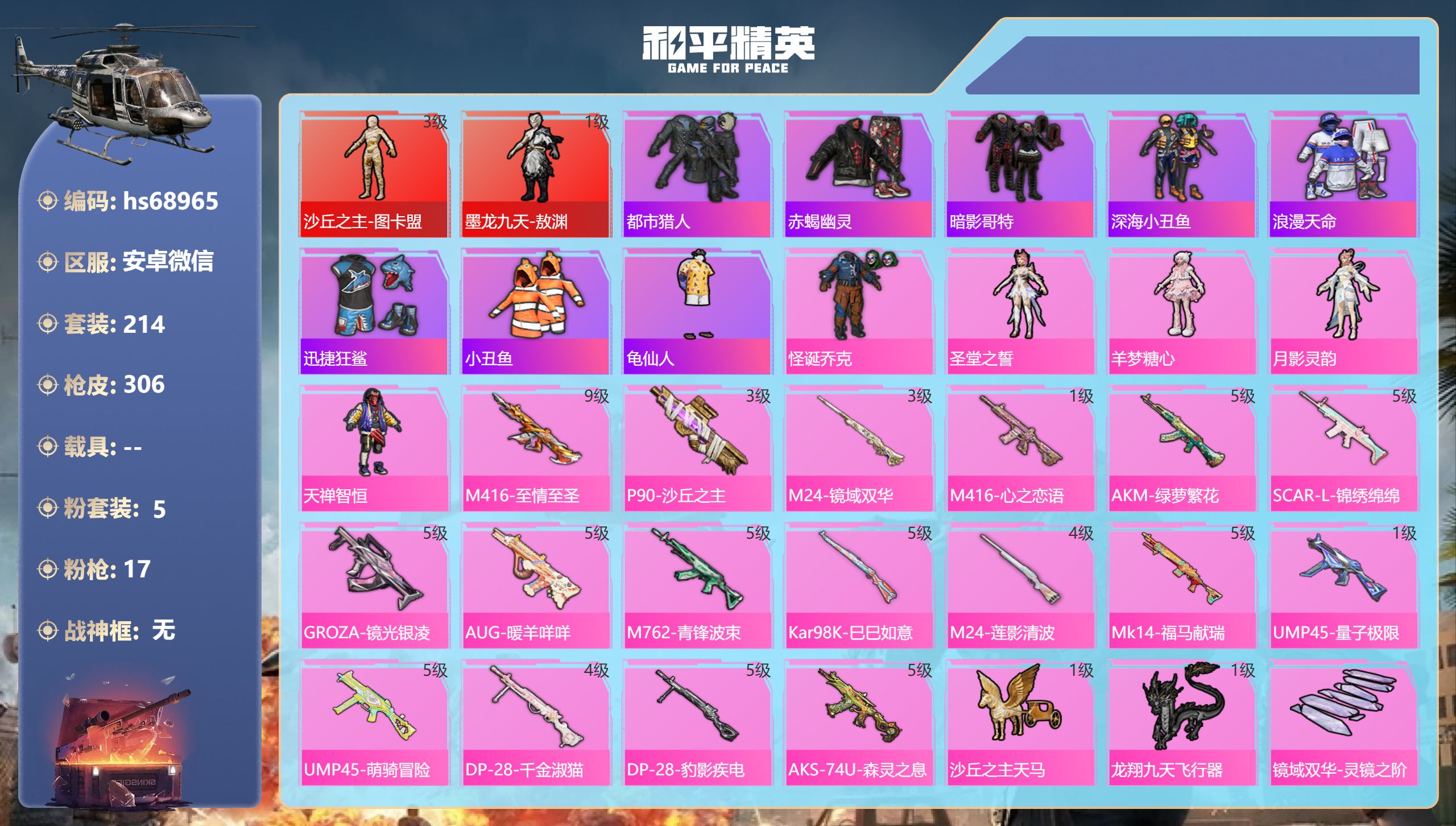 PX_2553935-,安卓微信-22王牌印记-2红装-5粉装-17特效枪-99149热力值-214套装-306枪皮-3卓越印记-1传奇印记 【2红装】墨龙九天-敖渊/1级,沙丘之主-图卡盟/3级 【5粉装】角色-圣堂之誓,角色-月影灵韵,角色-羊梦糖心,套装-怪诞乔克,套装-天禅智恒 【17特效枪】UMP45-量子极限/1级,AUG-暖羊咩咩/5级,M416-至情至圣/9级,SCAR-L-锦绣绵绵/5级,GROZA-镜光银凌/5级,AKM-绿萝繁花/5级,UMP45-萌骑冒险/5级,M24-镜域双华/3级,DP-28-豹影疾电/5级,P90-沙丘之主/3级,M762-青锋波束/5级,DP-28-千金淑猫/4级,Mk14-福马献瑞/5级,AKS-74U-森灵之息/5级,Kar98K-巳巳如意/5级,M416-心之恋语/1级,M24-莲影清波/4级 【8稀有紫装】都市猎人,赤蝎幽灵,暗影哥特,深海小丑鱼,浪漫天命,迅捷狂鲨,小丑鱼,龟仙人 【214稀有时装】图卡盟/3级,敖渊/1级,怪诞乔克,圣堂之誓,羊梦糖心,月影灵韵,天禅智恒,SS38特训,都市猎人,浪漫天命,龟仙人,暗影哥特,深海小丑鱼,小丑鱼,迅捷狂鲨,赤蝎幽灵,狂沙舞者,Alan,Walker,萌趣咩咩,龙魂突击队,卖崽青蛙,小熊娃娃,异域银装,霜刃之御,摩登魅猫,白糯汤圆,街头风暴,星途旅人,光矢逐梦,冰河战士,鱼渊荷华,俏兔智灵,青团波波,大橘大利,燕燕于飞,战术大师,智谋强哥,雏菊兔兔,糖糖葫芦,香桃花海,蝶变,巳巳如意,湖畔霞光,曼妙人鱼,棉花软糖,元素星魂,彩虹兔,琴音绮想,乐音,雪绒豹,画境星梦,朱霞炽焰,阳光菠萝,绛羽幽主,凌霄紫焰,云魄琉璃,擎苍青焰,绯色魅影,书海巡游,薄荷星砂,云朵鹅,顶瓜瓜,冰公主,青翼流星,马上来财,新风雅兰,SS35特训,SS29特训,萝兰蝴蝶,SS31特训,SS33特训,SS32特训,SS16特训,SS36特训,焰鹰斗篷,福星高照,海龙战士,夏日音浪,龙的传人,潮流炫酷,甜梦熊熊,白熊同盟,萌黄之夏,SS37特训,SS28特训,青年教官,橘黑制服,蓝色运动,飞驰魅影,SS9特训,湖蓝色名流,黄色名流,酷潮明星,绯格组合,涂山之恋,SS26特训,野性山猫,漫步者,空岛之星,热情海星,黑色伏地魔,黎明保卫者,炫蓝之夏,纯真浪花,SS34特训,骑行爱好者,竞技名士,蓝色守护者,猛禽,SS30特训,长空猛禽,旭日情侣,六六大吉,街头潮人,怒火燎原,冷焰舞者,惊鸿侠骨,魅力单车,灼焰舞者,春光漫游,猎梦纪元,甜心亚梦,虚音幻奏,极地朋克,贵族骑装,幻世战舞者,战地督导,特殊使命,青涩时光,牛气满满,娇憨猪猪,春日漫步,冰川特警,龙腾端午,燃烧卡路里,滨海假日,极速红龙,狙击之神,生化防暴队,红釉青花,麻辣教官,鹰眼刺客,雨过天青,福马献瑞,冰冻风暴,完美偶像,SS11特训,幽夜迷踪,幻影武者,俏皮奶喵,破蛋小黄鸡,疯狂小兔子,快闪甜心,蓝彩潮人,千禧之恋,绮丽涂鸦,坚韧舞者,野性战心,原初圣火,逆风勇士,海岛探路者,破晓战魂,霓虹街区,森林游猎者,光速穿梭者,萌趣颜团子,特种颜团子,镭射皇者,耀粉歌者,探宝勇士,SS12特训,SS27特训,牛气冲天,SS18特训,治愈之星,银白舞王,清新柠檬,科技之星,SS13特训,飞行日记,SS17特训,瑞龙福将,团圆交子,金耀舞者,蓝调潮人,空投萌叽,SS19特训,光之冒险,SS20特训,血色贵族,SS21特训,绝对偶像,玉兔迎春,SS22特训,SS23特训,夏日倾情,甜蜜熊情侣,缤纷果语,SS14特训,神气柴柴,格斗先锋,幻羽潜行,海盐绵绵冰,老实芭蕉,吉莉礼服,王牌教练,荣耀,柠萌假日,SS24特训,鹤鸣,懵萌河马,SS25特训,锦衣飞扬,SS15特训 【306稀有枪械】M416-至情至圣/9级,P90-沙丘之主/3级,M24-镜域双华/3级,M416-心之恋语/1级,AKM-绿萝繁花/5级,SCAR-L-锦绣绵绵/5级,GROZA-镜光银凌/5级,AUG-暖羊咩咩/5级,M762-青锋波束/5级,Kar98K-巳巳如意/5级,M24-莲影清波/4级,Mk14-福马献瑞/5级,UMP45-量子极限/1级,UMP45-萌骑冒险/5级,DP-28-千金淑猫/4级,DP-28-豹影疾电/5级,AKS-74U-森灵之息/5级,QBZ-纯真浪花,AWM-纯真浪花,汤姆逊-纯真浪花,DBS-乌木金纹,AA12-G-纯真浪花,平底锅-纯真浪花,Famas-墨龙九天,SLR-墨龙九天,Vector-创世·救赎,烟雾弹-鸢尾晶梦,蜜獾-精灵梦叶罗丽,MK20-H-星梦奇缘,SCAR-L-海盐豹豹,SLR-金丰海韵,野牛-雏菊兔兔,Mk14-冰河战士,平底锅-雏菊兔兔,M762-雏菊兔兔,Mini14-雏菊兔兔,Famas-突变脉冲,M200-宇宙意志,短管霰弹-宇宙意志,R1895-雏菊兔兔,AC-VAL-宇宙意志,UZI-冰河战士,M16A4-冰河战士,MK20-H-乌木金纹,Win94-乌木金纹,MK12-乌木金纹,撬棍-灵猫魔法师,MG3-霓彩脉冲,ACE32-画境星梦,M1加兰德-画境星梦,MP5K-画境星梦,蜜獾-乌木金纹,M762-云朵鹅,SVD-云朵鹅,SPAS-12-狂鲨锋刃,M417-玩趣呆呆,MK20-H-狂鲨锋刃,铝热弹-炫彩糖果,AA12-G-画境星梦,平底锅-画境星梦,短管霰弹-星穹咏叹调,M249-冰晶雪宝,JS9-凌霄紫焰,MG-36-凌霄紫焰,破片手榴弹-海盐豹豹,AC-VAL-霁蓝缠春,UMP45-海盐豹豹,ARX-凌霄紫焰,AKS-74U-乌木金纹,爆炸猎弓-喜羊羊与灰太狼,P92-凌霄紫焰,Famas-乌木金纹,SPAS-12-云朵鹅,S1897-糯团青竹,信号枪-异瞳寒姬,平底锅-凌霄紫焰,Mk14-薄荷星砂,AKS-74U-鸡智如我,沙漠之鹰-云朵鹅,烟雾弹-冰氧夏日,MG3-智耀战神,MG-36-薄荷星砂,大砍刀-云朵鹅,PKM-啾咪啾咪,M24-天降萌叽,GROZA-荧海星豚,S1897-荧海星豚,平底锅-属我最6,S12K-霓彩脉冲,AKM-霓彩脉冲,M416-蓝色火焰,M416-糯团青竹,M416-绯红前夜,AKM-影袭,AKM-夜灯,AKM-彩虹符号,AKM-缤纷海域,AKM-破晓战魂,AKM-龙的传人,AKM-灼热熔岩,AKM-虎虎生威,AKM-萌趣颜团子,AKM-霓虹街区,SCAR-L-红色方程式,SCAR-L-玉兔迎春,SCAR-L-黄金龙骨,M16A4-红色方程式,M16A4-蓝色火焰,M16A4-幻世战舞者,M16A4-甜心亚梦,GROZA-守护天翼,GROZA-影袭,GROZA-懵萌河马,GROZA-彩虹符号,GROZA-马卡龙,GROZA-治愈之星,AUG-耀粉歌者,AUG-甜蜜菠萝,AUG-青春冒险家,AUG-闲