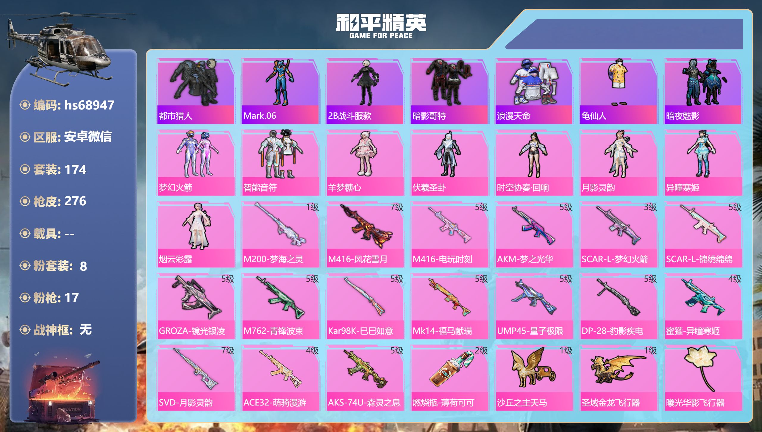 PX_2553953-,安卓微信-13王牌印记-8粉装-17特效枪-84781热力值-174套装-276枪皮-4卓越印记-1传奇印记 【8粉装】角色-月影灵韵,角色-异瞳寒姬,套装-梦幻火箭,角色-羊梦糖心,角色-伏羲圣卦,角色-烟云彩露,套装-智能音符,时空协奏·回响 【17特效枪】UMP45-量子极限/5级,Kar98K-巳巳如意/5级,SVD-月影灵韵/7级,M416-电玩时刻/5级,GROZA-镜光银凌/5级,Mk14-福马献瑞/5级,AKS-74U-森灵之息/5级,ACE32-萌骑漫游/4级,M200-梦海之灵/1级,M762-青锋波束/5级,M416-风花雪月/7级,DP-28-豹影疾电/5级,SCAR-L-梦幻火箭/3级,燃烧瓶-薄荷可可/2级,AKM-梦之光华/5级,蜜獾-异瞳寒姬/4级,SCAR-L-锦绣绵绵/5级 【7稀有紫装】都市猎人,Mark.06,2B战斗服款,暗影哥特,浪漫天命,龟仙人,暗夜魅影 【174稀有时装】梦幻火箭,智能音符,羊梦糖心,伏羲圣卦,时空协奏·回响,月影灵韵,异瞳寒姬,烟云彩露,都市猎人,浪漫天命,龟仙人,Mark.06,暗影哥特,2B战斗服款,萌趣咩咩,龙魂突击队,铁血战翼,异域银装,街头风暴,星途旅人,光矢逐梦,冰河战士,鱼渊荷华,俏兔智灵,TT战队服,绿头鱼,大橘大利,燕燕于飞,战术大师,紫俏灵猫,马上有钱,蝶变,瑰梦爱神,巳巳如意,粉恋花,午间小调,彩虹兔,琴音绮想,霓虹热舞,雪绒豹,雁字回时,画境星梦,朱霞炽焰,狂鲨锋刃,阳光菠萝,喜羊羊,游乐,凌霄紫焰,粉黛兰香,无面战甲,擎苍青焰,炫彩糖果,绯色魅影,萌鸡速递,小鸟芋圆,元气之梦,书海巡游,风迹短诗,错位像素,漫游都市,薄荷星砂,秘语星愿,云朵鹅,顶瓜瓜,雪国风尚,蓝冰羽,恋语绒绒,青翼流星,萌萌史莱姆,紫幽梦,暗夜魅影,SS35特训,SS29特训,SS31特训,SS33特训,SS32特训,明鸳圣池,SS36特训,焰鹰斗篷,豚鼠丹丹,夏日音浪,龙的传人,冰暴轰轰,白熊同盟,青玉碎影,SS37特训,蝶吟花词,SS28特训,黄色运动,飞驰魅影,白色伏地魔,音速流光,酒红色名流,湖蓝色名流,绯格组合,SS26特训,漫步者,热情海星,黑色伏地魔,炫蓝之夏,纯真浪花,SS34特训,骑行爱好者,竞技名士,蓝色守护者,猛禽,SS30特训,长空猛禽,特战装甲,甜蜜告白,街头潮人,冷焰舞者,魅力单车,灼焰舞者,青羽突袭者,贵族骑装,幻世战舞者,战地督导,牛气满满,娇憨猪猪,风暴特警,春日漫步,冰川特警,极速红龙,狙击之神,红釉青花,麻辣教官,鹰眼刺客,雨过天青,福马献瑞,冰冻风暴,幽夜迷踪,幻影武者,梦魇先生,破蛋小黄鸡,暗金炫舞,蓝彩潮人,耀眼新星,海岛探路者,破晓战魂,霓虹街区,田园牧歌,都市魅力,轻风白浪,探宝勇士,SS27特训,牛气冲天,情公主,SS18特训,飞行日记,SS17特训,瑞龙福将,团圆交子,金耀舞者,异彩先驱,霓虹极客,空投萌叽,SS19特训,光之冒险,SS20特训,SS21特训,玉兔迎春,SS22特训,SS23特训,缤纷果语,香榭午后,妙红点点,幻彩翩翩,幻羽潜行,海盐绵绵冰,老实芭蕉,王牌教练,SS24特训,SS25特训 【277稀有枪械】M200-梦海之灵/1级,M416-风花雪月/7级,M416-电玩时刻/5级,AKM-梦之光华/5级,SCAR-L-梦幻火箭/3级,SCAR-L-锦绣绵绵/5级,GROZA-镜光银凌/5级,M762-青锋波束/5级,Kar98K-巳巳如意/5级,Mk14-福马献瑞/5级,UMP45-量子极限/5级,DP-28-豹影疾电/5级,蜜獾-异瞳寒姬/4级,SVD-月影灵韵/7级,ACE32-萌骑漫游/4级,AKS-74U-森灵之息/5级,燃烧瓶-薄荷可可/2级,QBZ-纯真浪花,AWM-纯真浪花,汤姆逊-纯真浪花,DBS-乌木金纹,AA12-G-纯真浪花,平底锅-纯真浪花,P1911-创世·救赎,AKM-霓彩节奏,蝎式手枪-奶油梦幻熊,烟雾弹-鸢尾晶梦,突击盾牌-初号机,觉醒Ver.,S1897-精灵梦叶罗丽,SCAR-L-海盐豹豹,GROZA-海盐豹豹,TMP-9-霓彩节奏,Mk14-冰河战士,UZI-冰河战士,M16A4-冰河战士,MK20-H-乌木金纹,DBS-风迹短诗,莫辛纳甘-风迹短诗,M416-错位像素,AKM-绿洲时空,GROZA-无面战甲,Win94-乌木金纹,MK12-风迹短诗,M24-快狙起手(快手),MK12-乌木金纹,破片手榴弹-爆破雪人,PKM-紫幽梦,MG3-霓彩脉冲,ACE32-画境星梦,M1加兰德-画境星梦,M24-次元破裂(哔哩哔哩),MP5K-画境星梦,Mk14-紫幽梦,蜜獾-乌木金纹,M762-云朵鹅,S1897-紫幽梦,SVD-云朵鹅,P92-紫幽梦,AWM-绿洲时空,汤姆逊-错位像素,SPAS-12-狂鲨锋刃,M417-玩趣呆呆,MK20-H-狂鲨锋刃,铝热弹-炫彩糖果,UZI-炫彩糖果,UMP45-绿洲时空,大砍刀-咒蚀之裁,AA12-G-画境星梦,平底锅-画境星梦,短管霰弹-星穹咏叹调,M249-冰晶雪宝,Kar98K-星穹咏叹调,Mk47-风迹短诗,JS9-凌霄紫焰,MG-36-凌霄紫焰,平底锅-紫幽梦,燃烧瓶-甜梦桃焰,破片手榴弹-海盐豹豹,UMP45-海盐豹豹,ARX-凌霄紫焰,AKS-74U-乌木金纹,AKM-涂鸦街区,电击枪-喜羊羊与灰太狼,蜜獾-风迹短诗,P92-凌霄紫焰,AMR-喜羊羊与灰太狼,Famas-乌木金纹,Famas-霓彩脉冲,SPAS-12-云朵鹅,M249-无面战甲,破片手榴弹-拽到爆炸,Mini14-辉羽雀灵,十字弩-异瞳寒姬,S1897-糯团青竹,信号枪-异瞳寒姬,平底锅-凌霄紫焰,Mk14-薄荷星砂,M79短管榴弹-钛晶裂爪,AKS-74U-鸡智如我,汤姆逊-智耀战神,DP-28-御兔特攻,沙漠之鹰-云朵鹅,烟雾弹-冰氧夏日,AKS-74U-粉粉喵呜,Mk14-紫晶流影,MG-36-薄荷星砂,SCAR-L-绿洲时空,大砍刀-云朵鹅,PKM-啾咪啾咪,SLR-圣穹绘梦,沙漠之鹰-圣穹绘梦,S1897-荧海星豚,SVD-霓彩脉冲,SLR-霓彩脉冲,平底锅-属我最6,SCAR-L-彩虹符号,蜜獾-绿洲时空,P1911-无面战甲,AUG-紫晶流影,S12K-霓彩脉冲,AMR-鸡智如我,AKM-霓彩脉冲,M416-红色方程式,M416-蓝色火焰,M416-糯团青竹,AKM-影袭,AKM-小鹦鹉BEBE,AKM-海渊国主,AKM-江南烟雨,AKM-龙的传人,AKM-虎虎生威,SCAR-L-玉兔迎春,SCAR-L-暗夜玫瑰,SCAR-L-龙宫之主,SCAR-L-夜灯,SCAR-L-炫彩节奏,M16A4-幻世战舞者,GROZA-异彩先驱,GROZA-影袭,GROZA-田园牧歌,AUG-幻影战神,AUG-耀粉歌者,AUG-甜蜜菠萝,AUG
