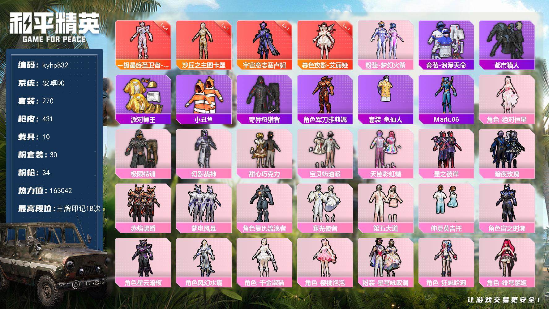 PX_2548593--4神装-30粉装-34特效枪-10载具-23粉色飞行器-163042热力值-18王牌印记-270套装-431枪皮 【红色神装等级】:暮色玫影-艾丽娅(一级),最终圣卫者-帕修斯(四级),宇宙意志-塞卢姆(一级),沙丘之主-图卡盟(一级) 【红色角色神装】:暮色玫影-艾丽娅,最终圣卫者-帕修斯,宇宙意志-塞卢姆,沙丘之主-图卡盟 【热门品类】:粉装-梦幻火箭,套装-浪漫天命,套装-都