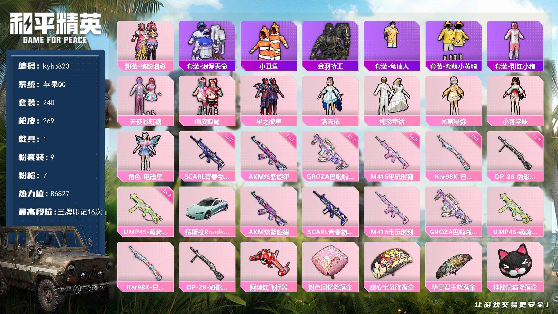 PX_2548583--9粉装-7特效枪-1载具-1粉色飞行器-86827热力值-16王牌印记-240套装-269枪皮 【热门品类】:粉装-缤纷油彩,套装-浪漫天命,套装-小丑鱼,套装-金羽特工,套装-龟仙人,套装-潮萌小黄鸭,套装-粉红小猪 【粉色套装】:粉装-天使彩虹糖,粉装-缤纷油彩,粉装-俏皮狐尾,粉装-星之彼岸,角色-洛天依,粉装-纯珍童话,角色-呆萌星弥,角色-小可学妹,角色-电磁星 【粉色枪