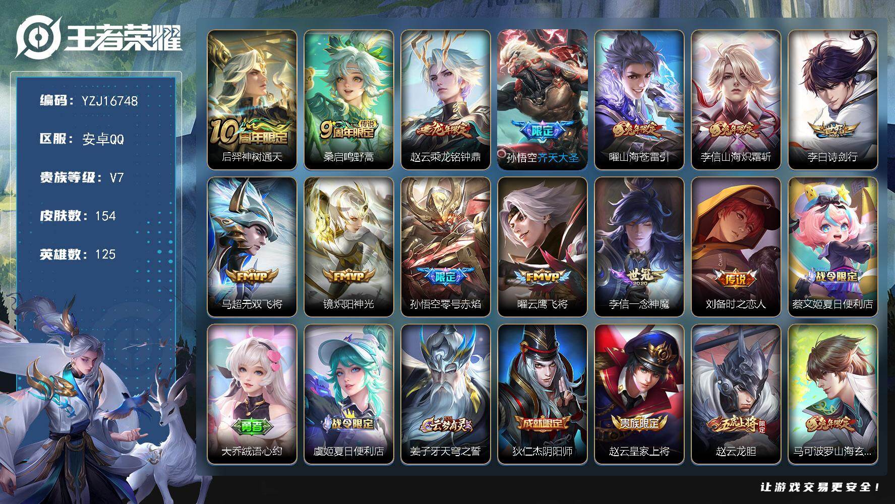 PX_2536662-【准v10!!!,差9000多点券而已,!!】实名:,可修改,贵族等级:,V9,英雄数:,128,皮肤数:,271,荣耀水晶:,星空梦想,鸣剑·曳影,无双皮:,真我赫兹(瑶),青丘·九尾,碎月剑心,小乔时之魔女,离恨烟,雪境奇遇-甄姬,器灵·螭龙剑,天机白泽,问心剑,珍品传说:,时之奇旅-孙策,器灵·落星盏,兔狲·蓬尾,酷洛米之心,大耳狗之梦,黑崎一护,星传说:,幽冥之眼,金色仲夏夜,岁雨灵司,破晓神光,传说皮:,黄金射手座,云鹰飞将,黄金白羊座,炽阳神光,末日机甲-孙尚香,仲夏夜之梦,地狱之眼,音你心动-周瑜,乞巧织情,淬星耀世,山海·苍雷引,澜逐花归海,乘龙·问璇玑,乘龙·铭钟鼎,落雪白狼,金乌负日,玄雷天君,千劫归真,千山共赴,神树通天,纵目迁山,神骥·赴朔漠,神骥·聚万邦,限定皮:,李小龙,祈雪灵祝,时雨天司,引擎之心,龙胆,蜜橘之夏,逐梦之音,凤求凰,白虎志,青龙志,至尊宝,寅虎·赤拳,百木心枪,玉兔公主,深海之息,五谷丰年,梦圆繁星,冰霜神祇,山海·碧波行,鸣野蒿,陌上桑,愿照·九州拓