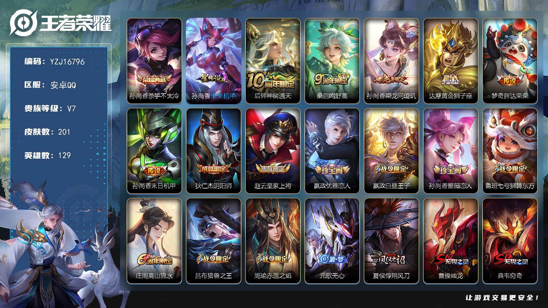 PX_2554378-实名:,可修改,贵族等级:,V8,英雄数:,129,皮肤数:,277,荣耀水晶:,杀手不太冷,星传说:,未来机甲,幽冥火,传说皮:,末日机甲-孙尚香,地狱火,零号·赤焰,胖达荣荣,李逍遥,记忆之芯,澜逐花归海,幻光神枪,神树通天,限定皮:,冰锋战神,遇见飞天,李小龙,游园惊梦,梁祝,御风骁将,岱宗,神威,飞衡,太华,逐梦之影,天狼绘梦者,白虎志,朱雀志,至尊宝,大圣娶亲,霸王别姬-虞姬,高山流水,五谷丰年