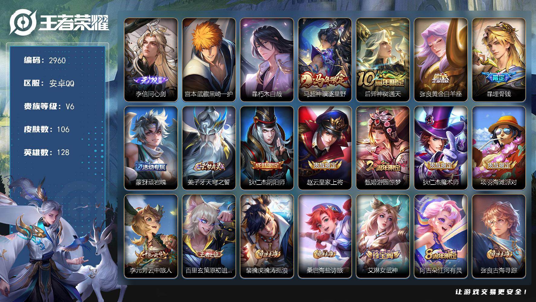 PX_2556035-小号李信问心剑-宫本武藏黑崎一护-暃朽木白哉-,安卓Q-V6-至尊星耀III段位-128英雄-106皮肤-1无双-2珍品传说-3传说-30史诗 【无双皮肤】:李信问心剑 【珍品传说】:宫本武藏黑崎一护,暃朽木白哉 【传说皮肤】:马超神骥逐星野,后羿神树通天,张良黄金白羊座 【限定皮肤】:暃埋骨钱,蒙犽顽岩魄,姜子牙天穹之誓,狄仁杰阴阳师,赵云皇家上将,甄姬游园惊梦,狄仁杰魔术师,项羽海滩派对,李元芳云中旅人,百里玄策原初追逐者,裴擒虎擒涛扼浪,桑启海盐诗旅,艾琳女武神,阿古朵江河有灵,张良古海寻踪,蒙恬荣光圣徽,鬼谷子天穹祈灯,刘邦剑破天穹,周瑜熔金海岸 【赛季限定】:李元芳云中旅人,桑启海盐诗旅,裴擒虎擒涛扼浪,张良古海寻踪,鬼谷子天穹祈灯,刘邦剑破天穹,姜子牙天穹之誓,钟馗虚灵犬护,甄姬逆浪荇歌,亚瑟荣光之誓,百里玄策原初追逐者,蒙恬荣光圣徽,牛魔星界战将,项羽九幽镇关 【战令限定】:刘禅鸭鸭历险记,沈梦溪鸭鸭历险记,周瑜线条小狗 【史诗皮肤】:周瑜线条小狗,项羽九幽镇关,女娲万灵启世,后羿石田雨龙,刘禅鸭鸭历险记,牛魔星界战将,暃埋骨钱,蒙犽顽岩魄,蒙恬荣光圣徽,阿古朵江河有灵,钟馗乐园奇幻夜,百里玄策原初追逐者,橘右京修罗,狄仁杰鹰眼统帅,孙策猫狗日记,白起星夜王子,铠曙光守护者,亚瑟心灵战警,甄姬游园惊梦,花木兰水晶猎龙者,吕布末日机甲,曹操幽灵船长,吕布圣诞狂欢,妲己女仆咖啡,妲己魅力维加斯,孙尚香水果甜心,宫本武藏鬼剑武藏,狄仁杰魔术师,甄姬冰雪圆舞曲,赵云未来纪元,赵云皇家上将 【其他皮肤】:虞姬溯影追猎,艾琳鹤鸣心笺,亚瑟荣光之誓,哪吒罗小黑战记,莱西奥踏浪烽翎,庄周锦麟游梦,甄姬逆浪荇歌,白起死霸装,姬小满小满鸭,露娜命运加冕,阿古朵布丁狗之约,张良灵野札记,苏烈春野闲踪,沈梦溪鸭鸭历险记,钟馗虚灵犬护,戈娅玫蓝誓约,周瑜熔金海岸,姜子牙天穹之誓,大司命暗都幽影,刘邦剑破天穹,鬼谷子天穹祈灯,亚连破局者,张良古海寻踪,裴擒虎擒涛扼浪,赵怀真太极少年,猪八戒潮玩探月行,海月幻泉雾影,桑启海盐诗旅,李元芳云中旅人,鲁班大师乓乓大师,刘禅秘密基地,狂铁特工战影,小乔丁香结,李白敏锐之力,狂铁命运角斗场,钟无艳海滩丽影,关羽龙腾万里,刘备汉昭烈帝,狄仁杰阴阳师,后羿阿尔法小队,宫本武藏万象初新,刘备万事如意,达摩拳王,亚瑟死亡骑士,典韦黄金武士,艾