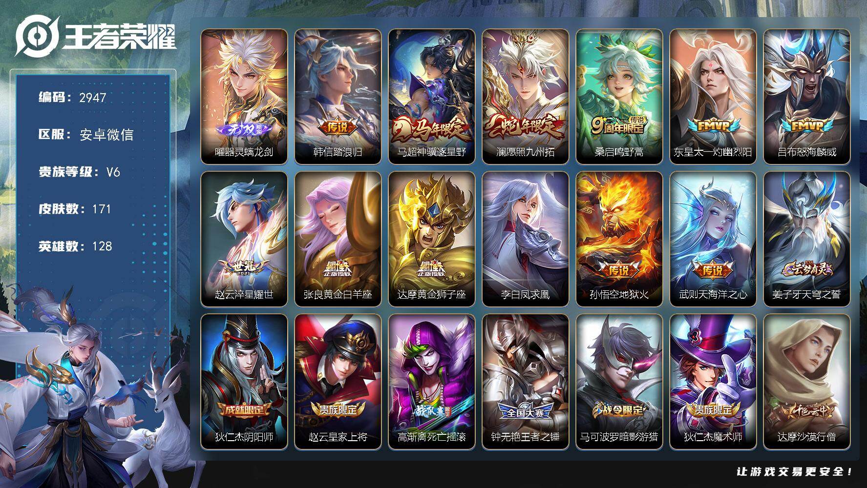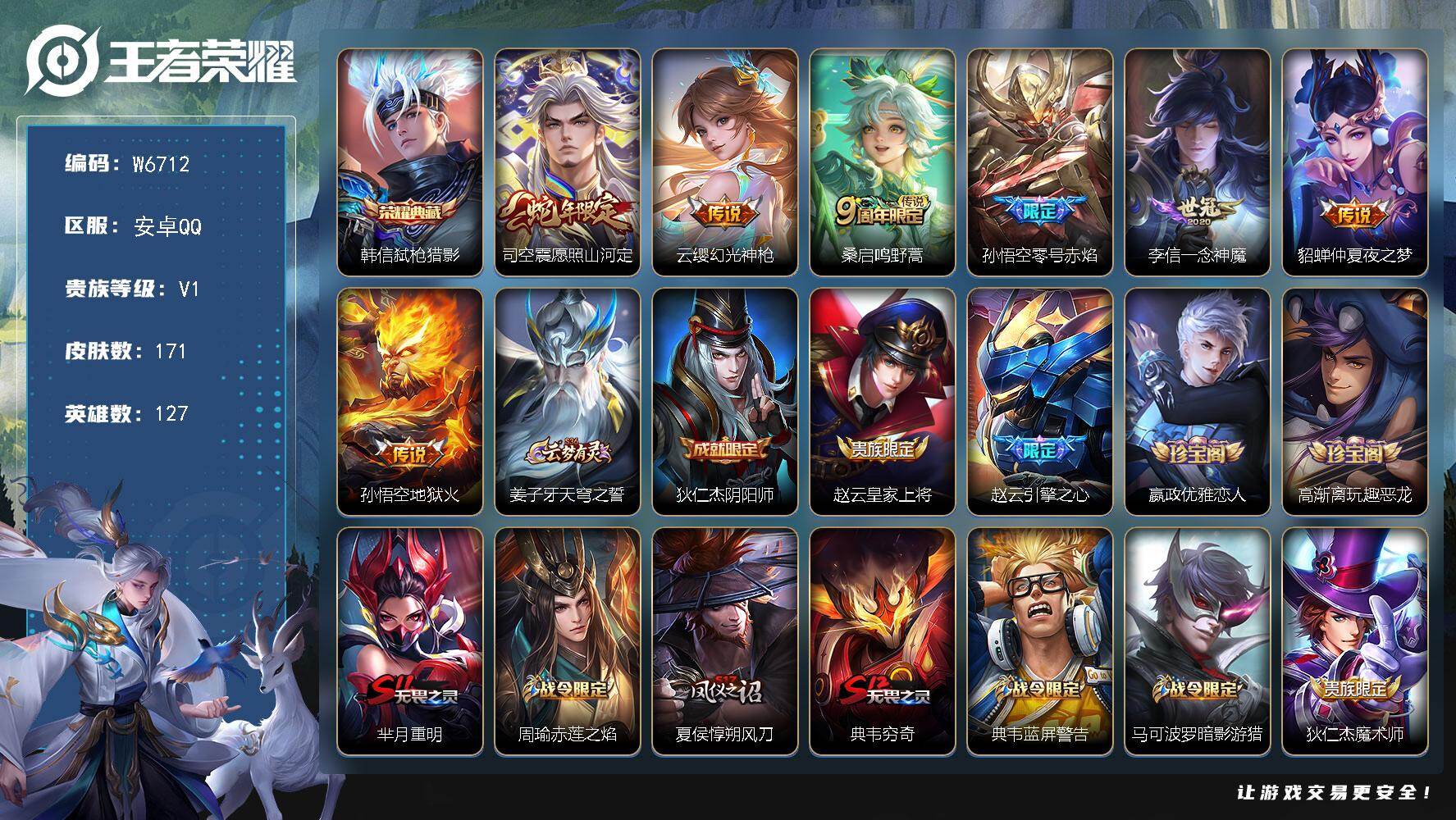 PX_2556039-灵螭龙剑,韩信踏浪归,凤求凰,马超神骥逐星野,1星传说安卓WX-V6-永恒钻石III段位-128英雄-171皮肤-1无双-12传说-42史诗 【英雄全皮】:敖隐全皮 【无双皮肤】:曜器灵螭龙剑 【传说皮肤】:韩信踏浪归,马超神骥逐星野,澜愿照九州拓,桑启鸣野蒿,东皇太一灼幽烈阳,吕布怒海麟威,赵云淬星耀世,张良黄金白羊座,达摩黄金狮子座,李白凤求凰,孙悟空地狱火,武则天海洋之心 【限定皮肤】:姜子牙天穹之誓,狄仁杰阴阳师,赵云皇家上将,高渐离死亡摇滚,钟无艳王者之锤,马可波罗暗影游猎,狄仁杰魔术师,达摩沙漠行僧,项羽海滩派对,程咬金演武夺筹,兰陵王金庭之子,李元芳云中旅人,鬼谷子五谷丰年,梦奇顽趣,沈梦溪大漠名商,裴擒虎李小龙,裴擒虎擒涛扼浪,鲁班大师探海日志,桑启海盐诗旅,艾琳女武神,阿古朵江河有灵,张良古海寻踪,鬼谷子天穹祈灯,沈梦溪龙舞盛年,程咬金群星魔术团 【年限皮肤】:李白凤求凰,澜愿照九州拓 【赛季限定】:程咬金演武夺筹,达摩沙漠行僧,兰陵王金庭之子,沈梦溪大漠名商,李元芳云中旅人,桑启海盐诗旅,裴擒虎擒涛扼浪,鲁班大师探海日志,张良古海寻踪,鬼谷子天穹祈灯,姜子牙天穹之誓,东皇太一噬灭天穹,太乙真人谧流熔炉,钟馗虚灵犬护,甄姬逆浪荇歌,亚瑟荣光之誓,梦奇顽趣 【战令限定】:马可波罗暗影游猎,孙膑茶境仙,马超访茗客,周瑜线条小狗,小乔线条小狗 【史诗皮肤】:钟馗锁墨魂,周瑜线条小狗,小乔线条小狗,后羿石田雨龙,狂铁龙之律动,阿轲化蝶舞,赵怀真器灵浮梦炉,孙膑茶境仙,姬小满战舞者,阿古朵江河有灵,梦奇顽趣,鬼谷子五谷丰年,司马懿暗渊魔法,裴擒虎李小龙,马可波罗暗影游猎,瑶遇见神鹿,娜可露露晚萤,狄仁杰鹰眼统帅,伽罗箭羽风息,孙策猫狗日记,程咬金功夫厨神,李元芳逐浪之夏,铠曙光守护者,百里守约特工魅影,亚瑟心灵战警,诸葛亮黄金分割率,兰陵王暗隐猎兽者,花木兰水晶猎龙者,张飞乱世虎臣,李白千年之狐,曹操幽灵船长,墨子金属风暴,妲己魅力维加斯,嬴政暗夜贵公子,孙尚香水果甜心,宫本武藏鬼剑武藏,狄仁杰魔术师,王昭君偶像歌手,甄姬冰雪圆舞曲,赵云皇家上将,钟无艳王者之锤,项羽苍穹之光,鲁班七号电玩小子 【其他皮肤】:影百相守梦,兰陵王雾影缉谜,虞姬溯影追猎,蚩奼极光幻客,艾琳鹤鸣心笺,亚瑟荣光之誓,鬼谷子克喵,莱西奥踏浪烽翎,云中君云械蓝图,甄姬逆浪荇歌,姬小