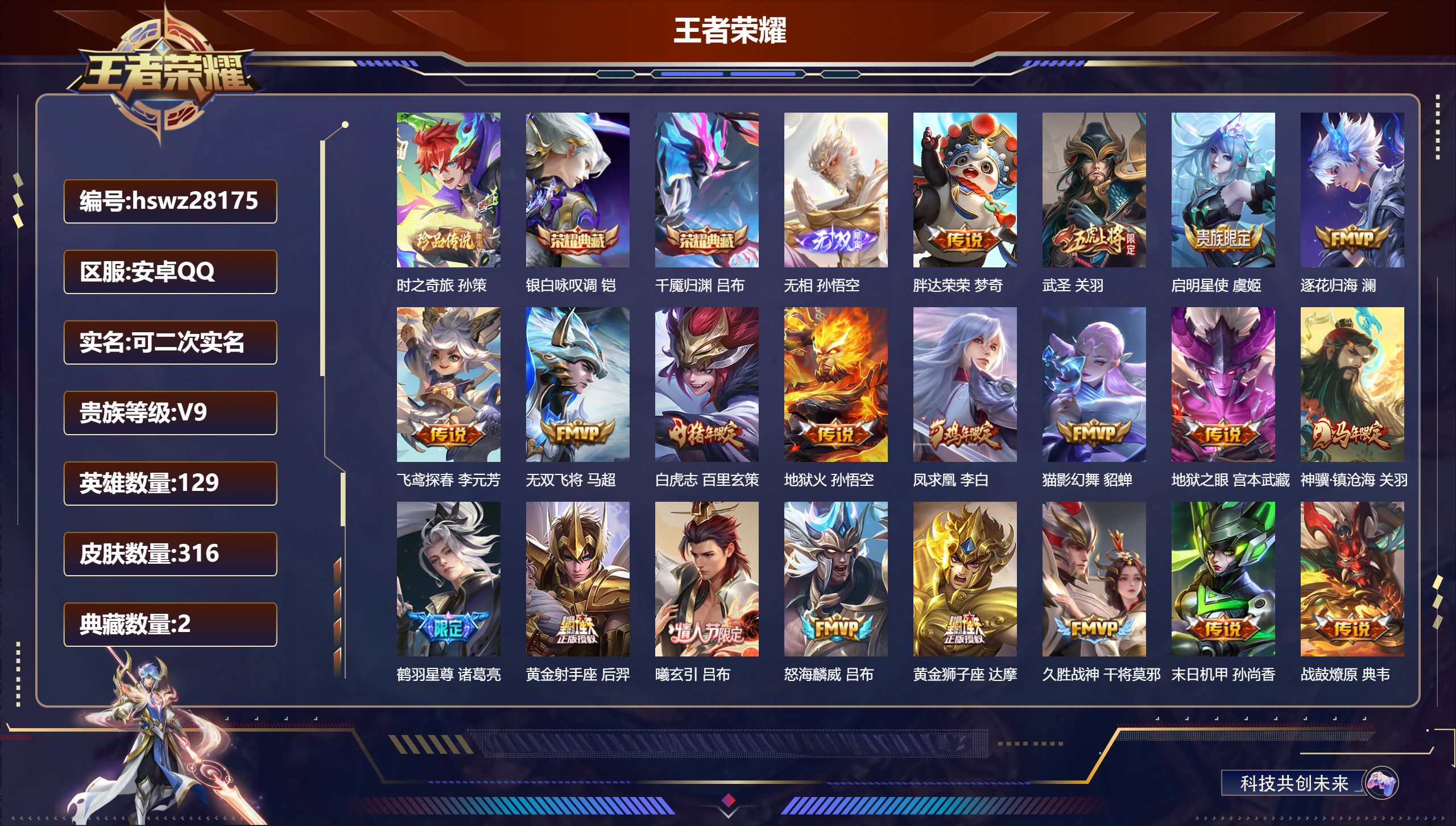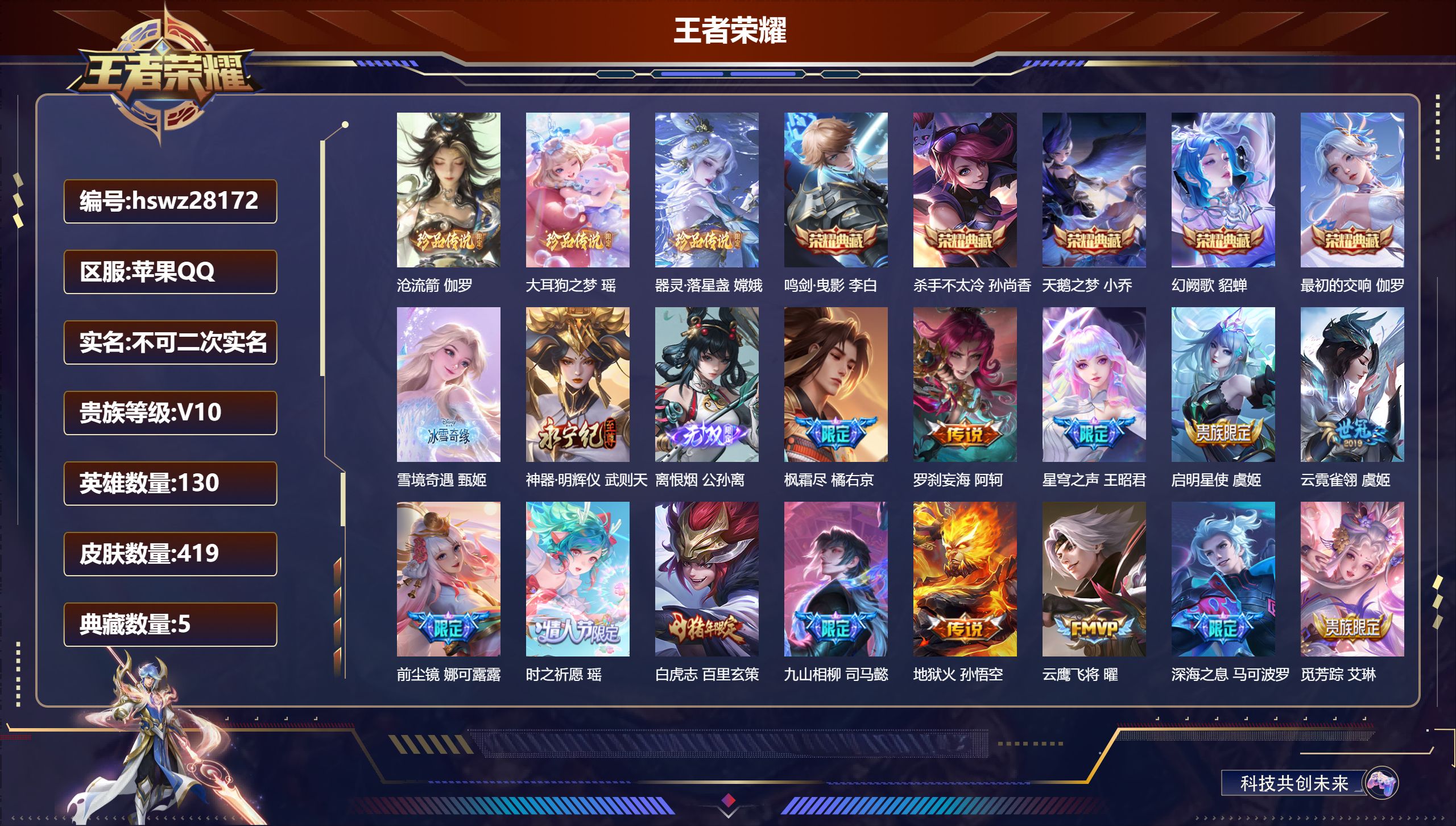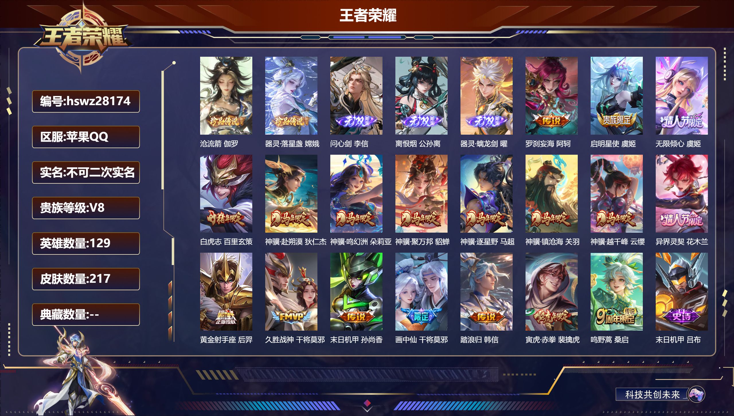 PX_2556031-Q/至尊星耀/217皮肤/129英雄/0典藏/0珍品无双/3无双/2珍品传说/18传说/56史诗/9稀有英雄 【2,珍品传说】沧流箭,伽罗,器灵·落星盏,嫦娥, 【3,无双皮肤】问心剑,李信,离恨烟,公孙离,器灵·螭龙剑,曜, 【18,传说皮肤】罗刹妄海,阿轲,启明星使,虞姬,无限倾心,虞姬,白虎志,百里玄策,神骥·赴朔漠,狄仁杰,神骥·鸣幻洲,朵莉亚,神骥·聚万邦,貂蝉,神骥·逐星野,马超,神骥·镇沧海,关羽,神骥·越千峰,云缨,异界灵契,花木兰,黄金射手座,后羿,久胜战神,干将莫邪,末日机甲,孙尚香,画中仙,干将莫邪,踏浪归,韩信,寅虎·赤拳,裴擒虎,鸣野蒿,桑启, 【56,史诗皮肤】末日机甲,吕布,紫霞仙子,露娜,银河之约,李元芳,暗影游猎,马可波罗,冰霜恋舞曲,干将莫邪,妄想食味,姬小满,心灵战警,亚瑟,星君·亢金,达摩,五谷丰年,鬼谷子,无心,元歌,鬼剑武藏,宫本武藏,瓦猫非猫,太乙真人,锁墨魂,钟馗,线条小狗,周瑜,百晓客,明世隐,顽趣,梦奇,魅力维加斯,妲己,黄金分割率,诸葛亮,偶像歌手,王昭君,荣光圣徽,蒙恬,女仆咖啡,妲己,晚萤,娜可露露,鹰眼统帅,狄仁杰,大圣娶亲,孙悟空,李小龙,裴擒虎,春霖将至,上官婉儿,纤云弄巧,云中君,金属风暴,墨子,傲雪梅枪,韩信,特工魅影,百里守约,猫狗日记,孙策,原初追逐者,百里玄策,逐浪之夏,李元芳,黎明之约,雅典娜,魔术师,狄仁杰,龙之律动,狂铁,皇家上将,赵云,冰冠公主,雅典娜,梁祝,上官婉儿,圣诞恋歌,貂蝉,云间偶戏,元歌,水晶猎龙者,花木兰,蔷薇恋人,孙尚香,冰雪圆舞曲,甄姬,节奏热浪,阿轲,暗夜猫娘,阿轲,曙光守护者,铠,万灵启世,女娲,心灵骇客,安琪拉,线条小狗,小乔,水果甜心,孙尚香,化蝶舞,阿轲,江河有灵,阿古朵,幽灵船长,曹操,乘风破浪,夏侯惇,暗隐猎兽者,兰陵王, 【106,勇者皮肤】圆桌骑士,盾山,爱心护理,阿轲,沙漠行僧,达摩,大漠名商,沈梦溪,缤纷绘卷,张良,纽约教父,刘备,拳王,达摩,大发明家,达摩,丁香结,小乔,功夫炙烤,廉颇,沉稳之力,孙尚香,爱与正义,程咬金,海盐诗旅,桑启,朔风刀,夏侯惇,醍醐杖,老夫子,归虚梦演,孙膑,白色死神,白起,黑桃队长,鲁班七号,黄金武士,典韦,御旌,牛魔,阴阳师,狄仁杰,径山谋武,孙权,次元突破,哪吒,古海寻踪,张良,功夫老勺,老夫子,西部大镖客,牛魔,鲨炮海盗猫,沈梦溪,海滩派对,项羽,万华元夜,狄仁杰,演武夺筹,程咬金,红桃皇后,芈月,野性能量,吕布,哥特玫瑰,露娜,守护之力,大乔,无双福将,程咬金,百相守梦,影,原初探秘者,鬼谷子,星空之诺,沈梦溪,潮玩探月行,猪八戒,天穹祈灯,鬼谷子,西部大镖客,猪八戒,疑决卦,明世隐,化身博士,扁鹊,潮玩骑士王,亚瑟,五福同心,张飞,幻乐之宴,鬼谷子,东方不败,武则天,霸王丸,宫本武藏,虹云星官,明世隐,雾影缉谜,兰陵王,舞狮寰,吕布,赤刃凌霄,敖隐,死亡骑士,亚瑟,敏锐之力,李白,危途狂花,戈娅,破局者,亚连,玩偶对对碰,安琪拉,掌控之力,诸葛亮,海滩丽影,钟无艳,忍·炎影,赵云,雪境奇遇,西施,炽热元素使,姜子牙,坚韧之力,苏烈,唤灵魔甲,刘禅,擒涛扼浪,裴擒虎,乓乓大师,鲁班大师,极光幻客,蚩奼,探海日志,鲁班大师,天使之翼,孙膑,雾都夜雨,干将莫邪,兔女郎,花木兰,龙腾万里,关羽,金庭之子,兰陵王,未来纪元,宫本武藏,千军破阵,苏烈,荣光之誓,亚瑟,花好人间,甄姬,万象初新,宫本武藏,聚星闪耀,钟无艳,御銮,盾山,秘密基地,刘禅,教廷特使,韩信,街头霸王,韩信,云中旅人,李元芳,西部大镖客,孙悟空,少女阿狸,妲己,混沌棋,弈星,御霄,米莱狄,蔚蓝守将,蒙恬,幻想奇妙夜,王昭君,驱傩正仪,钟馗,特工战影,狂铁,御狮,狂铁,班班快跑,鲁班七号,白执事,赵云,劲辣红锅,太乙真人,剑破天穹,刘邦,铁骨偃魂,典韦,苍林狼骑,苍,魅影绮裳,影,星梦巡礼,姜子牙,谧流熔炉,太乙真人,鹤鸣心笺,艾琳,线条小狗,周瑜,线条小狗,桑启,噬灭天穹,东皇太一, 【36,其他皮肤】沧流箭,伽罗,战争骑士,夏侯惇,三太子,哪吒,棒球奇才,沈梦溪,花见巫女,伽罗,未来旅行,孙膑,第七人偶,干将莫邪,万圣前夜,小乔,灼热之刃,李信,木偶奇遇记,鲁班七号,绯红之刃,露娜,冰刃幻境,镜,碧珀绯影,暃,海军大将,周瑜,星航指挥官,诸葛亮,英喵野望,刘禅,霓裳曲,杨玉环,花间舞,公孙离,街头旋风,裴擒虎,范海辛,李白,激情绿茵,马可波罗,阿摩司公爵,鬼谷子,锦衣卫,狄仁杰,归虚梦演,曜,威尼斯狂欢,百里玄策,幸存者,马超,战争女神,雅典娜,创世神祝,盘古,绝影神枪,百里守约,孤猎,澜,加勒比小姐,虞姬,精准探案法,米莱狄,赤焰之缨,云缨,美梦成真,梦奇,西部大镖客,孙悟空,器灵·落星盏,嫦娥, 【9,稀有英雄】敖隐,嬴政,不知火舞,橘右京,夏洛特,娜可露露,韩信,艾琳,赵云, 营地ID:,