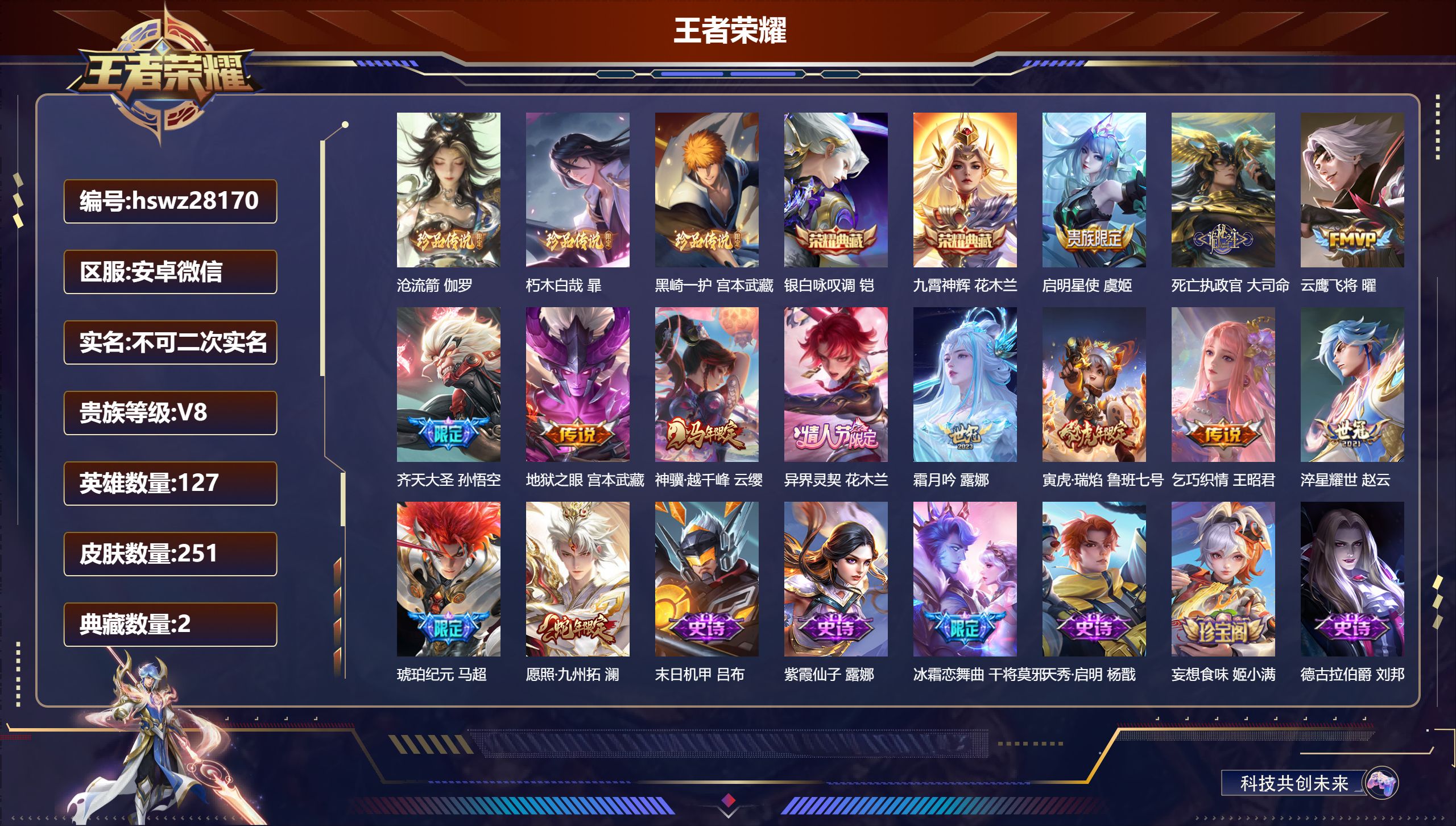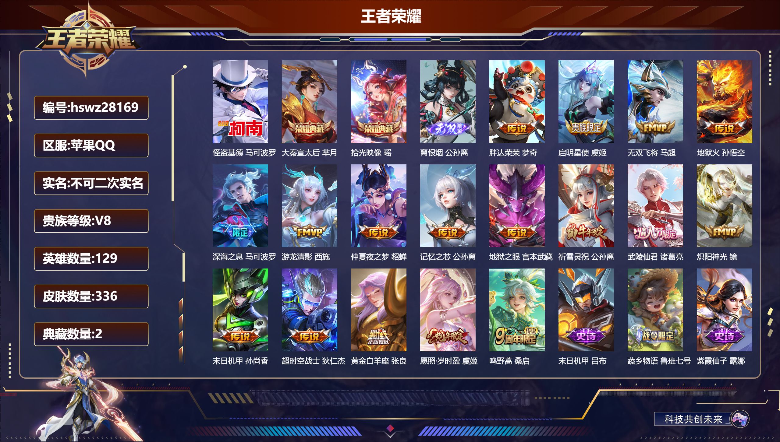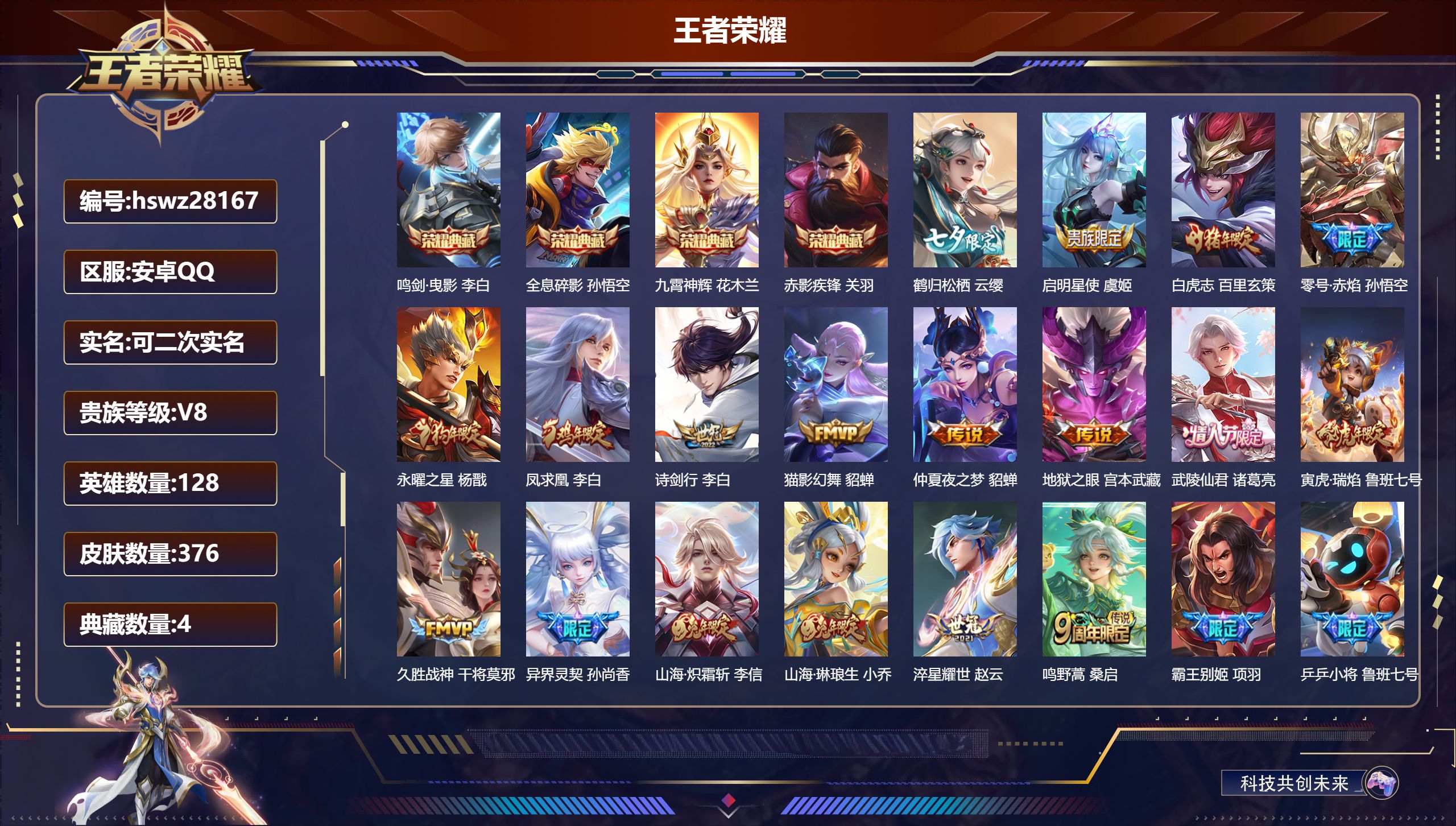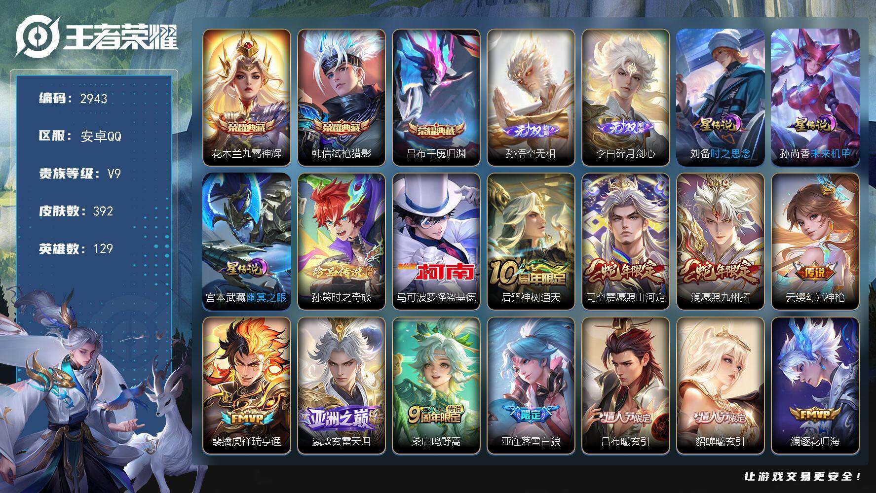 PX_2556006-Q-V9-尊贵铂金II段位-129英雄-392皮肤-3典藏皮肤-2无双-2珍品传说-35传说-114史诗 【英雄全皮】:孙权全皮,猪八戒全皮,敖隐全皮,蒙恬全皮,阿古朵全皮,司空震全皮,戈娅全皮,空空儿全皮,影全皮 【荣耀典藏】:花木兰九霄神辉,韩信弑枪猎影,吕布千魇归渊 【无双皮肤】:孙悟空无相,李白碎月剑心 【珍品传说】:孙策时之奇旅,马可波罗怪盗基德 【传说皮肤】:后羿神树通天,司空震愿照山河定,澜愿照九州拓,云缨幻光神枪,裴擒虎祥瑞亨通,嬴政玄雷天君,桑启鸣野蒿,亚连落雪白狼,吕布曦玄引,貂蝉曦玄引,澜逐花归海,露娜霜月吟,宫本武藏惊梅引,马可波罗妄想实况,公孙离记忆之芯,孙悟空齐天大圣,吕布怒海麟威,李白诗剑行,马超无双飞将,王昭君乞巧织情,李元芳飞鸢探春,镜炽阳神光,虞姬启明星使,关羽武圣,曜云鹰飞将,李信一念神魔,刘备时之恋人,干将莫邪久胜战神,达摩黄金狮子座,百里玄策白虎志,花木兰冠军飞将,梦奇胖达荣荣,后羿黄金射手座,孙尚香末日机甲,宫本武藏地狱之眼 【限定皮肤】:姜子牙天穹之誓,杨戬破阵退雄兵,李白谪仙醉月,狄仁杰阴阳师,赵云皇家上将,妲己时之彼端,嬴政白昼王子,庄周高山流水,高渐离死亡摇滚,高渐离玩趣恶龙,钟无艳超时空战士,扁鹊奇幻香踪,白起夜都怪侠,芈月幻夜卜梦,元歌云间偶戏,元歌无心,甄姬落雪兰心,典韦蓝屏警告,马可波罗暗影游猎,马可波罗山海玄木吟,马可波罗妄想实况,狄仁杰魔术师,狄仁杰万华元夜,达摩沙漠行僧,项羽海滩派对,老夫子醍醐杖,关羽武圣,程咬金演武夺筹,韩信飞衡,王昭君午后时光,兰陵王金庭之子,孙悟空至尊宝,孙悟空大圣娶亲,孙悟空孙行者,孙悟空齐天大圣,后羿圣弓游侠,李元芳银河之约,李元芳云中旅人,虞姬启明星使,钟馗驱傩正仪,杨玉环遇见飞天,杨戬潮玩骑兵,干将莫邪胡桃夹子,干将莫邪真爱魔法,雅典娜单词大作战,雅典娜黎明之约,太乙真人华丽摇滚,鬼谷子原初探秘者,鬼谷子五谷丰年,黄忠火炮绅士,苏烈千军破阵,百里玄策白虎志,百里玄策原初追逐者,百里守约朱雀志,梦奇顽趣,沈梦溪星空之诺,沈梦溪大漠名商,明世隐疑决卦,明世隐吟游魔法,裴擒虎李小龙,裴擒虎擒涛扼浪,狂铁电玩高手,云中君纤云弄巧,猪八戒西部大镖客,猪八戒猪悟能,上官婉儿梁祝,嫦娥拒霜思,嫦娥暖冬兔眠,西施玲珑珍味,西施至美乘鲤谣,蒙犽狂想玩偶喵,鲁班大师探海日志,桑启海盐