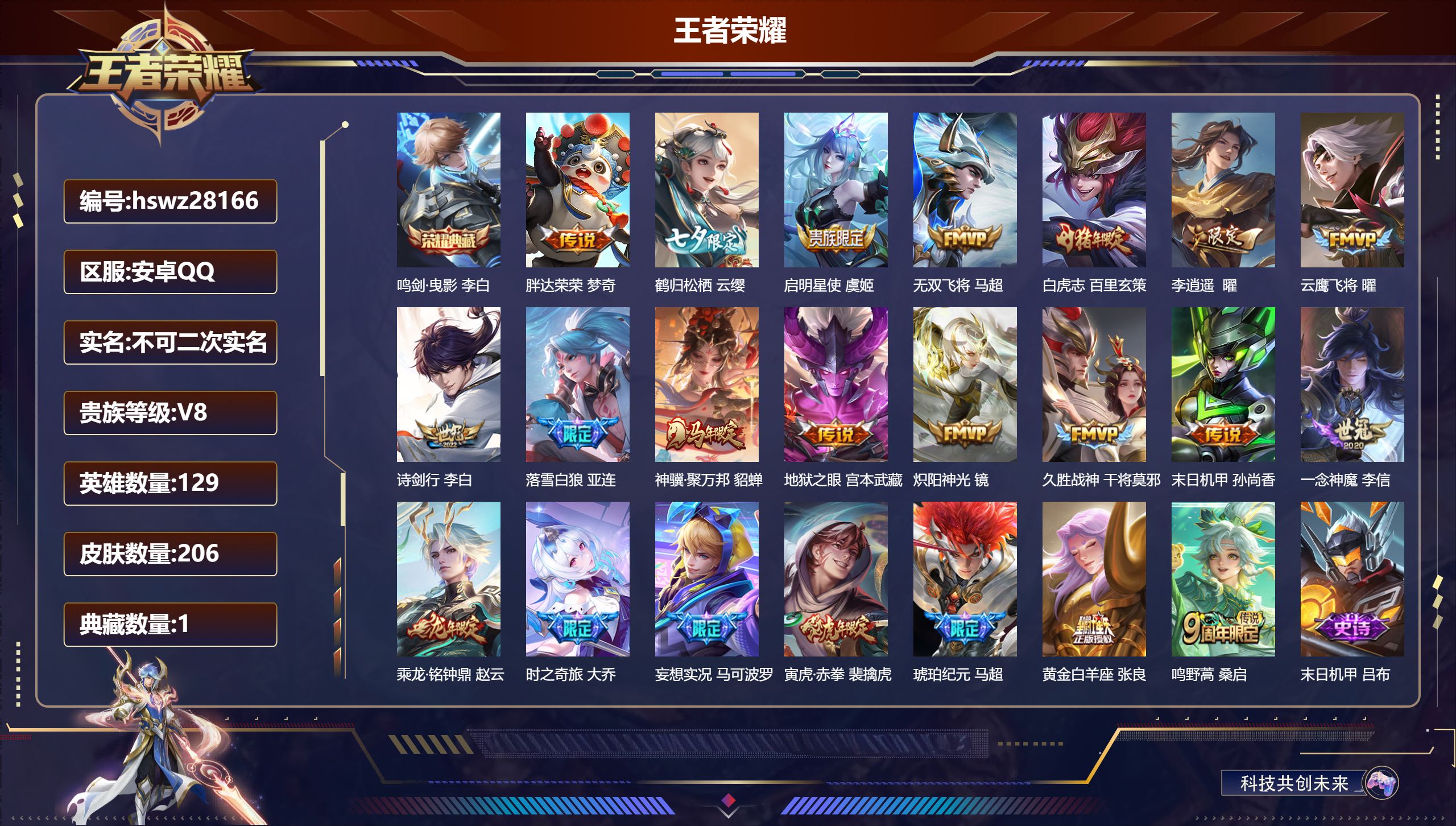 PX_2556007-Q/永恒钻石/206皮肤/129英雄/1典藏/0珍品无双/0无双/0珍品传说/22传说/66史诗/9稀有英雄 【1,典藏皮肤】鸣剑·曳影,李白, 【22,传说皮肤】胖达荣荣,梦奇,鹤归松栖,云缨,启明星使,虞姬,无双飞将,马超,白虎志,百里玄策,李逍遥,,曜,云鹰飞将,曜,诗剑行,李白,落雪白狼,亚连,神骥·聚万邦,貂蝉,地狱之眼,宫本武藏,炽阳神光,镜,久胜战神,干将莫邪,末日机甲,孙尚香,一念神魔,李信,乘龙·铭钟鼎,赵云,时之奇旅,大乔,妄想实况,马可波罗,寅虎·赤拳,裴擒虎,琥珀纪元,马超,黄金白羊座,张良,鸣野蒿,桑启, 【66,史诗皮肤】末日机甲,吕布,蔬乡物语,鲁班七号,超元猎域,百里玄策,紫霞仙子,露娜,暗渊魔法,司马懿,燃音魔法,高渐离,妄想食味,姬小满,无心,元歌,鬼剑武藏,宫本武藏,百相守梦,黄忠,星夜王子,白起,无限星赏官,公孙离,线条小狗,周瑜,修罗,橘右京,魅力维加斯,妲己,黄金分割率,诸葛亮,完美假期,米莱狄,女仆咖啡,妲己,赏金猎手,澜,九幽镇关,项羽,星界游侠,暃,晚萤,娜可露露,暗夜贵公子,嬴政,鹰眼统帅,狄仁杰,如梦令,后羿,龙骑士,墨子,金属风暴,墨子,匿光侦查者,李元芳,特工魅影,百里守约,逐浪之夏,李元芳,未来纪元,赵云,驭风魔法,戈娅,魔术师,狄仁杰,龙之律动,狂铁,皇家上将,赵云,功夫厨神,程咬金,梁祝,上官婉儿,水晶猎龙者,花木兰,破空之剑,亚连,御风骁将,吕布,圣诞狂欢,吕布,魅语,不知火舞,器灵·浮梦炉,赵怀真,永昼,夏洛特,地狱岩魂,廉颇,冰雪圆舞曲,甄姬,千年之狐,李白,节奏热浪,阿轲,织梦人,西施,青春决赛季,花木兰,曙光守护者,铠,万灵启世,女娲,心灵骇客,安琪拉,匿光破解者,沈梦溪,夜都魔契,曹操,乱世虎臣,张飞,绅士熊喵,刘禅,缤纷独角兽,小乔,线条小狗,小乔,时之恋人,孙尚香,水果甜心,孙尚香,化蝶舞,阿轲,江河有灵,阿古朵,幽灵船长,曹操,乘风破浪,夏侯惇,暗隐猎兽者,兰陵王, 【90,勇者皮肤】玲珑珍味,西施,汉昭烈帝,刘备,热血海滩,哪吒,白色死神,白起,黄金武士,典韦,阴阳师,狄仁杰,古海寻踪,张良,西部大镖客,牛魔,海滩派对,项羽,完美运算,后羿,克喵,鬼谷子,踏浪烽翎,莱西奥,红桃皇后,芈月,西部游侠,莱西奥,猎兽之王,吕布,守护之力,大乔,百相守梦,影,潮玩探月行,猪八戒,天穹祈灯,鬼谷子,化身博士,扁鹊,阿尔法小队,后羿,金色潮汐,朵莉亚,东方不败,武则天,赤刃凌霄,敖隐,死亡骑士,亚瑟,浪漫序章,刘备,敏锐之力,李白,危途狂花,戈娅,破局者,亚连,玩偶对对碰,安琪拉,掌控之力,诸葛亮,忍·炎影,赵云,雪境奇遇,西施,炽热元素使,姜子牙,坚韧之力,苏烈,唤灵魔甲,刘禅,万事如意,刘备,乓乓大师,鲁班大师,溯影追猎,虞姬,极光幻客,蚩奼,探海日志,鲁班大师,女武神,艾琳,天使之翼,孙膑,雾都夜雨,干将莫邪,龙腾万里,关羽,未来纪元,宫本武藏,罗小黑战记,哪吒,零食大作战,姬小满,荣光之誓,亚瑟,花好人间,甄姬,万象初新,宫本武藏,聚星闪耀,钟无艳,时尚教父,姜子牙,春野之旅,钟无艳,秘密基地,刘禅,教廷特使,韩信,街头霸王,韩信,妄想特派,李元芳,西部大镖客,孙悟空,蔬乡物语,李元芳,灵卜魔法,妲己,蔚蓝守将,蒙恬,春野闲踪,苏烈,布丁狗之约,阿古朵,命运加冕,露娜,小满鸭,姬小满,幻想奇妙夜,王昭君,灵野札记,张良,潮玩士官长,雅典娜,命运角斗场,狂铁,虚灵犬护,钟馗,班班快跑,鲁班七号,白执事,赵云,神迹守卫,孙悟空,铁骨偃魂,典韦,苍林狼骑,苍,天穹之誓,姜子牙,魅影绮裳,影,星梦巡礼,姜子牙,谧流熔炉,太乙真人,暗都幽影,大司命,鹤鸣心笺,艾琳,云械蓝图,云中君,逆浪荇歌,甄姬,海之女神,海月,线条小狗,周瑜,噬灭天穹,东皇太一,敬我三分,盘古,玫蓝誓约,戈娅,景韶洛都,明世隐, 【29,其他皮肤】战争骑士,夏侯惇,潮流仙人,老夫子,棒球奇才,沈梦溪,龙域领主,铠,爱与和平,苏烈,灼热之刃,李信,木偶奇遇记,鲁班七号,福禄兄弟,鲁班七号,帝国元帅,项羽,碧珀绯影,暃,魇语军师,司马懿,启蛰,司空震,修竹墨客,上官婉儿,激情绿茵,马可波罗,埃及法老,杨戬,阿摩司公爵,鬼谷子,年年有余,猪八戒,一千零一夜,张良,归虚梦演,曜,幸存者,马超,战争女神,雅典娜,创世神祝,盘古,特种部队,李元芳,绝影神枪,百里守约,秩序猎龙将,蒙恬,精准探案法,米莱狄,赤焰之缨,云缨,露花倒影,嫦娥,西部大镖客,孙悟空, 【9,稀有英雄】敖隐,嬴政,不知火舞,橘右京,夏洛特,娜可露露,韩信,艾琳,赵云, 营地ID:,
