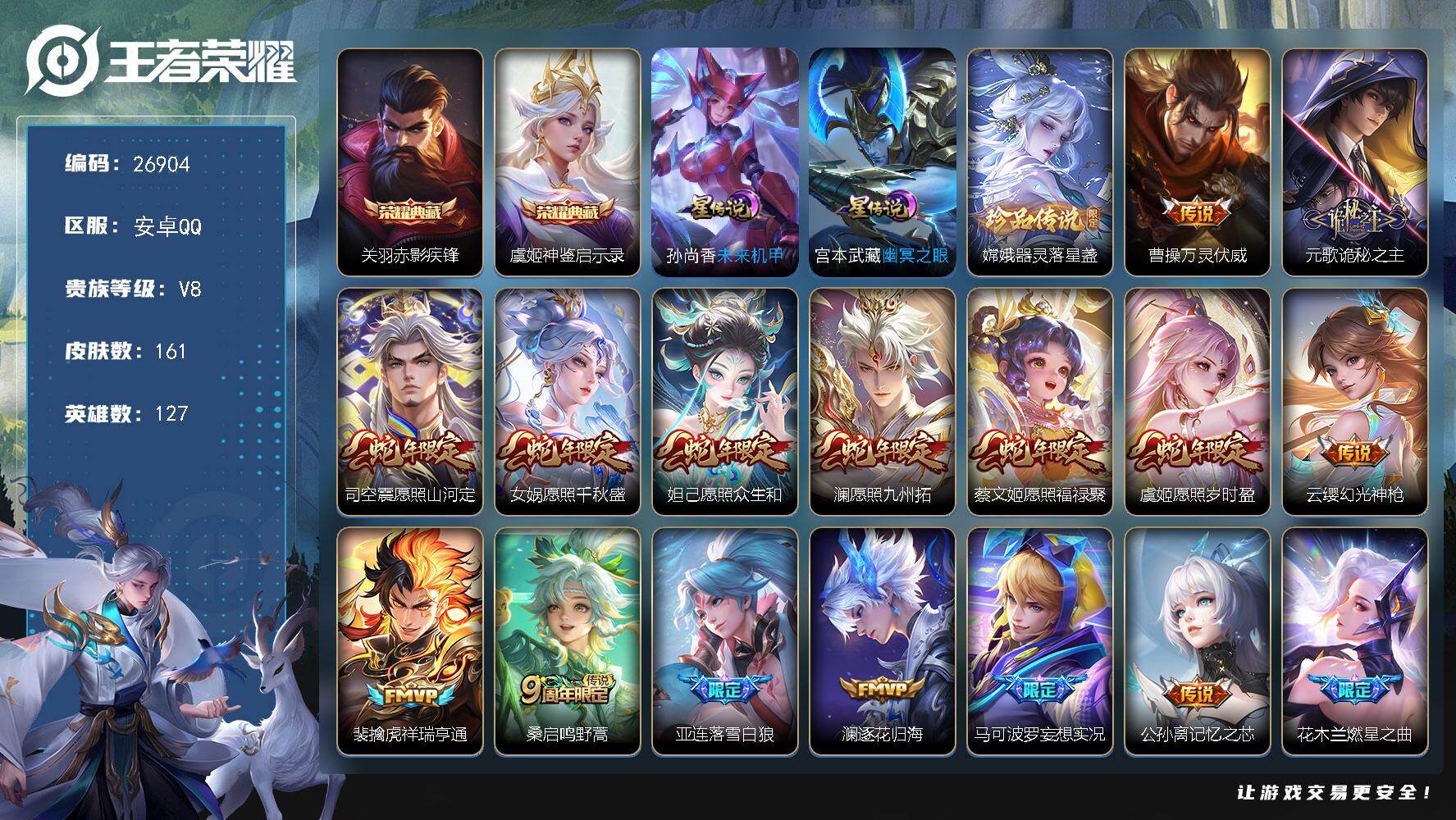 PX_2539725-实名:,可修改,贵族等级:,V9,英雄数:,128,皮肤数:,361,荣耀水晶:,杀手不太冷,鸣剑·曳影,星传说:,未来机甲,幽冥之眼,幽冥火,金色仲夏夜,传说皮:,黄金狮子座,冠军飞将,绛天战甲,黄金白羊座,猫影幻舞,炽阳神光,末日机甲-孙尚香,地狱火,仲夏夜之梦,零号·赤焰,地狱之眼,飞鸢探春,李逍遥,超时空战士-狄仁杰,无双飞将,记忆之芯,妄想实况,夜礼服假面,乘龙·问璇玑,限定皮:,冰锋战神,李小龙,奔雷神使,祈雪灵祝,梁祝,御风骁将,时雨天司,引擎之心,辉光之辰,天狼溯光者,蜜橘之夏,永曜之星,飞衡,冰霜恋舞曲,逐梦之星,神奇女侠,白虎志,瑞麟志,朱雀志,至尊宝,一生所爱,大圣娶亲,默契交锋-花木兰,高山流水,玉兔公主,五谷丰年,鸣野蒿,逐霄战戟