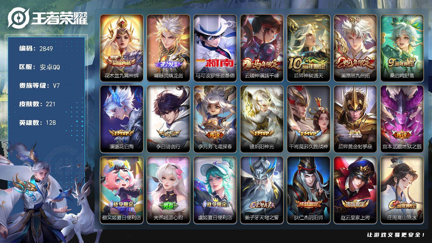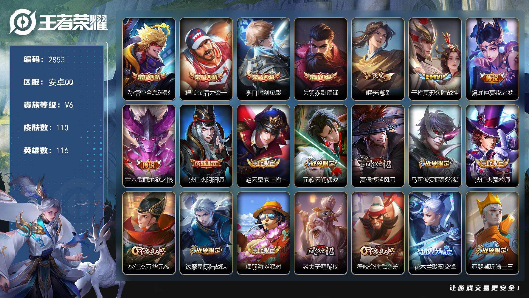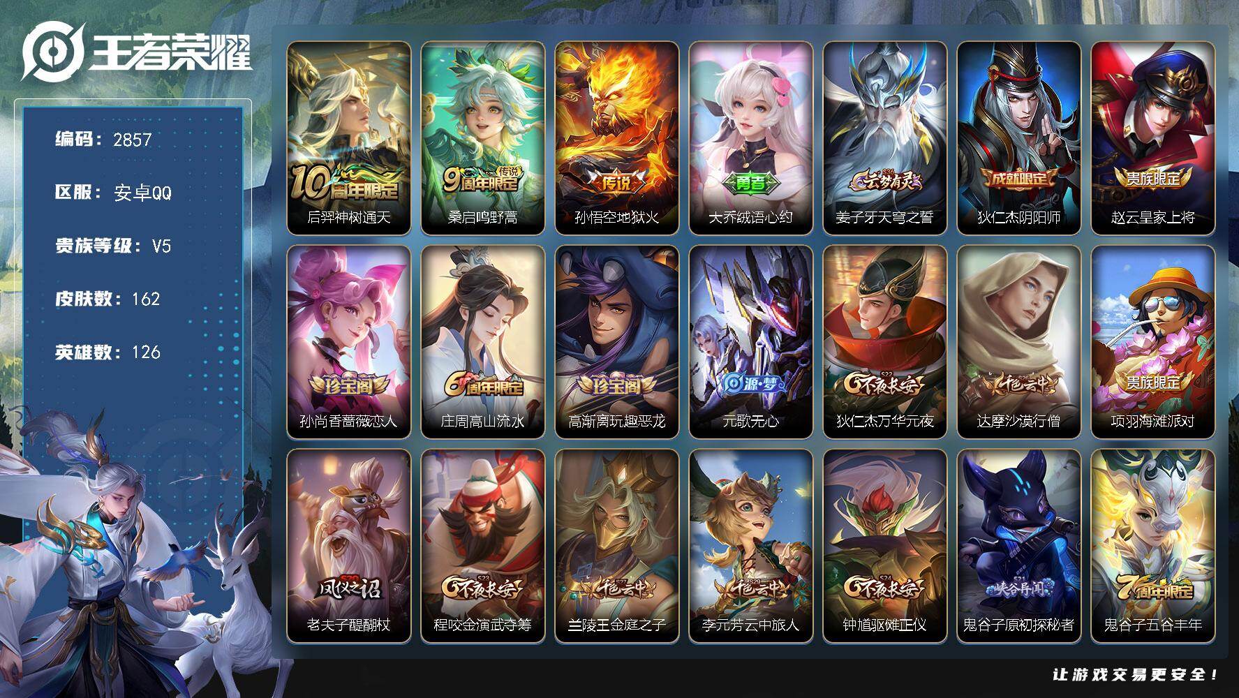 PX_2549156-Q-V5-最强王者段位-126英雄-162皮肤-3传说-29史诗 【英雄全皮】:孙权全皮,敖隐全皮,空空儿全皮,影全皮 【传说皮肤】:后羿神树通天,桑启鸣野蒿,孙悟空地狱火 【限定皮肤】:大乔绒语心约,姜子牙天穹之誓,狄仁杰阴阳师,赵云皇家上将,孙尚香蔷薇恋人,庄周高山流水,高渐离玩趣恶龙,元歌无心,狄仁杰万华元夜,达摩沙漠行僧,项羽海滩派对,老夫子醍醐杖,程咬金演武夺筹,兰陵王金庭之子,李元芳云中旅人,钟馗驱傩正仪,鬼谷子原初探秘者,鬼谷子五谷丰年,沈梦溪大漠名商,明世隐疑决卦,裴擒虎李小龙,嫦娥拒霜思,桑启海盐诗旅,鬼谷子天穹祈灯,伽罗琥珀纪元,刘备异域游侠 【赛季限定】:明世隐疑决卦,老夫子醍醐杖,鬼谷子原初探秘者,狄仁杰万华元夜,程咬金演武夺筹,钟馗驱傩正仪,达摩沙漠行僧,兰陵王金庭之子,沈梦溪大漠名商,李元芳云中旅人,桑启海盐诗旅,鬼谷子天穹祈灯,姜子牙天穹之誓,东皇太一噬灭天穹,太乙真人谧流熔炉,钟馗虚灵犬护,甄姬逆浪荇歌,亚瑟荣光之誓 【战令限定】:周瑜线条小狗 【史诗皮肤】:周瑜线条小狗,少司缘巫礼祀神,女娲万灵启世,公孙离涂山容容,黄忠百相守梦,狂铁龙之律动,阿轲化蝶舞,伽罗琥珀纪元,元歌无心,鬼谷子五谷丰年,嫦娥拒霜思,庄周高山流水,裴擒虎李小龙,娜可露露晚萤,狄仁杰鹰眼统帅,李元芳逐浪之夏,刘禅天才门将,铠曙光守护者,安琪拉心灵骇客,小乔缤纷独角兽,夏侯惇乘风破浪,李白千年之狐,曹操幽灵船长,妲己魅力维加斯,孙尚香水果甜心,孙尚香蔷薇恋人,宫本武藏鬼剑武藏,廉颇地狱岩魂,赵云未来纪元,赵云皇家上将 【其他皮肤】:影百相守梦,吕布舞狮寰,兰陵王雾影缉谜,妲己线条小狗,蒙恬苍云破阵,安琪拉糖果风暴,虞姬溯影追猎,蚩奼极光幻客,曹操逐霄之志,艾琳鹤鸣心笺,孙权径山谋武,亚瑟荣光之誓,哪吒罗小黑战记,桑启青衿临川,鬼谷子克喵,莱西奥踏浪烽翎,高渐离落日弦歌,空空儿戏梦巡演,甄姬逆浪荇歌,白起死霸装,姬小满小满鸭,雅典娜潮玩士官长,露娜命运加冕,钟馗虚灵犬护,刘备浪漫序章,戈娅玫蓝誓约,明世隐景韶洛都,东皇太一金福满堂,姜子牙星梦巡礼,西施雪境奇遇,影魅影绮裳,典韦铁骨偃魂,太乙真人谧流熔炉,苍苍林狼骑,吕布逐霄战戟,亚瑟动物派对,东皇太一噬灭天穹,大乔绒语心约,姜子牙天穹之誓,刘备异域游侠,盘古经纬探寻者,扁鹊无尽旅途,嫦娥漠中幻影,海诺时空谍影