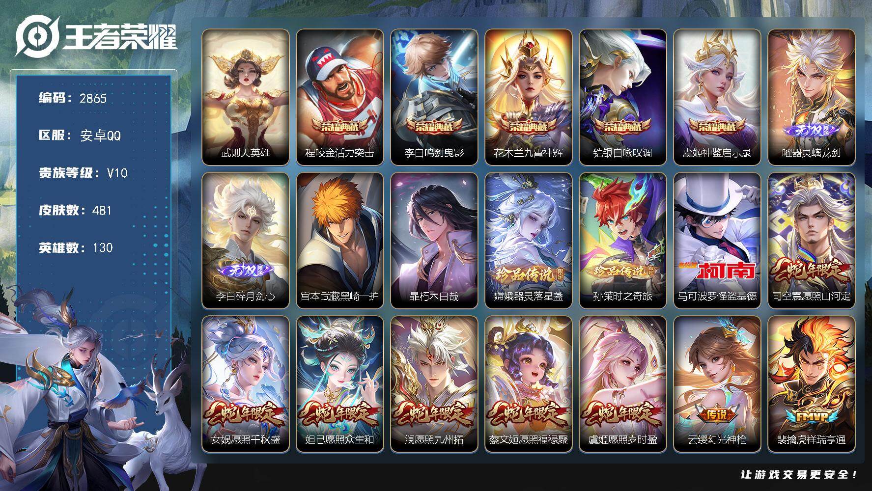 PX_2549188-?,30个性按键,4星元。5典藏皮肤+武则天,2无双,5珍品。安卓Q-V10-永恒钻石IV段位-130英雄-481皮肤-5典藏皮肤-1典藏英雄-2无双-5珍品传说-50传说-143史诗 【英雄全皮】:宫本武藏全皮,姜子牙全皮,孙权全皮,猪八戒全皮,嫦娥全皮,敖隐全皮,司空震全皮,暃全皮,赵怀真全皮,戈娅全皮,空空儿全皮,影全皮 【荣耀典藏】:武则天英雄,程咬金活力突击,李白鸣剑曳影,花木兰九霄神辉,铠银白咏叹调,虞姬神鉴启示录 【无双皮肤】:曜器灵螭龙剑,李白碎月剑心 【珍品传说】:宫本武藏黑崎一护,暃朽木白哉,嫦娥器灵落星盏,孙策时之奇旅,马可波罗怪盗基德 【传说皮肤】:司空震愿照山河定,女娲愿照千秋盛,妲己愿照众生和,澜愿照九州拓,蔡文姬愿照福禄聚,虞姬愿照岁时盈,云缨幻光神枪,裴擒虎祥瑞亨通,桑启鸣野蒿,吕布曦玄引,貂蝉曦玄引,典韦战鼓燎原,孙尚香乘龙问璇玑,孙策乘龙淬吴钩,赵云乘龙铭钟鼎,马超琥珀纪元,铠琥珀纪元,澜逐花归海,艾琳觅芳踪,露娜霜月吟,甄姬至美化雀舞,鲁班七号时之奇旅,宫本武藏惊梅引,云缨鹤归松栖,东皇太一灼幽烈阳,诸葛亮鹤羽星尊,伽罗炽翼辉光,吕布怒海麟威,女娲补天,裴擒虎寅虎赤拳,赵云淬星耀世,王昭君乞巧织情,西施游龙清影,曜李逍遥,,小乔音你心动,公孙离祈雪灵祝,诸葛亮时雨天司,铠绛天战甲,镜炽阳神光,虞姬启明星使,孙悟空零号赤焰,关羽武圣,李信一念神魔,刘备时之恋人,后羿黄金射手座,貂蝉仲夏夜之梦,孙尚香末日机甲,宫本武藏地狱之眼,武则天海洋之心,狄仁杰超时空战士 【限定皮肤】:白起狰,暃埋骨钱,大乔绒语心约,虞姬夏日便利店,姜子牙天穹之誓,杨戬破阵退雄兵,狄仁杰阴阳师,小乔纯白花嫁,虞姬凯尔特女王,赵云皇家上将,墨子神迹守卫,妲己时之奇旅,嬴政优雅恋人,鲁班七号狮舞东方,鲁班七号乒乒小将,鲁班七号时之奇旅,庄周高山流水,高渐离死亡摇滚,阿轲迷踪丽影,钟无艳王者之锤,扁鹊炼金王,芈月重明,芈月白晶晶,吕布猎兽之王,吕布御风骁将,周瑜赤莲之焰,元歌云间偶戏,夏侯惇朔风刀,夏侯惇匿光决锋者,甄姬游园惊梦,甄姬至美化雀舞,曹操烛龙,典韦穷奇,典韦蓝屏警告,马可波罗暗影游猎,狄仁杰魔术师,狄仁杰万华元夜,达摩星际陆战队,达摩沙漠行僧,项羽海滩派对,老夫子醍醐杖,老夫子航海奇遇记,关羽冰锋战神,关羽武圣,程咬金演武夺筹,露娜一生所爱,刘邦夺