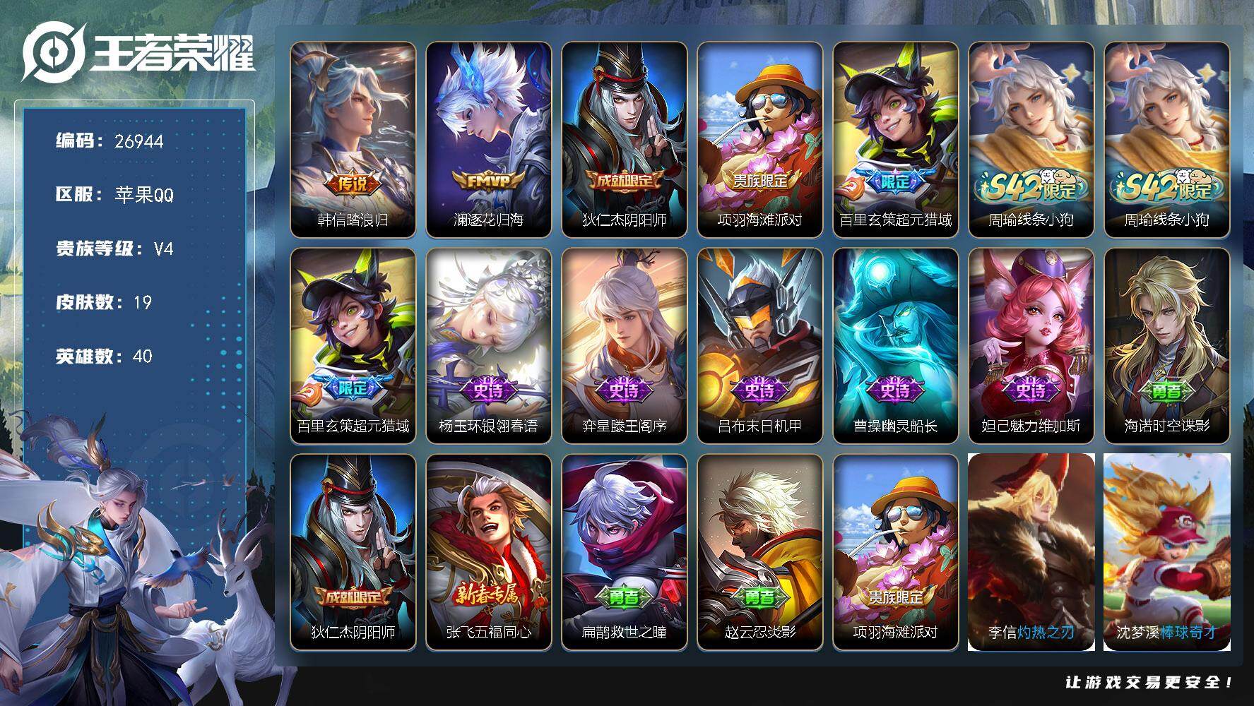 PX_2538432-【小国标狂铁】【金标老夫子,金标孙悟空,金标狄仁杰,金标蒙恬,金标鲁班七号,金标猪八戒,兔年限定全套,】贵族等级:,V10,英雄数:,129,皮肤数:,519,荣耀水晶:,武则天,星空梦想,活力突击,大秦宣太后,鸣剑·曳影,全息碎影,银白咏叹调,弑枪猎影,珍品传说:,江户川柯南,怪盗基德,朽木白哉,黑崎一护,星传说:,幻海之心,幽冥之眼,零号·雷霆,幽冥火,星际治安官,传说皮:,黄金狮子座,黄金射手座,冠军飞将,云鹰飞将,绛天战甲,黄金白羊座,久胜战神,炽阳神光,一念神魔,云霓雀翎,末日机甲-孙尚香,地狱火,仲夏夜之梦,音你心动-小乔,零号·赤焰,海洋之心,地狱之眼,飞鸢探春,音你心动-周瑜,胖达荣荣,李逍遥,乞巧织情,时之恋人-刘备,游龙清影,淬星耀世,超时空战士-狄仁杰,末日机甲-孙策,花朝如约,挚爱之约,挚爱花嫁,无双飞将,山海·炽霜斩,山海·琳琅生,山海·苍雷引,燃星之曲,澜逐花归海,艾琳觅芳踪,乘龙·铭钟鼎,典韦战鼓燎原,黄金天蝎座,幻光神枪,九山相柳,万灵伏威,神树通天,限定皮:,冰锋战神,李小龙,梁祝,御风骁将,时雨天司,龙胆,白鹤梁神女,烈魂,魔法小厨娘,辉光之辰,天魔缭乱,神威,永曜之星,时之彼端,飞衡,太华,天狼征服者,天狼狩猎者,冰霜恋舞曲,逐梦之星,神奇女侠,天狼绘梦者,凤求凰,美猴王,白虎志,青龙志,朱雀志,凤凰于飞,至尊宝,大圣娶亲,霸王别姬-项羽,霸王别姬-虞姬,高山流水,圣诞老人,孙行者,猪悟能,女儿国国王,寅虎·心曲,时之祈愿-瑶,百木心枪,玉兔公主,深海之息,枫霜尽,时之奇旅-妲己,五谷丰年,怒海麟威,山海·玄木吟,冰霜神祇,山海·碧波行,齐天大圣,夏侯惇霜北刀,鸣野蒿,逐霄战戟