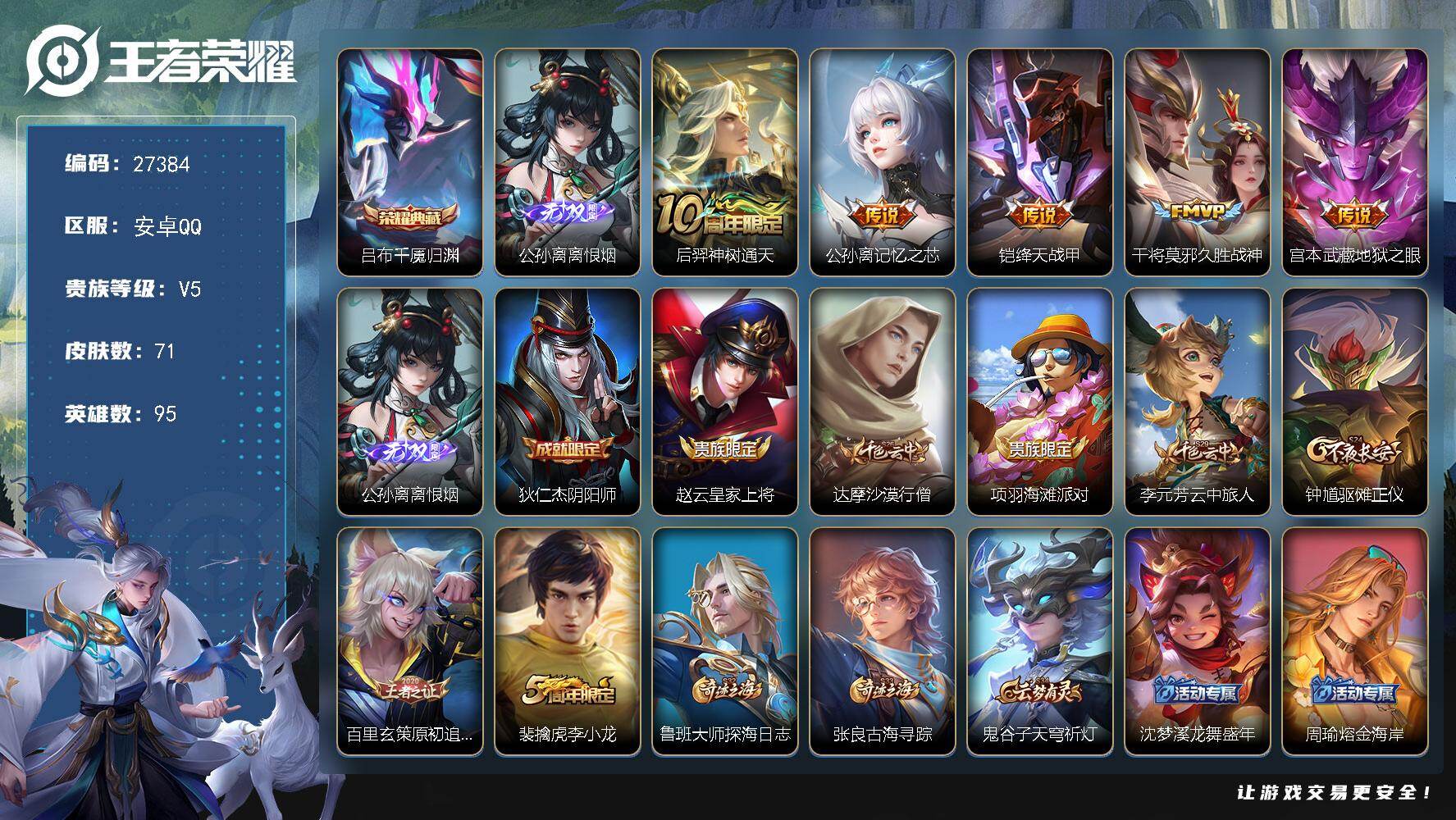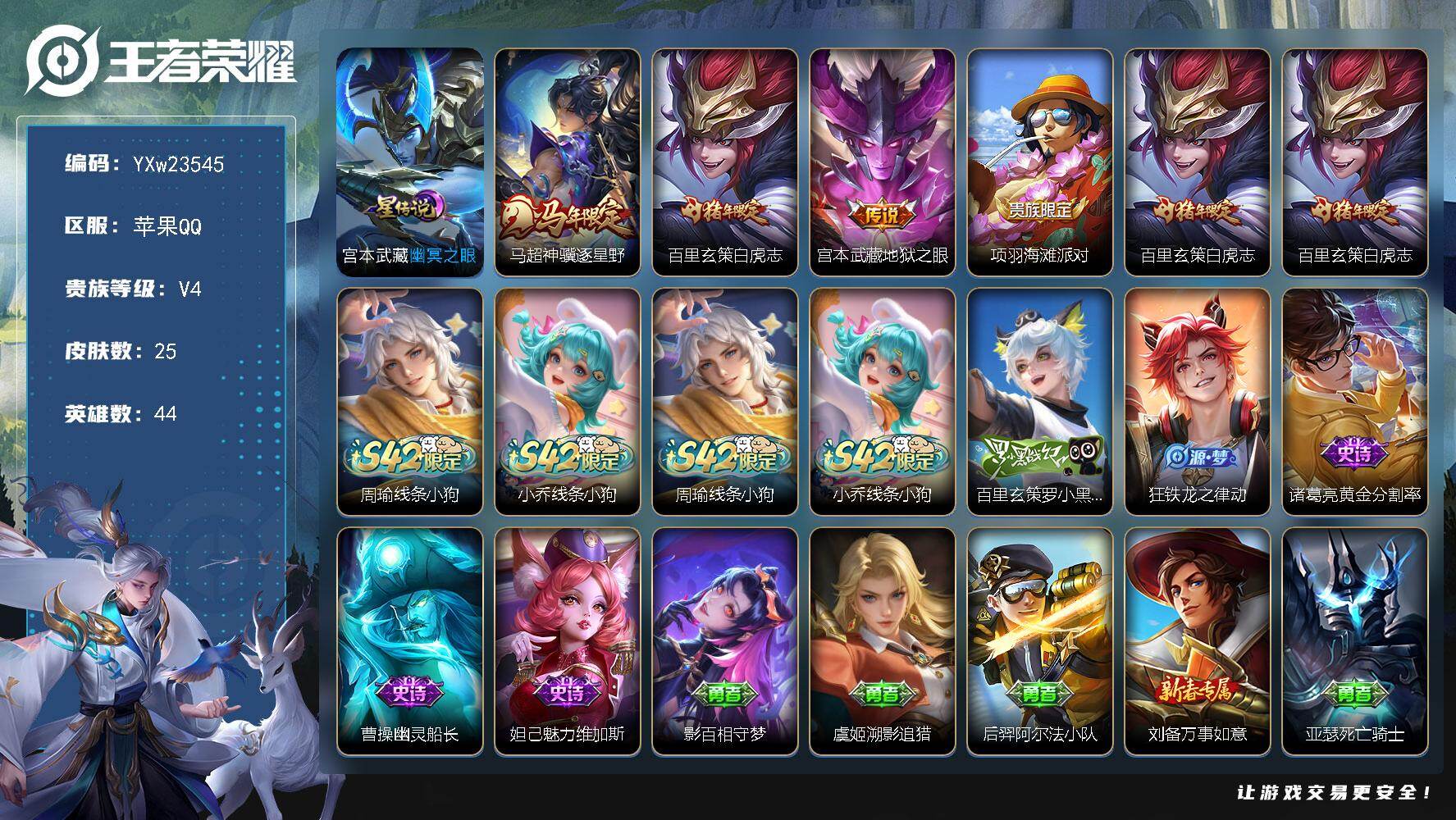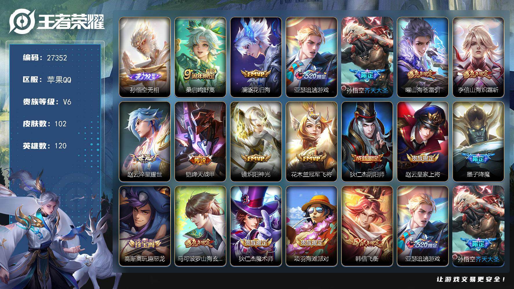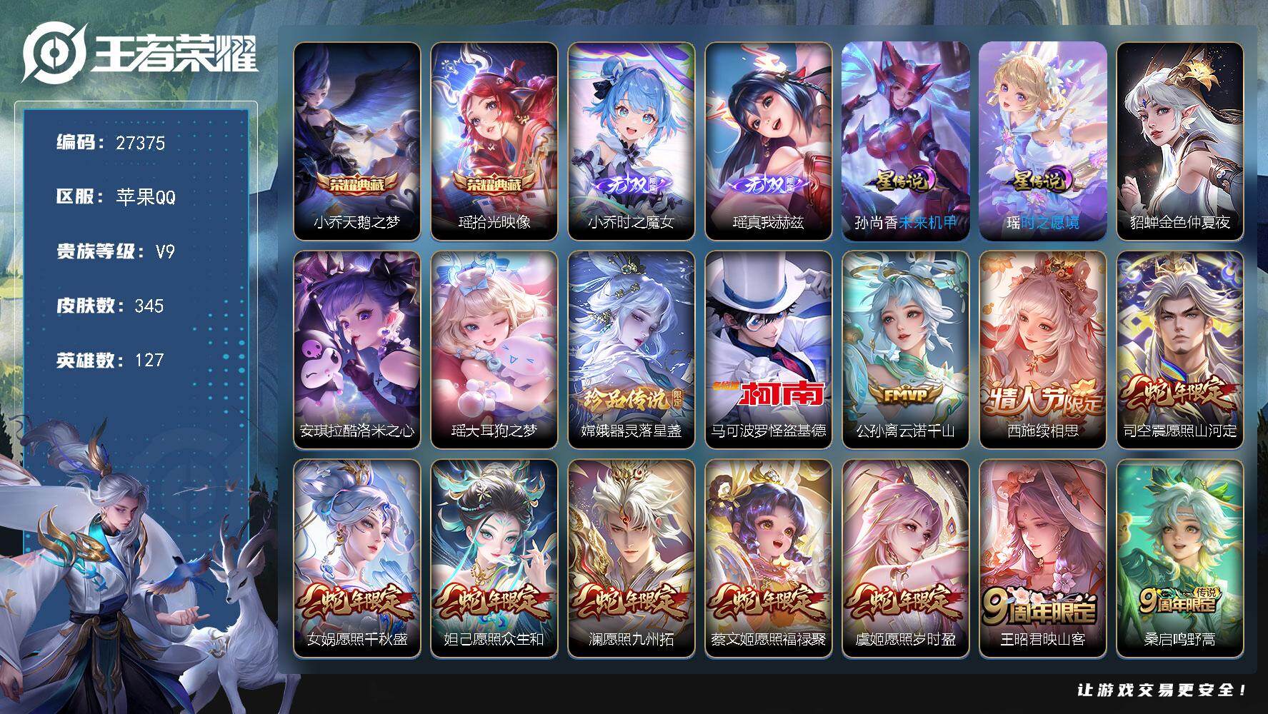 PX_2529677-可换绑【V9极品女号·瑶大乔西施嫦娥全皮·金标瑶·游走44段·蛇年全套·2无双·2典藏·4珍品怪盗基德·朵莉亚心动日记·永恒水手月亮·孙尚香安琪拉大乔龙限·小乔兔限·祈雪灵祝·玉兔公主·3星元紫瑶·贵族积分12万】19按键,2天幕,3星传说,15王者印记,150五级铭文,无二次苹果Q-V9-345皮肤-2典藏皮肤-2无双-4珍品传说-32传说-105史诗【英雄全皮】:大乔全皮,瑶全皮,嫦娥全皮,西施全皮,司空震全皮,戈娅全皮,海诺全皮【荣耀典藏】:小乔天鹅之梦,瑶拾光映像【无双皮肤】:小乔时之魔女,瑶真我赫兹【珍品传说】:安琪拉酷洛米之心,瑶大耳狗之梦,嫦娥器灵落星盏,马可波罗怪盗基德【星元皮肤】:孙尚香未来机甲,貂蝉金色仲夏夜,瑶时之愿境【天幕】:路在脚下天幕,金虎啸春天幕【传说皮肤】:公孙离云诺千山,西施续相思,司空震愿照山河定,女娲愿照千秋盛,妲己愿照众生和,澜愿照九州拓,蔡文姬愿照福禄聚,虞姬愿照岁时盈,王昭君映山客,桑启鸣野蒿,朵莉亚心动手记,貂蝉曦玄引,孙尚香乘龙问璇玑,露娜霜月吟,孙膑小动物乐团,王昭君永恒水手月亮,大乔时之奇旅,安琪拉追逃游戏,公孙离记忆之芯,小乔山海琳琅生,大乔挚爱花嫁,蔡文姬花朝如约,瑶时之祈愿,王昭君乞巧织情,西施游龙清影,小乔音你心动,公孙离祈雪灵祝,镜炽阳神光,虞姬启明星使,花木兰冠军飞将,后羿黄金射手座,貂蝉仲夏夜之梦【限定皮肤】:蒙犽顽岩魄,蔡文姬夏日便利店,大乔绒语心约,虞姬夏日便利店,姜子牙天穹之誓,杨戬破阵退雄兵,狄仁杰阴阳师,小乔山海琳琅生,赵云皇家上将,墨子神迹守卫,妲己热情桑巴,妲己时之奇旅,孙尚香蔷薇恋人,鲁班七号狮舞东方,庄周高山流水,高渐离玩趣恶龙,扁鹊奇幻香踪,白起夜都怪侠,芈月幻夜卜梦,周瑜赤莲之焰,元歌无心,甄姬幽恒,狄仁杰魔术师,狄仁杰万华元夜,达摩沙漠行僧,项羽海滩派对,老夫子航海奇遇记,关羽冰锋战神,貂蝉逐梦之音,安琪拉魔法小厨娘,安琪拉追逃游戏,程咬金演武夺筹,王昭君午后时光,兰陵王金庭之子,孙悟空至尊宝,李元芳匿光侦查者,李元芳云中旅人,虞姬霸王别姬,虞姬启明星使,钟馗驱傩正仪,杨玉环寅虎心曲,杨戬潮玩骑兵,女娲朔望之晖,雅典娜黎明之约,鬼谷子原初探秘者,鬼谷子五谷丰年,大乔白鹤梁神女,大乔挚爱花嫁,大乔时之奇旅,黄忠火炮绅士,苏烈千军破阵,百里玄策原初追逐者,梦奇顽趣,公孙离祈雪灵祝,公孙离玉兔公主,沈梦溪大漠名商,明世隐吟游魔法,裴擒虎擒涛扼浪,狂铁电玩高手,瑶时之祈愿,瑶山海碧波行,云中君纤云弄巧,上官婉儿梁祝,上官婉儿神器万象笔,嫦娥如梦令,嫦娥拒霜思,嫦娥暖冬兔眠,西施玲珑珍味,西施至美乘鲤谣,鲁班大师探海日志,桑启海盐诗旅,暃星界游侠,戈娅驭风魔法,艾琳女武神,艾琳流音漫舞,司空震地狱燃心,阿古朵江河有灵,张良古海寻踪,王昭君永恒水手月亮,蒙犽百解令,蒙恬荣光圣徽,高渐离燃音魔法,妲己灵卜魔法,鬼谷子天穹祈灯,伽罗琥珀纪元,小乔时之魔女,大乔乘龙忆丹青,安琪拉乘龙聚宝船,孙尚香乘龙问璇玑,貂蝉曦玄引,沈梦溪龙舞盛年,鲁班七号蔬乡物语,李元芳蔬乡物语,刘邦剑破天穹,程咬金群星魔术团,镜青焰无极,项羽苍威无极,朵莉亚心动手记,海诺心动手记,刘备异域游侠,芈月浮光幕影,周瑜熔金海岸【年限皮肤】:甄姬幽恒,公孙离祈雪灵祝,杨玉环寅虎心曲,小乔山海琳琅生,瑶山海碧波行,孙尚香乘龙问璇玑,大乔乘龙忆丹青,安琪拉乘龙聚宝船,司空震愿照山河定,女娲愿照千秋盛,妲己愿照众生和,澜愿照九州拓,蔡文姬愿照福禄聚,虞姬愿照岁时盈【赛季限定】:鬼谷子原初探秘者,狄仁杰万华元夜,程咬金演武夺筹,钟馗驱傩正仪,苏烈千军破阵,达摩沙漠行僧,兰陵王金庭之子,沈梦溪大漠名商,李元芳云中旅人,桑启海盐诗旅,裴擒虎擒涛扼浪,鲁班大师探海日志,张良古海寻踪,鬼谷子天穹祈灯,刘邦剑破天穹,姜子牙天穹之誓,东皇太一噬灭天穹,太乙真人谧流熔炉,钟馗虚灵犬护,甄姬逆浪荇歌,百里玄策原初追逐者,雅典娜黎明之约,梦奇顽趣,蒙恬荣光圣徽,牛魔星界战将【战令限定】:女娲朔望之晖,鲁班七号狮舞东方,周瑜赤莲之焰,老夫子航海奇遇记,墨子神迹守卫,黄忠火炮绅士,芈月幻夜卜梦,明世隐吟游魔法,白起夜都怪侠,狂铁电玩高手,王昭君午后时光,暃星界游侠,嫦娥暖冬兔眠,扁鹊奇幻香踪,杨戬潮玩骑兵,戈娅驭风魔法,西施玲珑珍味,司空震地狱燃心,艾琳流音漫舞,高渐离燃音魔法,妲己灵卜魔法,鲁班七号蔬乡物语,李元芳蔬乡物语,镜青焰无极,项羽苍威无极,蔡文姬夏日便利店,虞姬夏日便利店【史诗皮肤】:公孙离涂山容容,西施织梦人,朵莉亚幻珠鲛人,黄忠百相守梦,亚瑟布丁狗之誓,狂铁龙之律动,阿轲化蝶舞,赵怀真器灵浮梦炉,牛魔星界战将,艾琳陌上桑,大司命东方月初,少司缘涂山红红,蒙犽顽岩魄,蔡文姬夏日便利店,芈月浮光幕影,海诺心动手记,镜青焰无极,鲁班七号蔬乡物语,大乔乘龙忆丹青,安琪拉乘龙聚宝船,伽罗琥珀纪元,蒙恬荣光圣徽,高渐离燃音魔法,妲己灵卜魔法,蒙犽百解令,西施至美乘鲤谣,阿古朵江河有灵,司空震地狱燃心,李元芳匿光侦查者,戈娅驭风魔法,刘禅电玩爆裂旋风,扁鹊奇幻香踪,瑶山海碧波行,暃星界游侠,梦奇顽趣,元歌无心,上官婉儿神器万象笔,鬼谷子五谷丰年,妲己时之奇旅,狂铁电玩高手,貂蝉唤灵魅影,明世隐吟游魔法,公孙离玉兔公主,杨玉