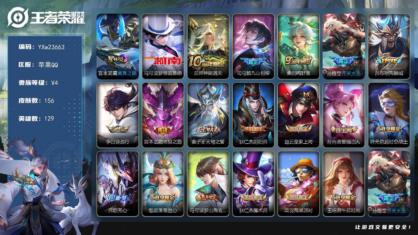 PX_2556995-??价比·基德·幽冥之眼·九山相柳·怒海麟威·齐天大圣·诗剑行·无二次包过】YXw23663-苹果Q-129英雄-156皮肤-5王者印记-146铭文-贵族积分1w【贵族4】【1珍品·1星传说·7传说·5按键·200幸运值】【因赛季更新游戏段付以上号为准!】 【英雄全皮】:司马懿全皮,孙权全皮,敖隐全皮,影全皮 【珍品传说】:马可波罗怪盗基德 【星元皮肤】:宫本武藏幽冥之眼 【传说皮肤】:后羿神树通天,司马懿九山相柳,桑启鸣野蒿,孙悟空齐天大圣,吕布怒海麟威,李白诗剑行,宫本武藏地狱之眼 【限定皮肤】:姜子牙天穹之誓,狄仁杰阴阳师,赵云皇家上将,孙尚香蔷薇恋人,钟无艳超时空战士,元歌无心,甄姬落雪兰心,马可波罗山海玄木吟,狄仁杰魔术师,项羽海滩派对,王昭君午后时光,孙悟空齐天大圣,李元芳云中旅人,干将莫邪胡桃夹子,鬼谷子五谷丰年,沈梦溪大漠名商,裴擒虎李小龙,裴擒虎擒涛扼浪,狂铁电玩高手,嫦娥暖冬兔眠,鲁班大师探海日志,桑启海盐诗旅,暃星界游侠,张良古海寻踪,鬼谷子天穹祈灯,沈梦溪龙舞盛年,刘邦剑破天穹,程咬金群星魔术团,周瑜熔金海岸 【年限皮肤】:马可波罗山海玄木吟 【赛季限定】:沈梦溪大漠名商,李元芳云中旅人,桑启海盐诗旅,裴擒虎擒涛扼浪,鲁班大师探海日志,张良古海寻踪,鬼谷子天穹祈灯,刘邦剑破天穹,姜子牙天穹之誓,东皇太一噬灭天穹,太乙真人谧流熔炉,钟馗虚灵犬护,甄姬逆浪荇歌,亚瑟荣光之誓,牛魔星界战将 【战令限定】:狂铁电玩高手,王昭君午后时光,钟无艳超时空战士,甄姬落雪兰心,暃星界游侠,嫦娥暖冬兔眠,莱西奥光弋星穹,明世隐往忆晖光,周瑜线条小狗 【史诗皮肤】:周瑜线条小狗,百里玄策罗小黑战记,莱西奥光弋星穹,公孙离涂山容容,黄忠百相守梦,狂铁龙之律动,阿轲化蝶舞,牛魔星界战将,马可波罗山海玄木吟,暃星界游侠,元歌无心,鬼谷子五谷丰年,钟无艳超时空战士,狂铁电玩高手,司马懿暗渊魔法,杨戬天秀启明,裴擒虎李小龙,橘右京修罗,狄仁杰鹰眼统帅,白起星夜王子,程咬金功夫厨神,李元芳逐浪之夏,蔡文姬舞动绿茵,百里守约特工魅影,雅典娜冰冠公主,兰陵王暗隐猎兽者,夏侯惇乘风破浪,刘邦德古拉伯爵,花木兰水晶猎龙者,张飞乱世虎臣,吕布末日机甲,曹操幽灵船长,墨子金属风暴,孙尚香水果甜心,孙尚香蔷薇恋人,宫本武藏鬼剑武藏,狄仁杰魔术师,王昭君偶像歌手,甄姬冰雪圆舞曲,貂蝉圣诞恋歌,赵云未来纪元,赵云皇家上将 【其他皮肤】:影百相守梦,兰陵王雾影缉谜,鲁班七号班班快跑,虞姬溯影追猎,蚩奼极光幻客,曹操逐霄之志,艾琳鹤鸣心笺,孙权径山谋武,明世隐往忆晖光,亚瑟荣光之誓,鬼谷子克喵,莱西奥踏浪烽翎,甄姬逆浪荇歌,白起死霸装,露娜命运加冕,张良灵野札记,钟馗虚灵犬护,姜子牙星梦巡礼,西施雪境奇遇,影魅影绮裳,典韦铁骨偃魂,太乙真人谧流熔炉,苍苍林狼骑,干将莫邪雾都夜雨,东皇太一噬灭天穹,盘古敬我三分,周瑜熔金海岸,姜子牙天穹之誓,大司命暗都幽影,程咬金群星魔术团,盘古经纬探寻者,刘邦剑破天穹,沈梦溪龙舞盛年,廉颇功夫炙烤,海诺时空谍影,鬼谷子天穹祈灯,亚连破局者,张良古海寻踪,鲁班大师探海日志,莱西奥西部游侠,太乙真人劲辣红锅,裴擒虎擒涛扼浪,赵怀真太极少年,白起乐园追猎者,猪八戒潮玩探月行,海月幻泉雾影,嫦娥暖冬兔眠,桑启海盐诗旅,李元芳云中旅人,甄姬落雪兰心,蒙恬蔚蓝守将,沈梦溪大漠名商,王昭君午后时光,刘禅唤灵魔甲,程咬金无双福将,干将莫邪胡桃夹子,鲁班大师乓乓大师,吕布野性能量,苏烈坚韧之力,诸葛亮掌控之力,孙尚香沉稳之力,老夫子功夫老勺,狂铁命运角斗场,王昭君幻想奇妙夜,钟无艳海滩丽影,关羽龙腾万里,刘备汉昭烈帝,刘备纽约教父,狄仁杰阴阳师,甄姬花好人间,张飞五福同心,花木兰兔女郎,典韦黄金武士,孙膑天使之翼,扁鹊化身博士,白起白色死神,赵云忍炎影,达摩大发明家,露娜哥特玫瑰,韩信街头霸王,韩信教廷特使,项羽海滩派对,司空震启蛰,澜孤猎,蒙恬秩序猎龙将,镜冰刃幻境,马超幸存者,曜归虚梦演,云中君荷鲁斯之眼,盘古创世神祝,猪八戒年年有余,上官婉儿修竹墨客,司马懿魇语军师,裴擒虎街头旋风,公孙离花间舞,女娲尼罗河女神,百里守约绝影神枪,鬼谷子阿摩司公爵,干将莫邪第七人偶,苍维京掠夺者,兰陵王隐刃,花木兰剑舞者,露娜绯红之刃,鲁班七号木偶奇遇记 【内测皮肤】:孙尚香蔷薇恋人,干将莫邪胡桃夹子