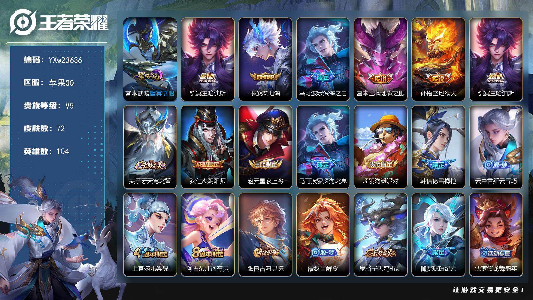 PX_2556994-??推荐·冥王哈迪斯·深海之息·梁祝·傲雪梅枪·逐花归海·琥珀纪元·可二次】YXw23636-苹果Q-104英雄-72皮肤-4王者印记-13铭文-贵族积分0w【贵族5】【1星传说·5传说·3按键】【因赛季更新游戏段付以上号为准!】 【星元皮肤】:宫本武藏幽冥之眼 【传说皮肤】:铠冥王哈迪斯,澜逐花归海,马可波罗深海之息,宫本武藏地狱之眼,孙悟空地狱火 【限定皮肤】:铠冥王哈迪斯,姜子牙天穹之誓,狄仁杰阴阳师,赵云皇家上将,马可波罗深海之息,项羽海滩派对,韩信傲雪梅枪,云中君纤云弄巧,上官婉儿梁祝,阿古朵江河有灵,张良古海寻踪,蒙犽百解令,鬼谷子天穹祈灯,伽罗琥珀纪元,沈梦溪龙舞盛年,刘邦剑破天穹 【赛季限定】:张良古海寻踪,鬼谷子天穹祈灯,刘邦剑破天穹,姜子牙天穹之誓,甄姬逆浪荇歌 【战令限定】:廉颇撼地雄心,周瑜线条小狗,小乔线条小狗 【史诗皮肤】:周瑜线条小狗,小乔线条小狗,廉颇撼地雄心,伽罗琥珀纪元,蒙犽百解令,阿古朵江河有灵,韩信傲雪梅枪,云中君纤云弄巧,上官婉儿梁祝,狄仁杰鹰眼统帅,孙策猫狗日记,白起星夜王子,刘禅天才门将,蔡文姬舞动绿茵,兰陵王暗隐猎兽者,曹操幽灵船长,吕布圣诞狂欢,墨子金属风暴,妲己魅力维加斯,嬴政摇滚巨星,孙尚香水果甜心,甄姬冰雪圆舞曲,赵云皇家上将 【其他皮肤】:影百相守梦,云中君云械蓝图,甄姬逆浪荇歌,盘古敬我三分,姜子牙天穹之誓,盘古经纬探寻者,刘邦剑破天穹,钟无艳春野之旅,沈梦溪龙舞盛年,鬼谷子天穹祈灯,程咬金暖冬絮语,后羿完美运算,曹操决胜大满贯,兰陵王幻夜行动,张良古海寻踪,李元芳妄想特派,鲁班大师乓乓大师,狂铁特工战影,王昭君幻想奇妙夜,关羽龙腾万里,刘备纽约教父,狄仁杰阴阳师,宫本武藏万象初新,刘备万事如意,张飞五福同心,亚瑟死亡骑士,典韦黄金武士,妲己少女阿狸,安琪拉玩偶对对碰,宫本武藏未来纪元,扁鹊救世之瞳,芈月红桃皇后,赵云忍炎影,赵云白执事,露娜哥特玫瑰,韩信教廷特使,项羽海滩派对,百里守约绝影神枪,铠龙域领主,太乙真人圆桌骑士,马可波罗激情绿茵,孙悟空西部大镖客,高渐离金属狂潮 【内测皮肤】:狂铁特工战影