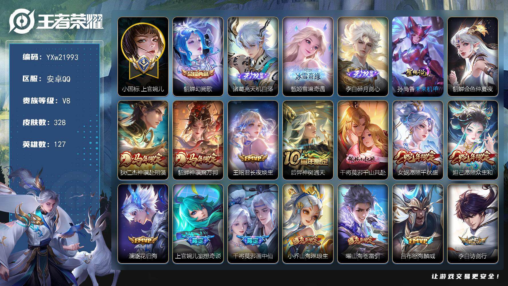 PX_2549444-??战力号推荐·秋月华灯天幕·中路57段·1w小国上官婉儿·1w金标女娲·1w金标干将莫邪·1w金标周瑜,1.1w战不知火舞·1w镜·幻阙歌·天机白泽·雪境奇遇·碎月剑心·金色仲夏夜·李逍遥·白虎志·诗剑行·异界灵契·神骥赴朔漠·神骥聚万邦·愿照千秋盛·愿照众生和·画中仙·山海琳琅生·山海苍雷引·妄想奇谈·补天·可二次】YXw21993-安卓Q-127英雄-328皮肤-20王者印记-300铭文-贵族积分9w【贵族8】【1典藏·3无双·2星传说·33传说·2天幕·26按键·239幸运值】【因赛季更新游戏段付以上号为准!】 【英雄全皮】:女娲全皮,鬼谷子全皮,上官婉儿全皮,敖隐全皮 【荣耀典藏】:貂蝉幻阙歌 【无双皮肤】:诸葛亮天机白泽,甄姬雪境奇遇,李白碎月剑心 【小国标】:小国标上官婉儿 【星元皮肤】:貂蝉金色仲夏夜,孙尚香未来机甲 【天幕】:共赏芳华天幕,秋月华灯天幕 【传说皮肤】:狄仁杰神骥赴朔漠,貂蝉神骥聚万邦,王昭君长夜焕生,后羿神树通天,干将莫邪千山共赴,女娲愿照千秋盛,妲己愿照众生和,澜逐花归海,上官婉儿妄想奇谈,干将莫邪画中仙,小乔山海琳琅生,曜山海苍雷引,吕布怒海麟威,李白诗剑行,女娲补天,孙尚香异界灵契,貂蝉遇见胡旋,王昭君乞巧织情,曜李逍遥,,李元芳飞鸢探春,公孙离祈雪灵祝,镜炽阳神光,虞姬启明星使,曜云鹰飞将,李信一念神魔,刘备时之恋人,张良黄金白羊座,干将莫邪久胜战神,百里玄策白虎志,梦奇胖达荣荣,后羿黄金射手座,貂蝉仲夏夜之梦,孙尚香末日机甲 【限定皮肤】:姜子牙天穹之誓,狄仁杰阴阳师,小乔山海琳琅生,赵云皇家上将,墨子神迹守卫,孙尚香异界灵契,庄周高山流水,高渐离玩趣恶龙,芈月幻夜卜梦,元歌云间偶戏,元歌无心,马可波罗山海玄木吟,狄仁杰魔术师,狄仁杰万华元夜,达摩星际陆战队,达摩沙漠行僧,项羽海滩派对,老夫子航海奇遇记,貂蝉遇见胡旋,程咬金演武夺筹,露娜一生所爱,兰陵王金庭之子,亚瑟潮玩骑士王,孙悟空孙行者,后羿圣弓游侠,李元芳云中旅人,虞姬启明星使,钟馗驱傩正仪,女娲朔望之晖,女娲补天,干将莫邪冰霜恋舞曲,干将莫邪真爱魔法,干将莫邪画中仙,雅典娜黎明之约,太乙真人华丽摇滚,鬼谷子原初探秘者,鬼谷子五谷丰年,黄忠火炮绅士,苏烈千军破阵,百里玄策白虎志,百里玄策原初追逐者,百里守约朱雀志,梦奇顽趣,公孙离蜜橘之夏,公孙离祈雪灵祝,公孙离玉兔公主,沈梦溪大漠名商,裴擒虎李小龙,裴擒虎擒涛扼浪,米莱狄胡桃异想国,瑶山海碧波行,云中君纤云弄巧,云中君时之祈愿,上官婉儿梁祝,上官婉儿天狼绘梦者,上官婉儿神器万象笔,上官婉儿妄想奇谈,嫦娥拒霜思,嫦娥暖冬兔眠,曜李逍遥,,曜山海苍雷引,西施玲珑珍味,西施至美乘鲤谣,鲁班大师探海日志,镜匿光追影者,桑启海盐诗旅,暃星界游侠,艾琳女武神,艾琳流音漫舞,司空震地狱燃心,阿古朵江河有灵,张良古海寻踪,蒙犽百解令,蒙恬荣光圣徽,高渐离燃音魔法,鬼谷子天穹祈灯,李白碎月剑心,伽罗琥珀纪元,沈梦溪龙舞盛年,鲁班七号蔬乡物语,李元芳蔬乡物语,刘邦剑破天穹,上官婉儿群星魔术团 【年限皮肤】:百里玄策白虎志,百里守约朱雀志,公孙离祈雪灵祝,小乔山海琳琅生,曜山海苍雷引,瑶山海碧波行,马可波罗山海玄木吟,女娲愿照千秋盛,妲己愿照众生和 【赛季限定】:鬼谷子原初探秘者,狄仁杰万华元夜,程咬金演武夺筹,钟馗驱傩正仪,苏烈千军破阵,达摩沙漠行僧,兰陵王金庭之子,沈梦溪大漠名商,李元芳云中旅人,桑启海盐诗旅,裴擒虎擒涛扼浪,鲁班大师探海日志,张良古海寻踪,鬼谷子天穹祈灯,刘邦剑破天穹,姜子牙天穹之誓,东皇太一噬灭天穹,太乙真人谧流熔炉,甄姬逆浪荇歌,亚瑟荣光之誓,百里玄策原初追逐者,雅典娜黎明之约,梦奇顽趣,蒙恬荣光圣徽,牛魔星界战将,项羽九幽镇关 【战令限定】:女娲朔望之晖,元歌云间偶戏,亚瑟潮玩骑士王,米莱狄胡桃异想国,达摩星际陆战队,老夫子航海奇遇记,墨子神迹守卫,干将莫邪真爱魔法,后羿圣弓游侠,黄忠火炮绅士,芈月幻夜卜梦,暃星界游侠,嫦娥暖冬兔眠,西施玲珑珍味,司空震地狱燃心,艾琳流音漫舞,高渐离燃音魔法,鲁班七号蔬乡物语,李元芳蔬乡物语,孙膑茶境仙,马超访茗客,刘禅鸭鸭历险记,沈梦溪鸭鸭历险记,周瑜百相守梦,孙策百相守梦,周瑜线条小狗,小乔线条小狗 【史诗皮肤】:上官婉儿春霖将至,太乙真人瓦猫非猫,明世隐百晓客,周瑜线条小狗,小乔线条小狗,项羽九幽镇关,女娲万灵启世,公孙离涂山容容,弈星守夜人,西施织梦人,黄忠百相守梦,周瑜百相守梦,狂铁龙之律动,刘禅鸭鸭历险记,阿轲化蝶舞,赵怀真器灵浮梦炉,弈星万物之道,孙膑茶境仙,牛魔星界战将,上官婉儿群星魔术团,鲁班七号蔬乡物语,伽罗琥珀纪元,蒙恬荣光圣徽,高渐离燃音魔法,周瑜雪夜绮愿,蒙犽百解令,西施至美乘鲤谣,阿古朵江河有灵,司空震地狱燃心,镜真我赫兹,镜玫瑰异探,瑶山海碧波行,马可波罗山海玄木吟,暃星界游侠,梦奇顽趣,元歌无心,上官婉儿神器万象笔,鬼谷子五谷丰年,澜赏金猎手,公孙离玉兔公主,云中君时之祈愿,雅典娜黎明之约,黄忠火炮绅士,镜匿光追影者,嫦娥拒霜思,司马懿暗渊魔法,庄周高山流水,孙悟空孙行者,安琪拉时之奇旅,钟馗乐园奇幻夜,沈梦溪月团寄思,干将莫邪真爱魔法,老夫子航海奇遇记,百里玄策热力回旋,米莱狄胡桃异想国,元歌云间偶戏,云中君纤云弄巧,裴擒虎李小龙,百里玄策