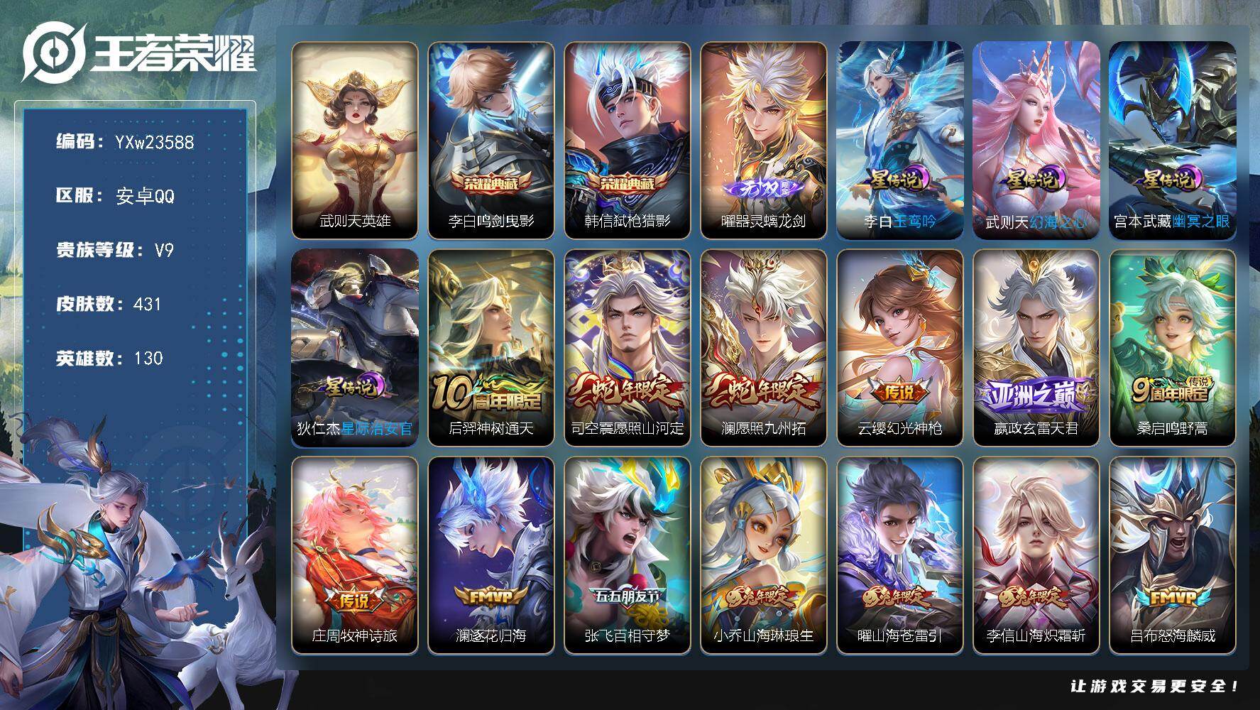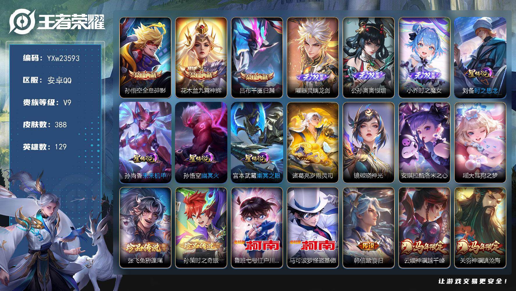 PX_2557122-??价比v9·46传说·满马年·岁雨灵司·破晓神光·时之魔女·离恨烟·器灵螭龙剑·怪盗基德·江户川柯南·大耳狗之梦·酷洛米之心·千魇归渊·马超琥珀纪元·浮生妄·深海之息·李逍遥·可二次】YXw23593-安卓Q-129英雄-388皮肤-28王者印记-300铭文-贵族积分14w【贵族9】【3典藏·3无双·6珍品·6星传说·46传说·25按键】【因赛季更新游戏段付以上号为准!】 【英雄全皮】:刘禅全皮,达摩全皮,孙权全皮,橘右京全皮,苍全皮,敖隐全皮,司空震全皮,戈娅全皮,空空儿全皮,影全皮 【荣耀典藏】:孙悟空全息碎影,花木兰九霄神辉,吕布千魇归渊 【无双皮肤】:曜器灵螭龙剑,公孙离离恨烟,小乔时之魔女 【珍品传说】:安琪拉酷洛米之心,瑶大耳狗之梦,张飞兔狲蓬尾,孙策时之奇旅,鲁班七号江户川柯南,马可波罗怪盗基德 【星元皮肤】:宫本武藏幽冥之眼,孙悟空幽冥火,孙尚香未来机甲,刘备时之思念,诸葛亮岁雨灵司,镜破晓神光 【传说皮肤】:韩信踏浪归,云缨神骥越千峰,关羽神骥镇沧海,朵莉亚神骥鸣幻洲,狄仁杰神骥赴朔漠,貂蝉神骥聚万邦,马超神骥逐星野,后羿神树通天,司马懿九山相柳,公孙离云诺千山,司空震愿照山河定,女娲愿照千秋盛,澜愿照九州拓,虞姬愿照岁时盈,云缨幻光神枪,裴擒虎祥瑞亨通,桑启鸣野蒿,典韦战鼓燎原,马超琥珀纪元,澜逐花归海,露娜霜月吟,夏洛特浮生妄,干将莫邪画中仙,李白诗剑行,橘右京枫霜尽,马可波罗深海之息,马超无双飞将,曜李逍遥,,诸葛亮时雨天司,镜炽阳神光,虞姬启明星使,曜云鹰飞将,李信一念神魔,刘备时之恋人,干将莫邪久胜战神,达摩黄金狮子座,百里玄策白虎志,花木兰冠军飞将,梦奇胖达荣荣,后羿黄金射手座,诸葛亮武陵仙君,李白凤求凰,孙尚香末日机甲,宫本武藏地狱之眼,孙悟空地狱火,吕布天魔缭乱 【限定皮肤】:公孙离离恨烟,姜子牙天穹之誓,狄仁杰阴阳师,赵云皇家上将,赵云引擎之心,嬴政优雅恋人,鲁班七号狮舞东方,庄周高山流水,高渐离玩趣恶龙,阿轲迷踪丽影,钟无艳王者之锤,扁鹊奇幻香踪,吕布天魔缭乱,周瑜赤莲之焰,元歌云间偶戏,元歌无心,夏侯惇朔风刀,甄姬游园惊梦,典韦蓝屏警告,马可波罗逐梦之星,马可波罗暗影游猎,马可波罗深海之息,狄仁杰魔术师,狄仁杰万华元夜,达摩星际陆战队,达摩沙漠行僧,项羽海滩派对,老夫子醍醐杖,关羽冰锋战神,程咬金演武夺筹,刘邦夺宝奇兵,韩信飞衡,韩信傲雪梅枪,兰陵王驯魔猎人,兰陵王金庭之子,橘右京枫霜尽,亚瑟潮玩骑士王,孙悟空至尊宝,牛魔御旌,后羿如梦令,李元芳银河之约,李元芳云中旅人,虞姬启明星使,钟馗神迹守卫,钟馗驱傩正仪,杨玉环遇见飞天,杨戬潮玩骑兵,干将莫邪画中仙,雅典娜单词大作战,雅典娜黎明之约,蔡文姬繁星吟游,鬼谷子原初探秘者,鬼谷子五谷丰年,诸葛亮武陵仙君,诸葛亮时雨天司,黄忠烈魂,苏烈千军破阵,百里玄策白虎志,百里玄策原初追逐者,百里守约朱雀志,弈星混沌棋,梦奇顽趣,沈梦溪星空之诺,沈梦溪大漠名商,明世隐疑决卦,裴擒虎李小龙,裴擒虎擒涛扼浪,米莱狄胡桃异想国,云中君纤云弄巧,云中君时之祈愿,盾山御銮,猪八戒西部大镖客,猪八戒猪悟能,上官婉儿梁祝,嫦娥暖冬兔眠,曜李逍遥,,西施玲珑珍味,蒙犽狂想玩偶喵,鲁班大师探海日志,桑启海盐诗旅,夏洛特浮生妄,暃星界游侠,戈娅驭风魔法,艾琳流音漫舞,司空震地狱燃心,阿古朵江河有灵,张良古海寻踪,蒙犽百解令,蒙恬荣光圣徽,高渐离燃音魔法,鬼谷子天穹祈灯,马超琥珀纪元,姬小满妄想食味,小乔时之魔女,沈梦溪龙舞盛年,鲁班七号蔬乡物语,李元芳蔬乡物语,刘邦剑破天穹,程咬金群星魔术团,周瑜熔金海岸 【年限皮肤】:李白凤求凰,百里玄策白虎志,百里守约朱雀志,韩信飞衡,诸葛亮时雨天司,司空震愿照山河定,女娲愿照千秋盛,澜愿照九州拓,虞姬愿照岁时盈 【赛季限定】:牛魔御旌,盾山御銮,夏侯惇朔风刀,弈星混沌棋,明世隐疑决卦,老夫子醍醐杖,鬼谷子原初探秘者,狄仁杰万华元夜,程咬金演武夺筹,钟馗驱傩正仪,苏烈千军破阵,达摩沙漠行僧,兰陵王金庭之子,沈梦溪大漠名商,李元芳云中旅人,桑启海盐诗旅,裴擒虎擒涛扼浪,鲁班大师探海日志,张良古海寻踪,鬼谷子天穹祈灯,刘邦剑破天穹,姜子牙天穹之誓,东皇太一噬灭天穹,太乙真人谧流熔炉,钟馗虚灵犬护,甄姬逆浪荇歌,亚瑟荣光之誓,百里玄策原初追逐者,雅典娜黎明之约,梦奇顽趣,蒙恬荣光圣徽,牛魔星界战将,项羽九幽镇关 【战令限定】:典韦蓝屏警告,鲁班七号狮舞东方,钟馗神迹守卫,兰陵王驯魔猎人,周瑜赤莲之焰,李元芳银河之约,沈梦溪星空之诺,阿轲迷踪丽影,刘邦夺宝奇兵,马可波罗暗影游猎,猪八戒西部大镖客,蒙犽狂想玩偶喵,雅典娜单词大作战,元歌云间偶戏,亚瑟潮玩骑士王,米莱狄胡桃异想国,达摩星际陆战队,暃星界游侠,嫦娥暖冬兔眠,扁鹊奇幻香踪,杨戬潮玩骑兵,戈娅驭风魔法,西施玲珑珍味,司空震地狱燃心,艾琳流音漫舞,高渐离燃音魔法,鲁班七号蔬乡物语,李元芳蔬乡物语,亚连破空之剑,廉颇撼地雄心,孙悟空神迹守卫,百里守约百相守梦,老夫子百相守梦,刘禅鸭鸭历险记,沈梦溪鸭鸭历险记,周瑜线条小狗,小乔线条小狗 【史诗皮肤】:达摩星君亢金,上官婉儿春霖将至,明世隐百晓客,周瑜线条小狗,小乔线条小狗,项羽九幽镇关,百里玄策罗小黑战记,公孙离涂山容容,西施织梦人,黄忠百相守梦,后羿石田雨龙,百里